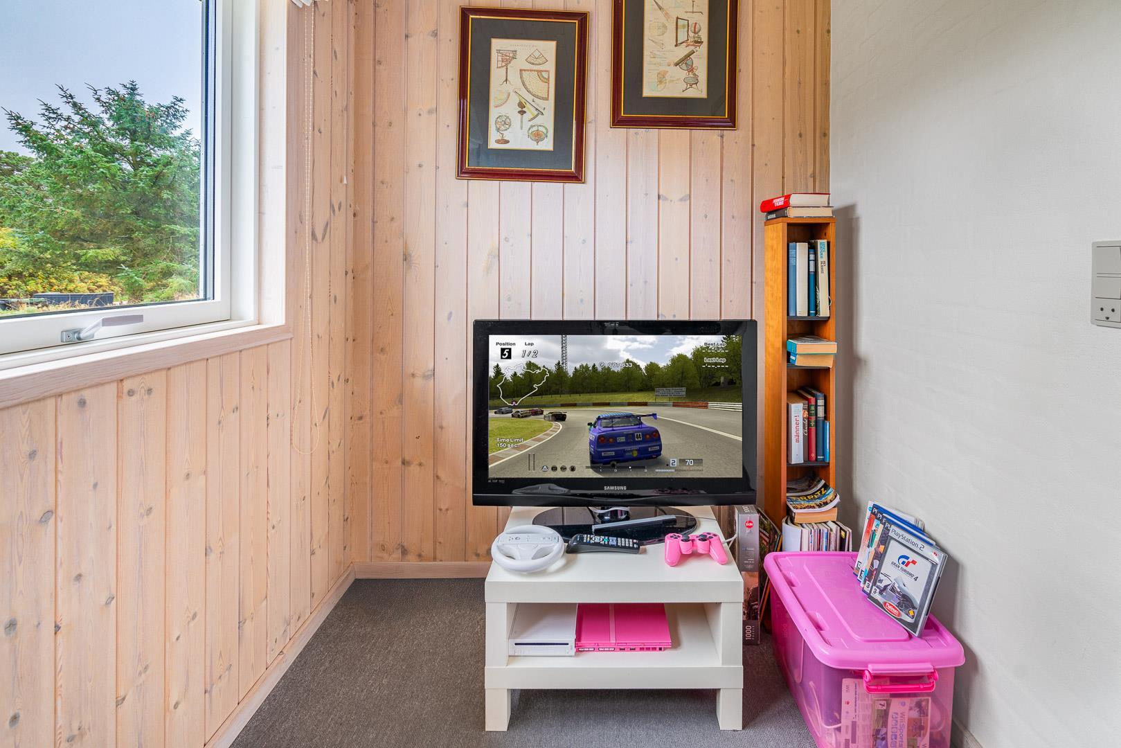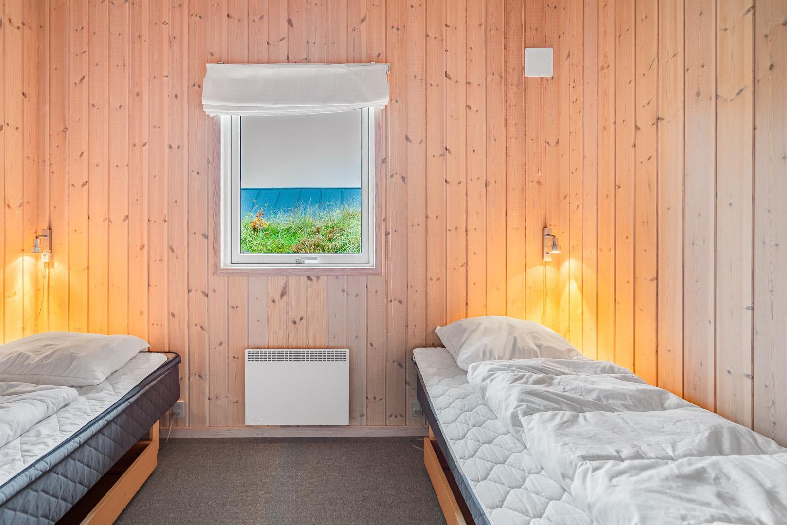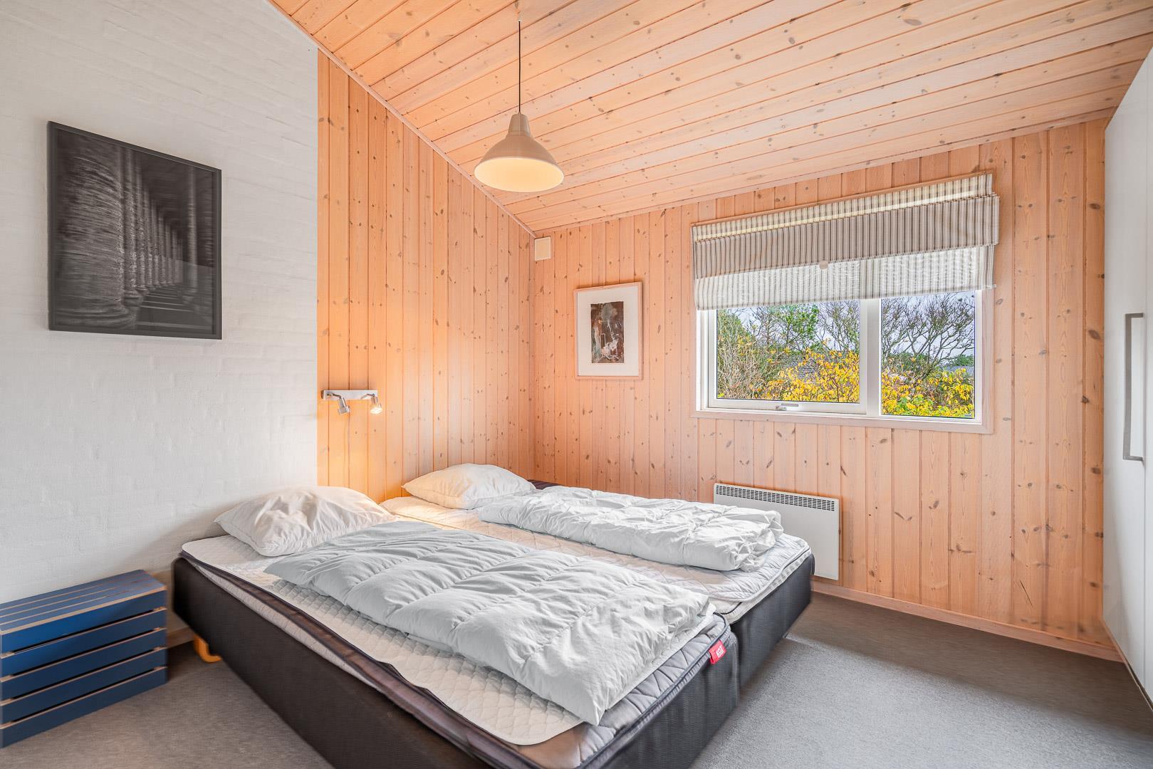 Sommerhuset rummer tre dejlige soveværelser: et værelse med en dobbeltseng (to madrasser), et værelse med en større dobbeltseng (to madrasser) og et værelse med to enkeltsenge. Her er plads til både afslapning og en god nattesøvn for alle.