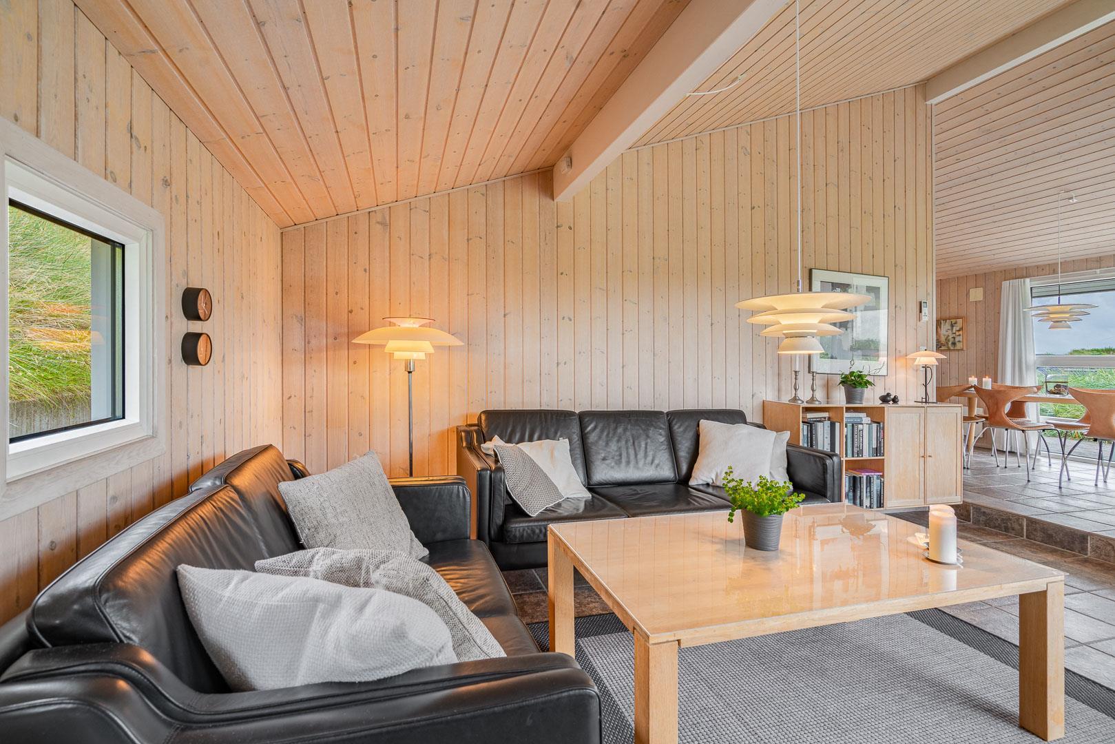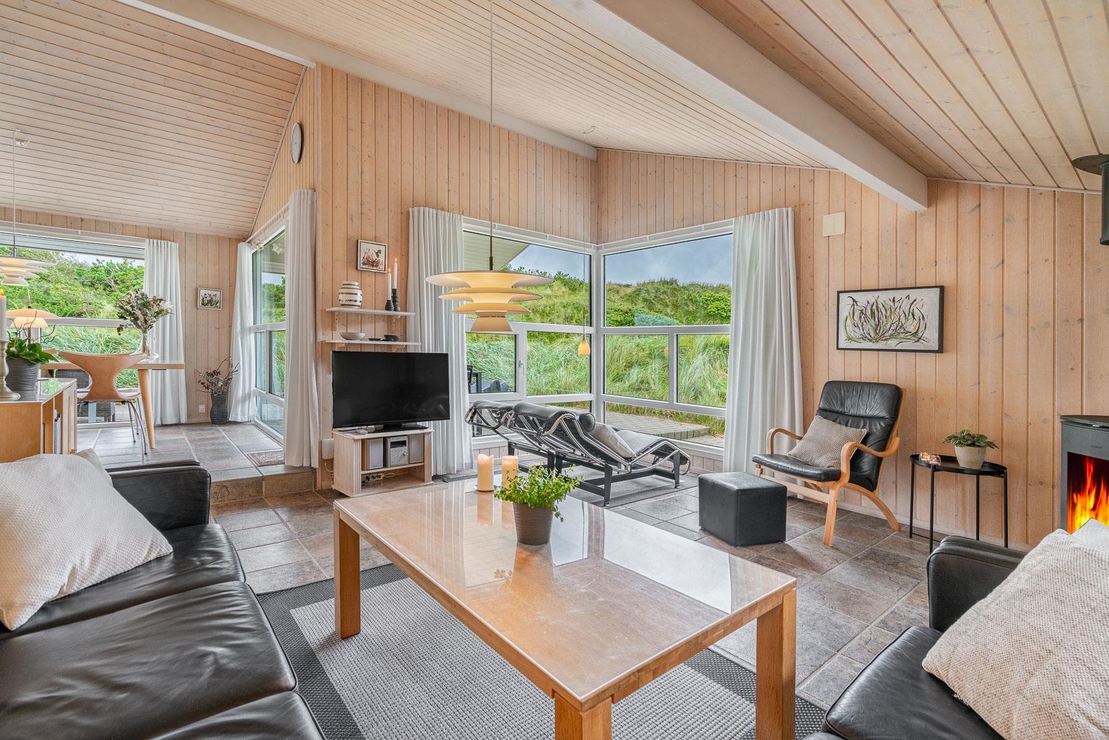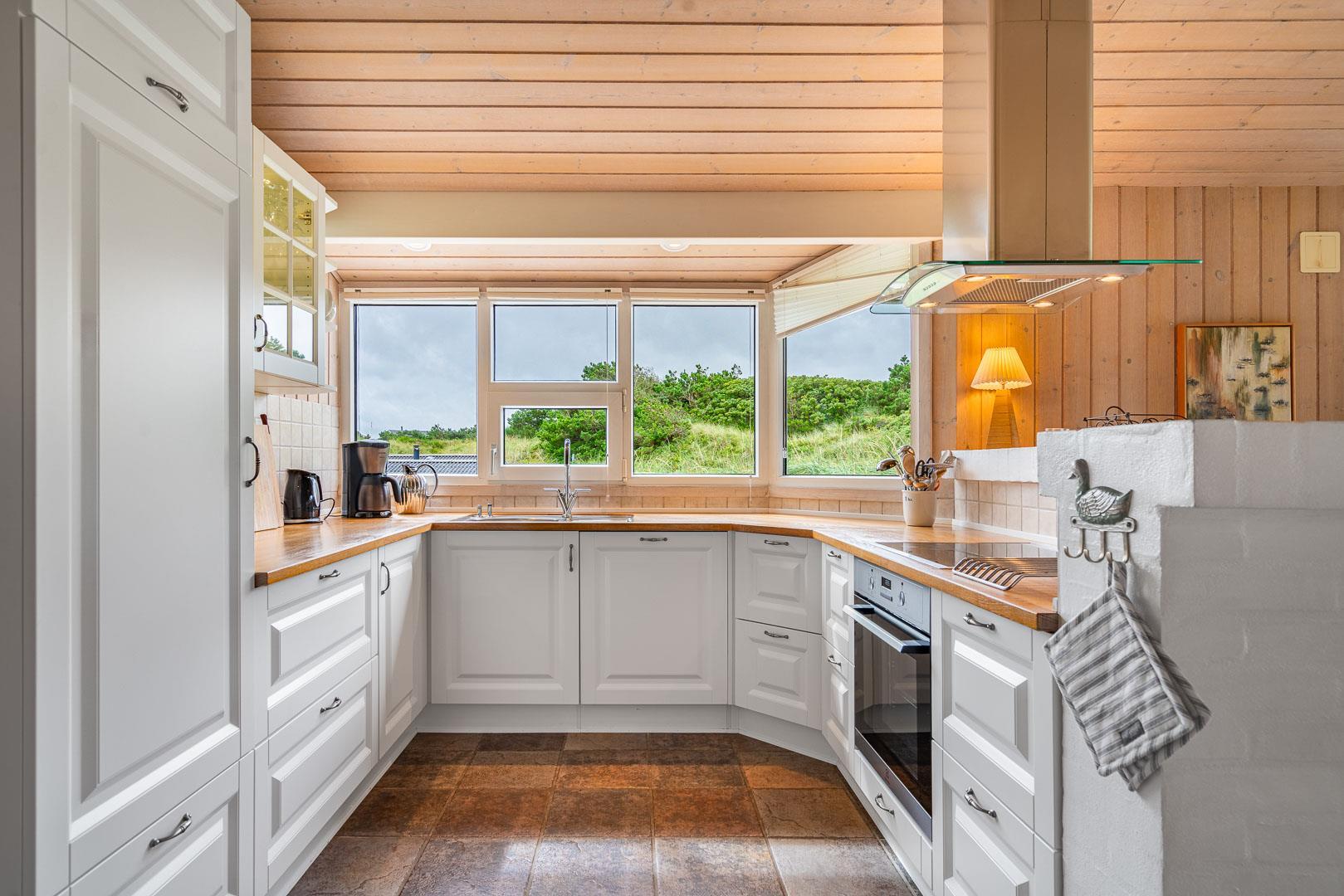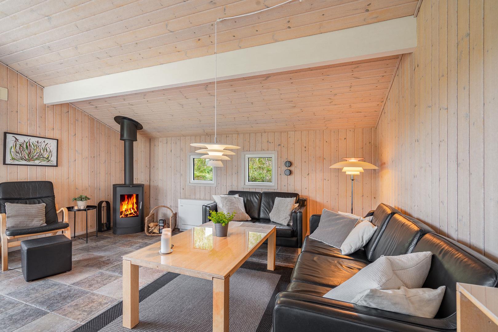 Når du kommer til feriehuset, bliver du mødt af marehalm, der vugger i vinden foran den hvide hoveddør. Huset, som er sortmalet i klassisk sommerhusstil, emmer af charme og varme. Indenfor er der kælet for detaljerne, og de store vinduer lader dagslyset strømme ind, mens de skaber en smuk forbindelse til den omkringliggende natur. Det åbne køkken-alrum danner husets hjerte, med en trinopdelt overgang til den hyggelige stue. Her kan du rigtig synke ned i sofaen og nyde synet af klitterne udenfor. En knitrende brændeovn sørger for ekstra hygge på kølige aftener, mens du nyder en god bog eller en film med resten af familien.