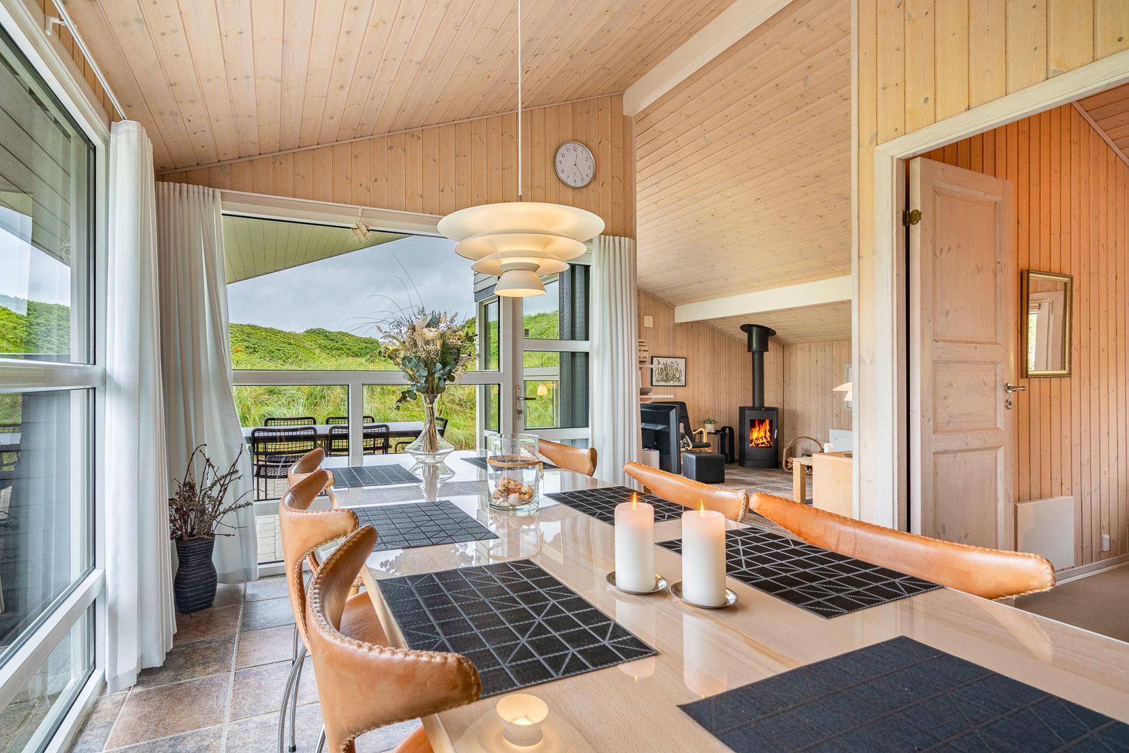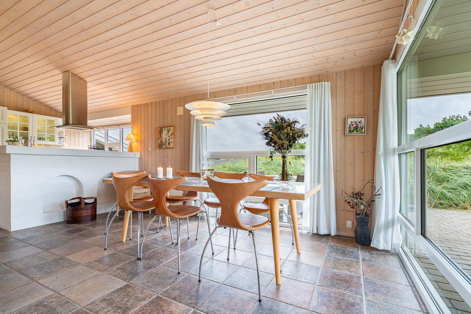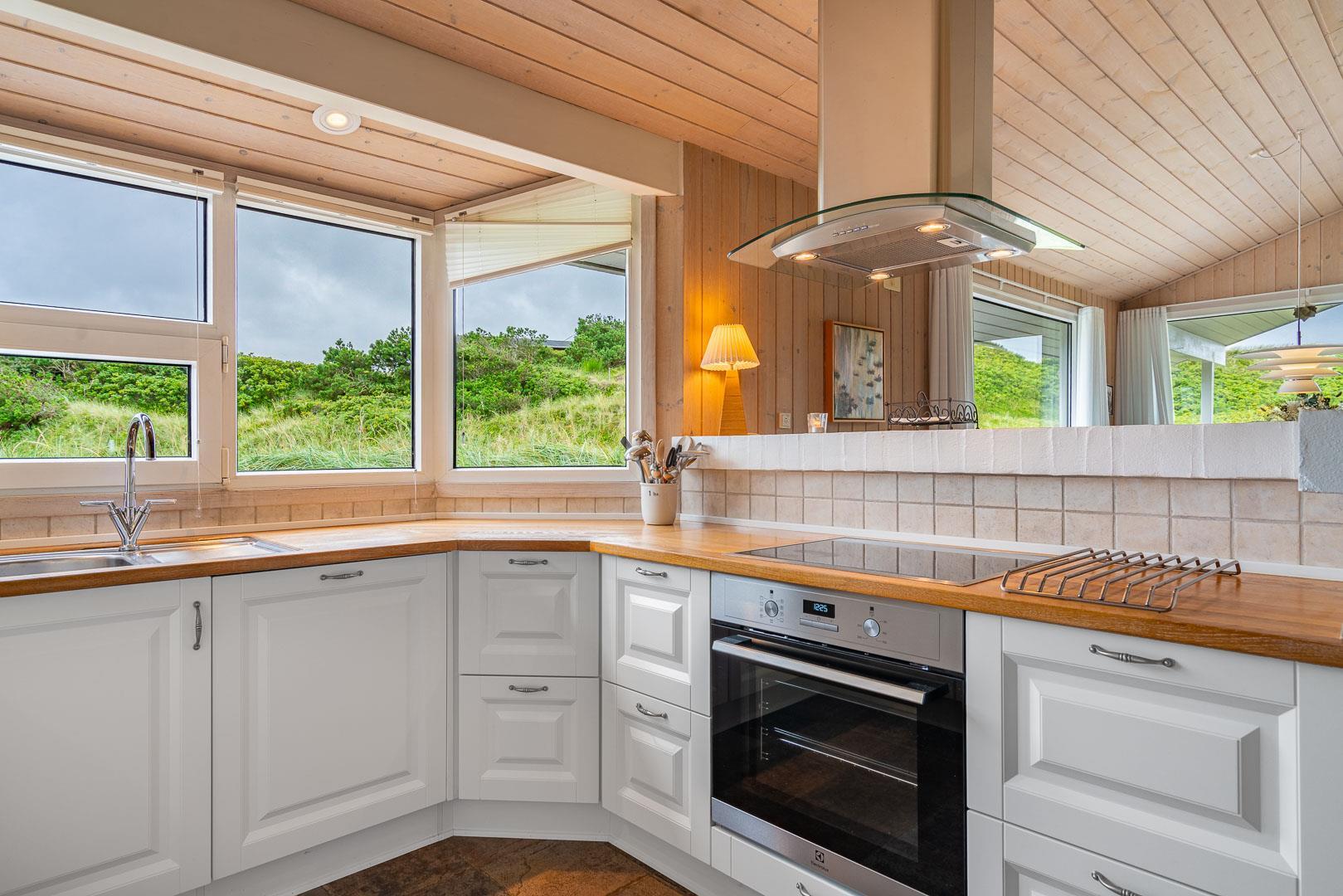 Når du kommer til feriehuset, bliver du mødt af marehalm, der vugger i vinden foran den hvide hoveddør. Huset, som er sortmalet i klassisk sommerhusstil, emmer af charme og varme. Indenfor er der kælet for detaljerne, og de store vinduer lader dagslyset strømme ind, mens de skaber en smuk forbindelse til den omkringliggende natur. Det åbne køkken-alrum danner husets hjerte, med en trinopdelt overgang til den hyggelige stue. Her kan du rigtig synke ned i sofaen og nyde synet af klitterne udenfor. En knitrende brændeovn sørger for ekstra hygge på kølige aftener, mens du nyder en god bog eller en film med resten af familien.