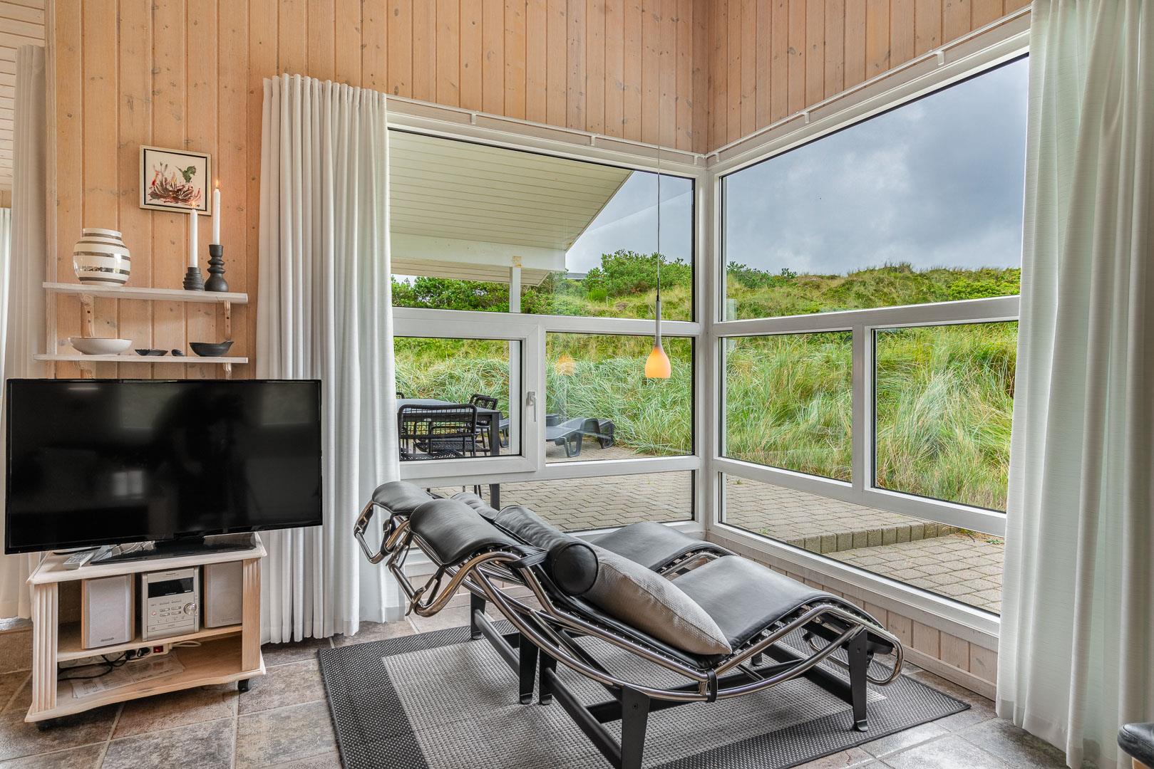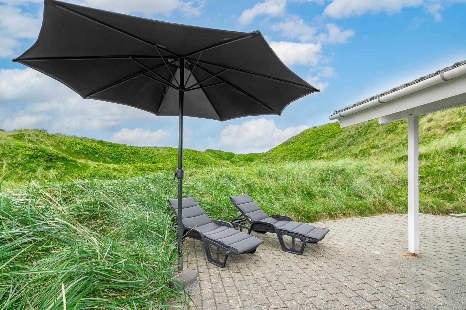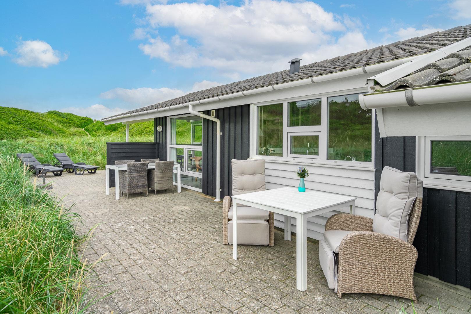 Sommerhuset ligger på en stor klitgrund på 1500 m2, let hævet, hvilket giver en fantastisk udsigt over det naturskønne område. På den delvist overdækkede terrasse kan du nyde morgenkaffen i dejlige havemøbler, mens du indånder den friske havluft og lytter til havets bølger. Det er et ideelt sted at slappe af, nyde solen og lade tankerne flyde frit.