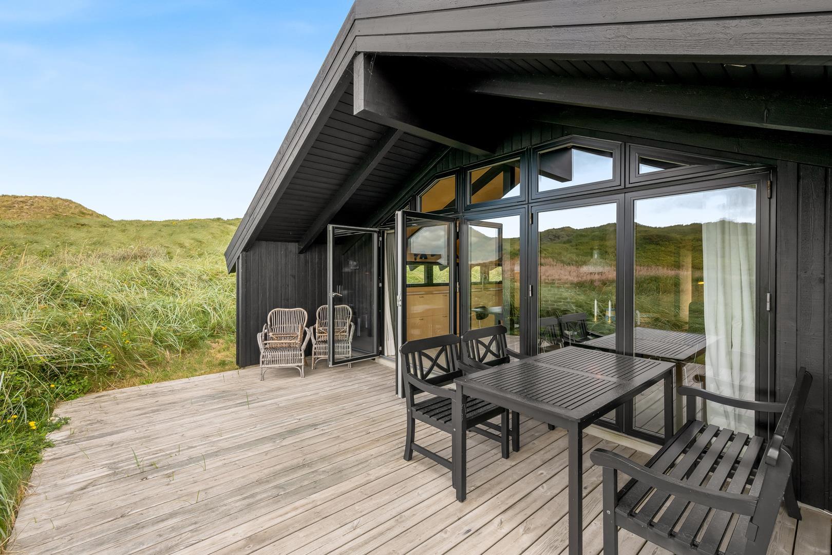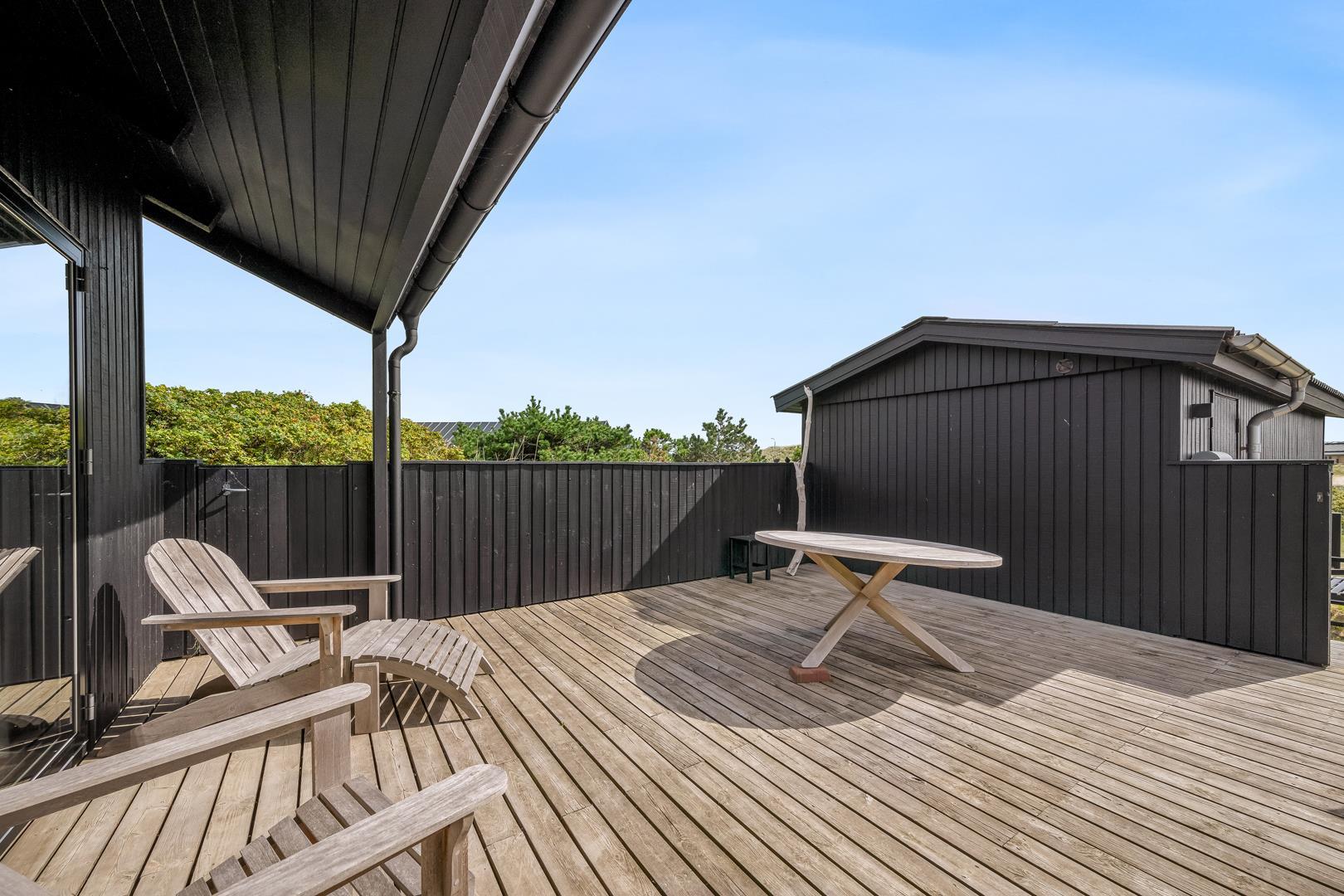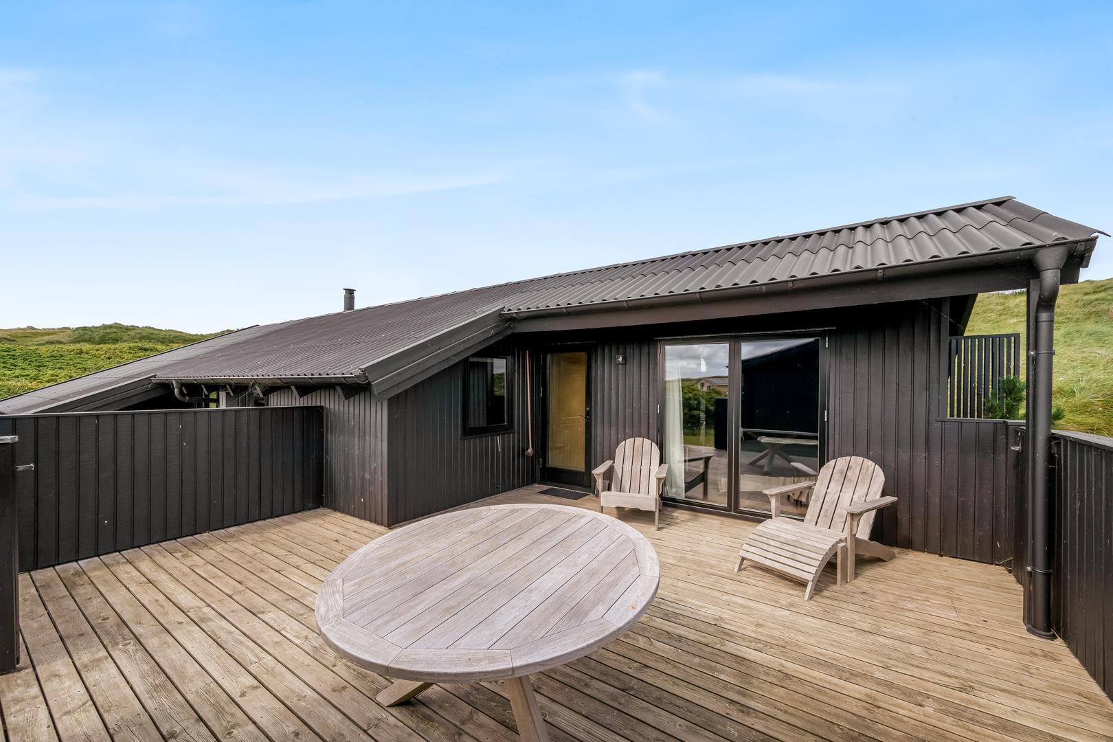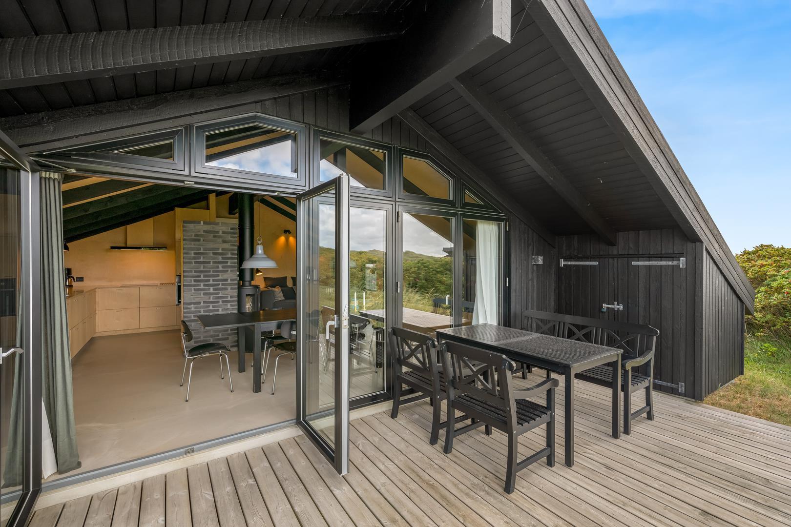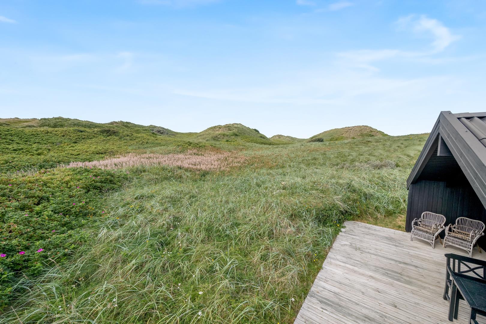 Rundt om sommerhuset og på naturgrunden inviterer flere beskyttede og solrige terrasser til afslapning. Fra den ugenerede, delvist overdækkede vestterrasse er der en fantastisk udsigt over det omkringliggende klitlandskab – her kan I opleve Henne Strands smukkeste solnedgange.