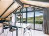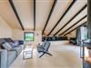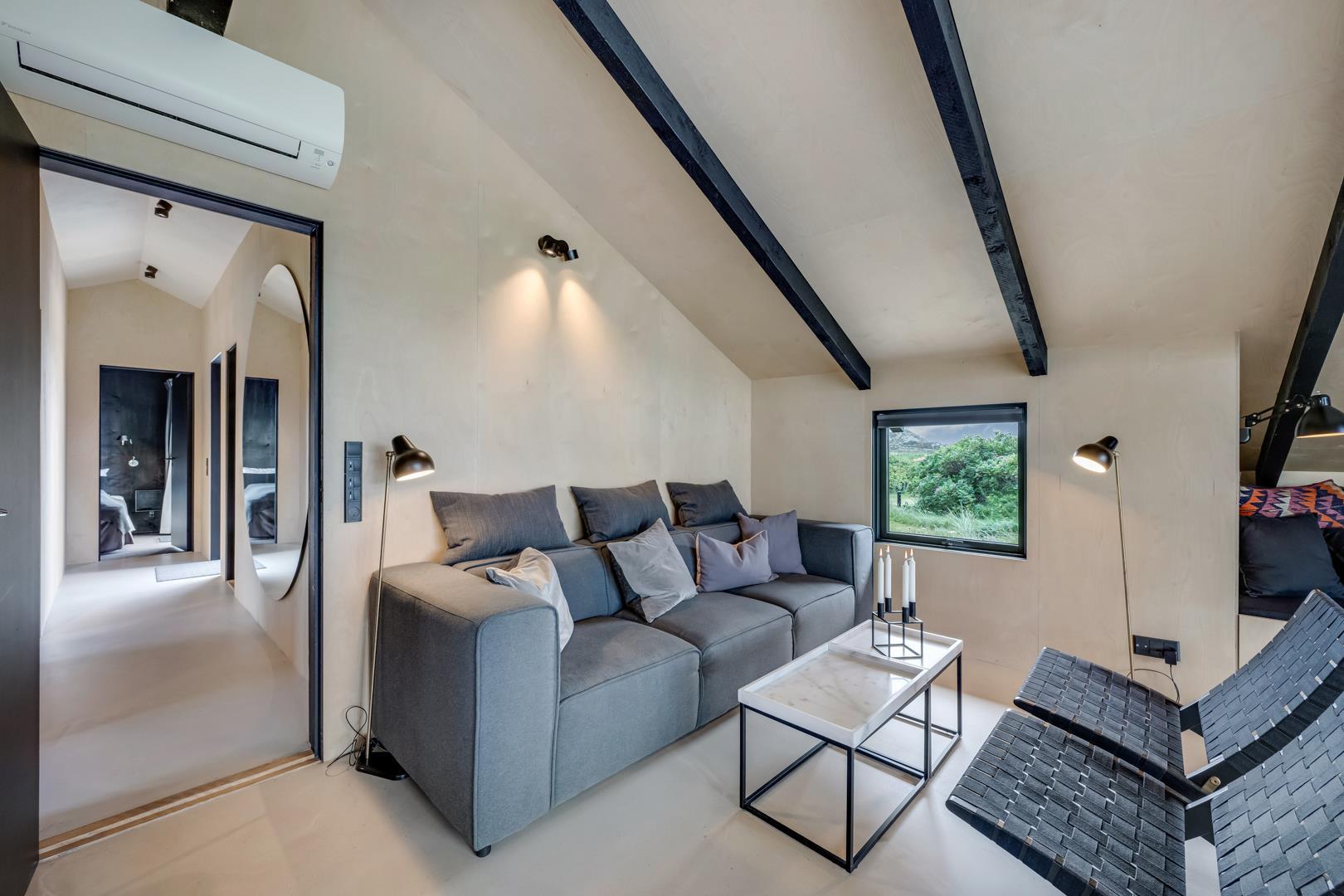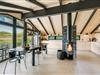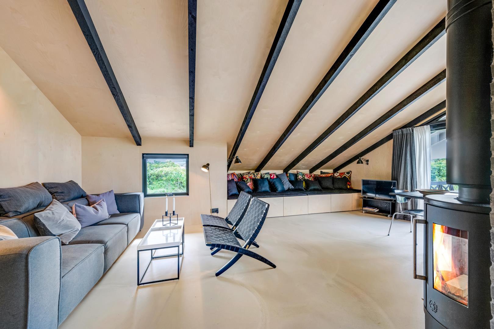 Den åbne stue med brændeovn og varmepumpe skaber en hyggelig atmosfære – ideelt for familier eller par, der søger et sommerhus ved Vesterhavet. Store vinduer og direkte adgang til vestterrassen lukker masser af lys og klitlandskab ind i rummet.