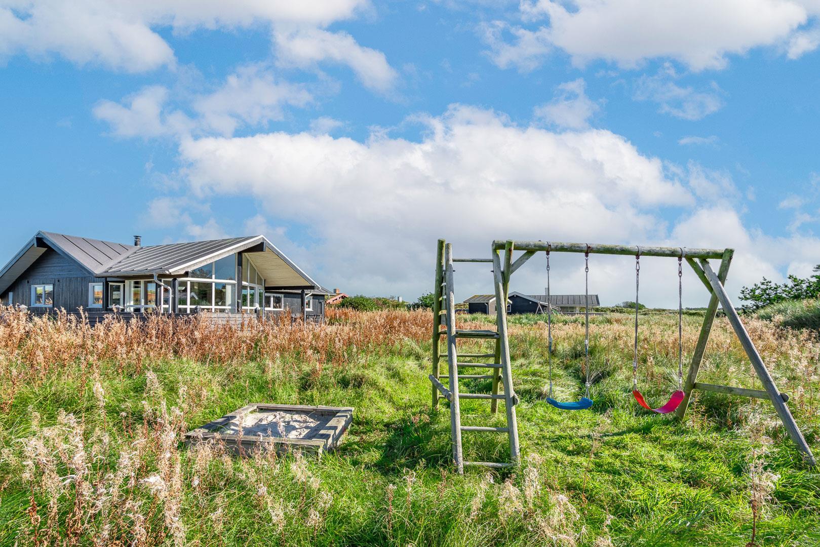 Lyst og moderne feriehus nær stranden og Henne Mølleå med spa, sauna og stor terrasse på en skøn naturgrund.