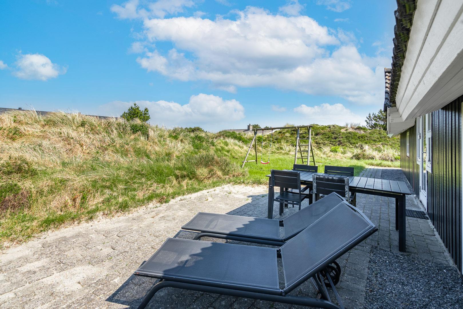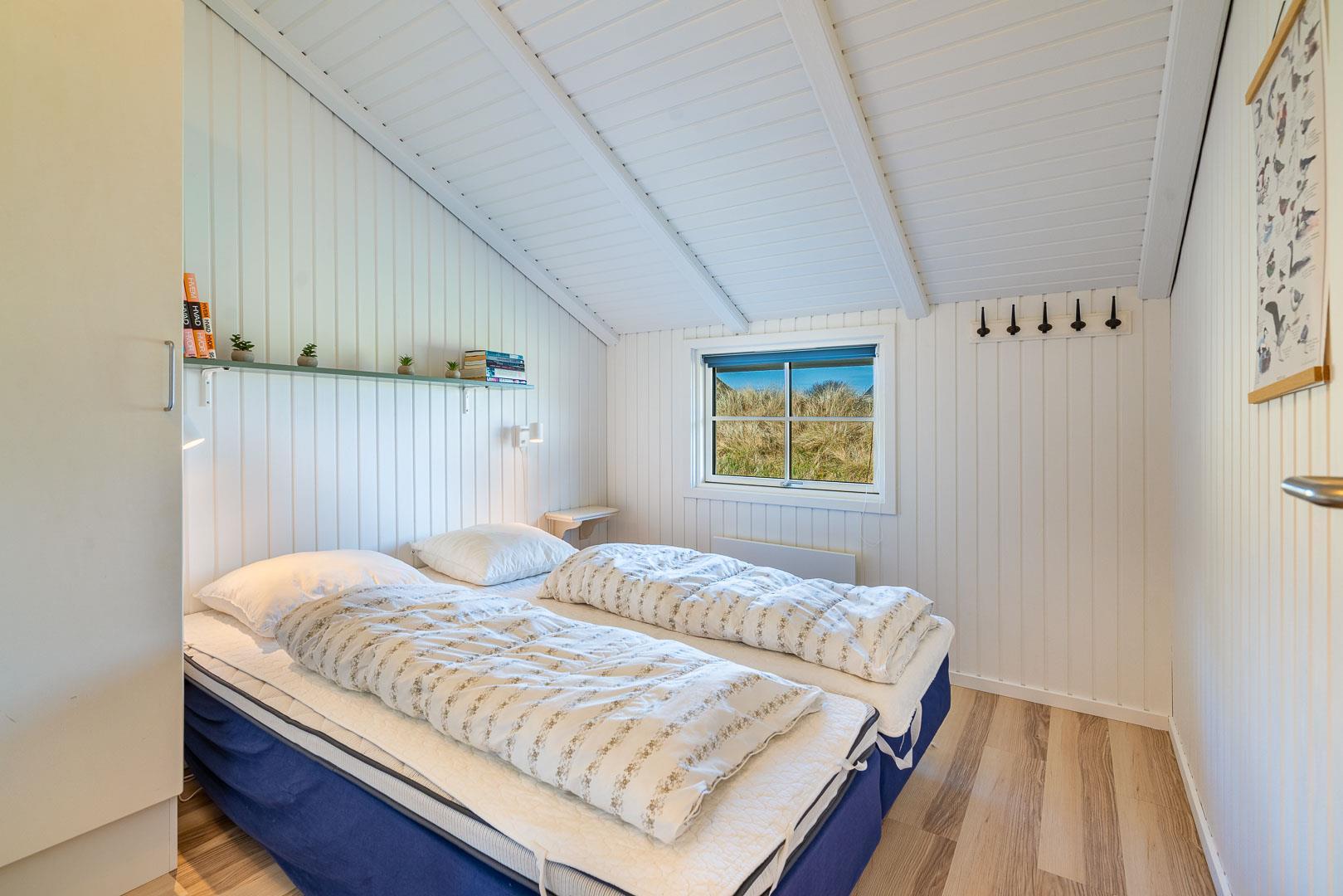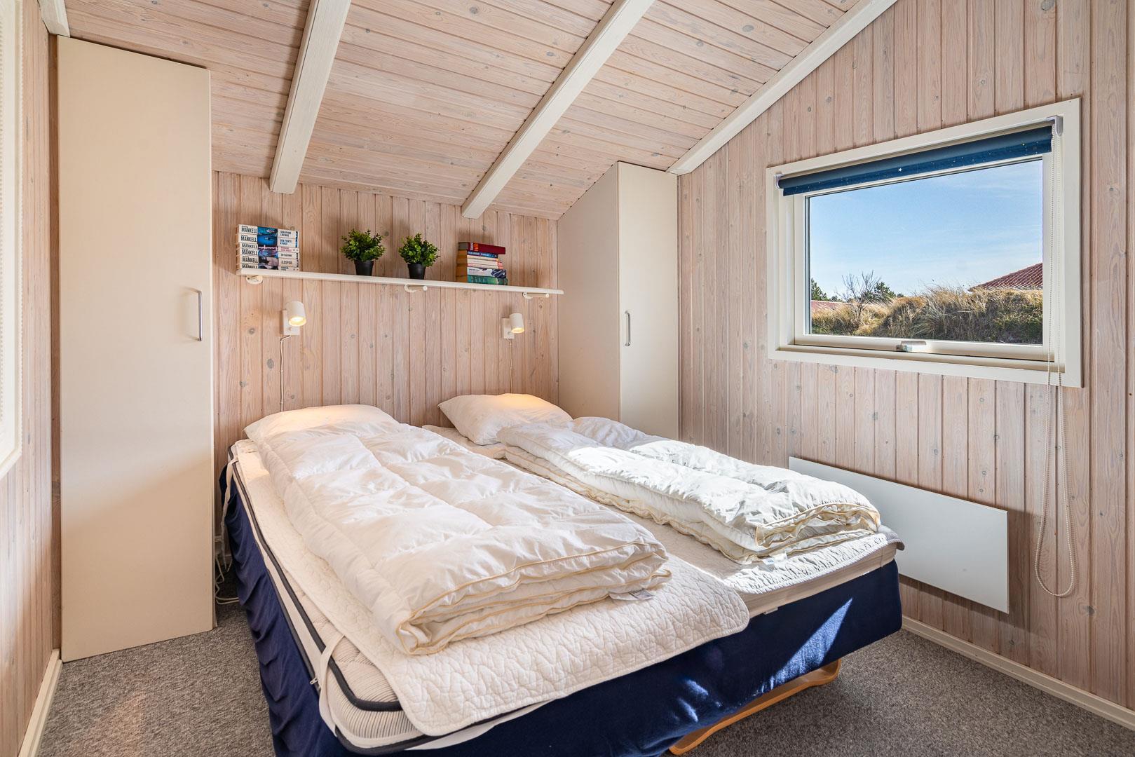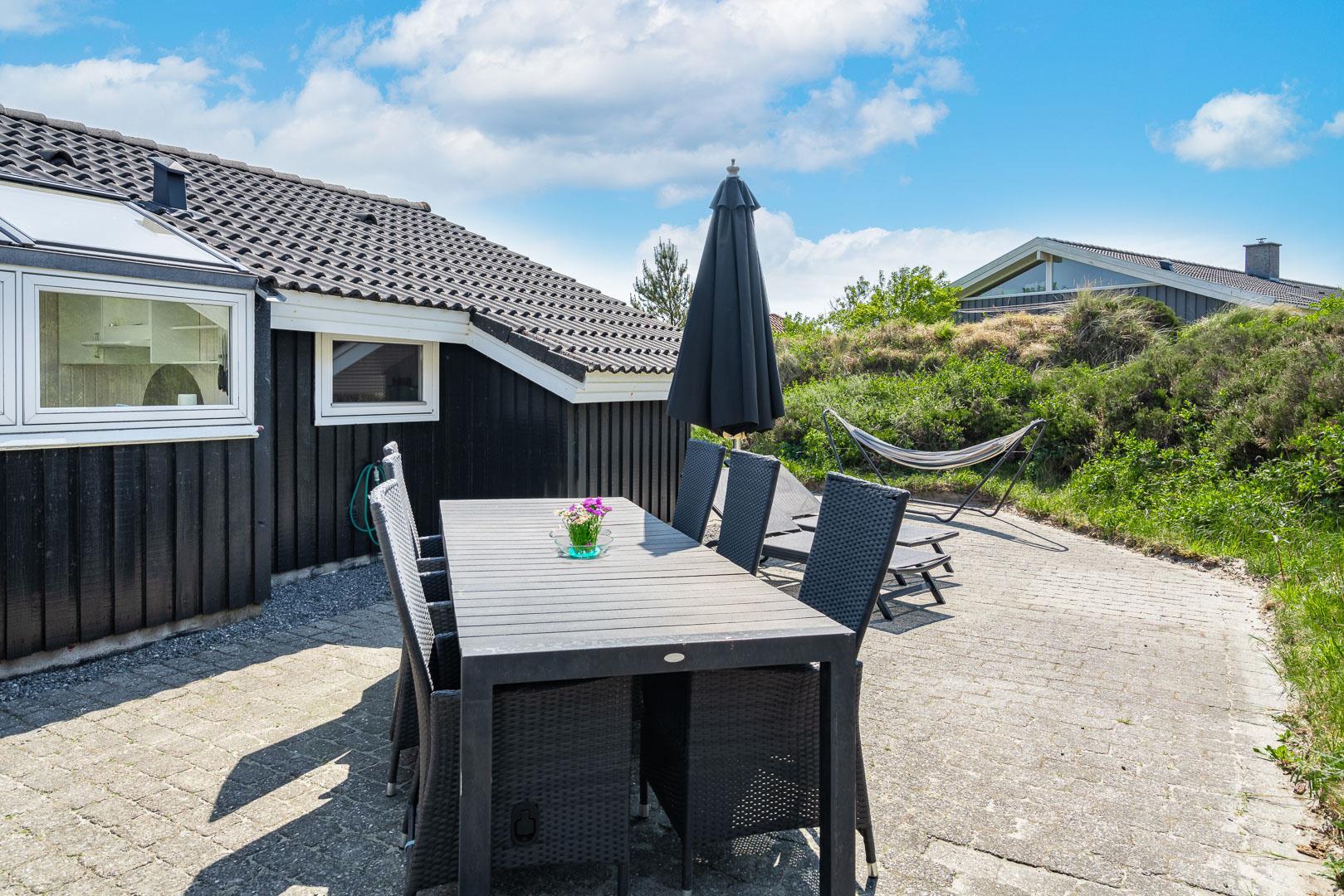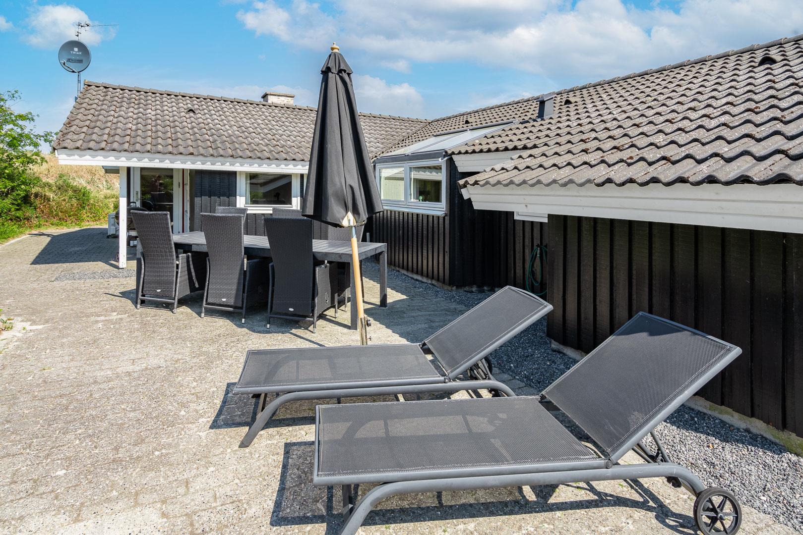 I rolige omgivelser for enden af blind stikvej finder I dette velholdte og velindrettede feriehus. Huset er omgivet af klitter, så der er gode læ muligheder på den delvis overdækkede terrasse. Der er et bryggers med vaskemaskine og tørretumbler, samt 2 badeværelser, hvoraf den ene er med spabad og sauna. Feriehuset råder over 4 soverum, 3 med dobbeltseng og et rum med 2 enkeltsenge. I åben forbindelse med husets køkken finder I spisepladsen og opholdsstuen, som er delt i 2 via et trappetrin. Der er også en brændeovn og energivenlig varmepumpe til rådighed. Den delvist overdækkede terrasse omkranser næsten hele huset, så I altid kan finde et læfyldt sted.