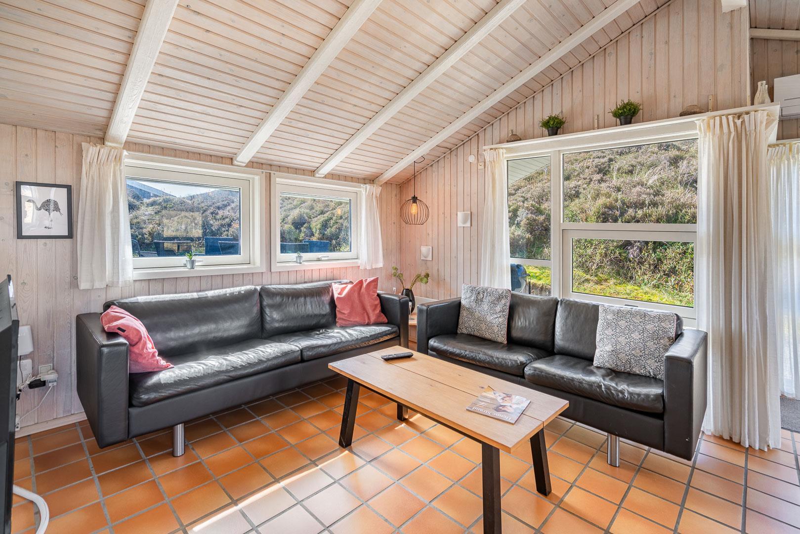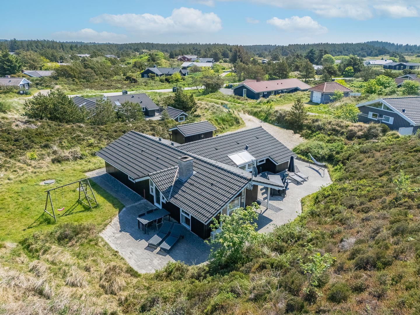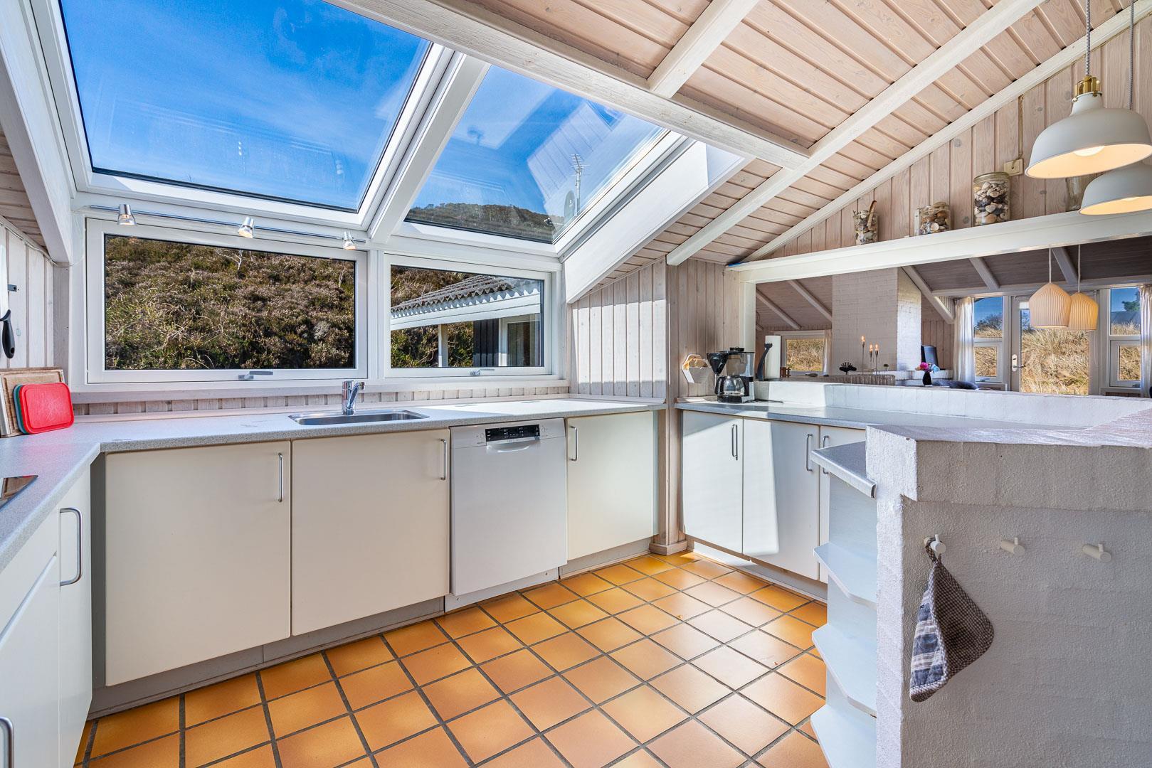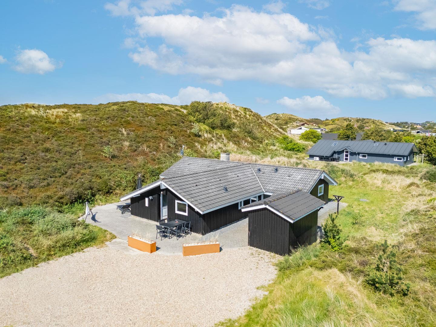 I rolige omgivelser for enden af blind stikvej finder I dette velholdte og velindrettede feriehus. Huset er omgivet af klitter, så der er gode læ muligheder på den delvis overdækkede terrasse. Der er et bryggers med vaskemaskine og tørretumbler, samt 2 badeværelser, hvoraf den ene er med spabad og sauna. Feriehuset råder over 4 soverum, 3 med dobbeltseng og et rum med 2 enkeltsenge. I åben forbindelse med husets køkken finder I spisepladsen og opholdsstuen, som er delt i 2 via et trappetrin. Der er også en brændeovn og energivenlig varmepumpe til rådighed. Den delvist overdækkede terrasse omkranser næsten hele huset, så I altid kan finde et læfyldt sted.