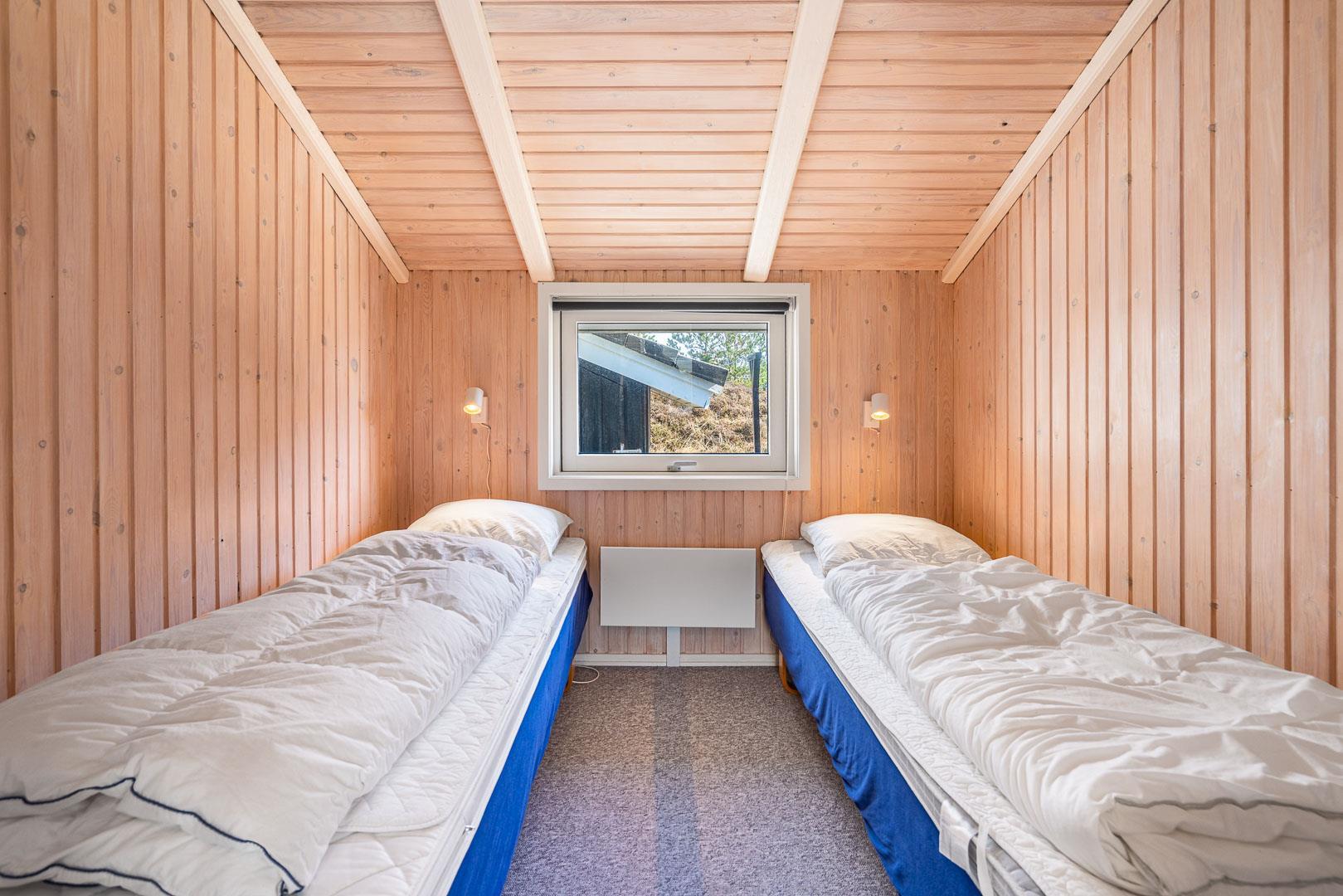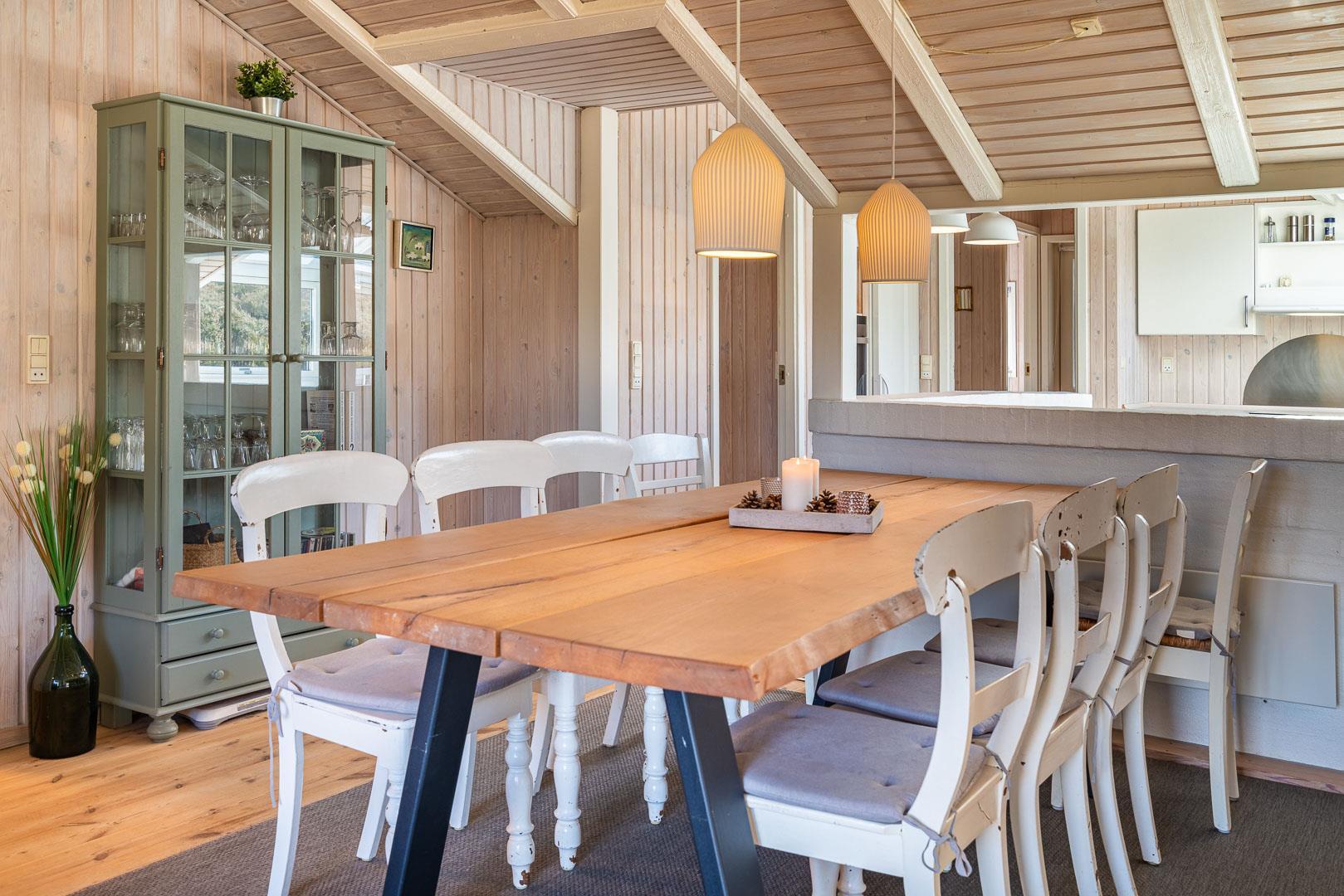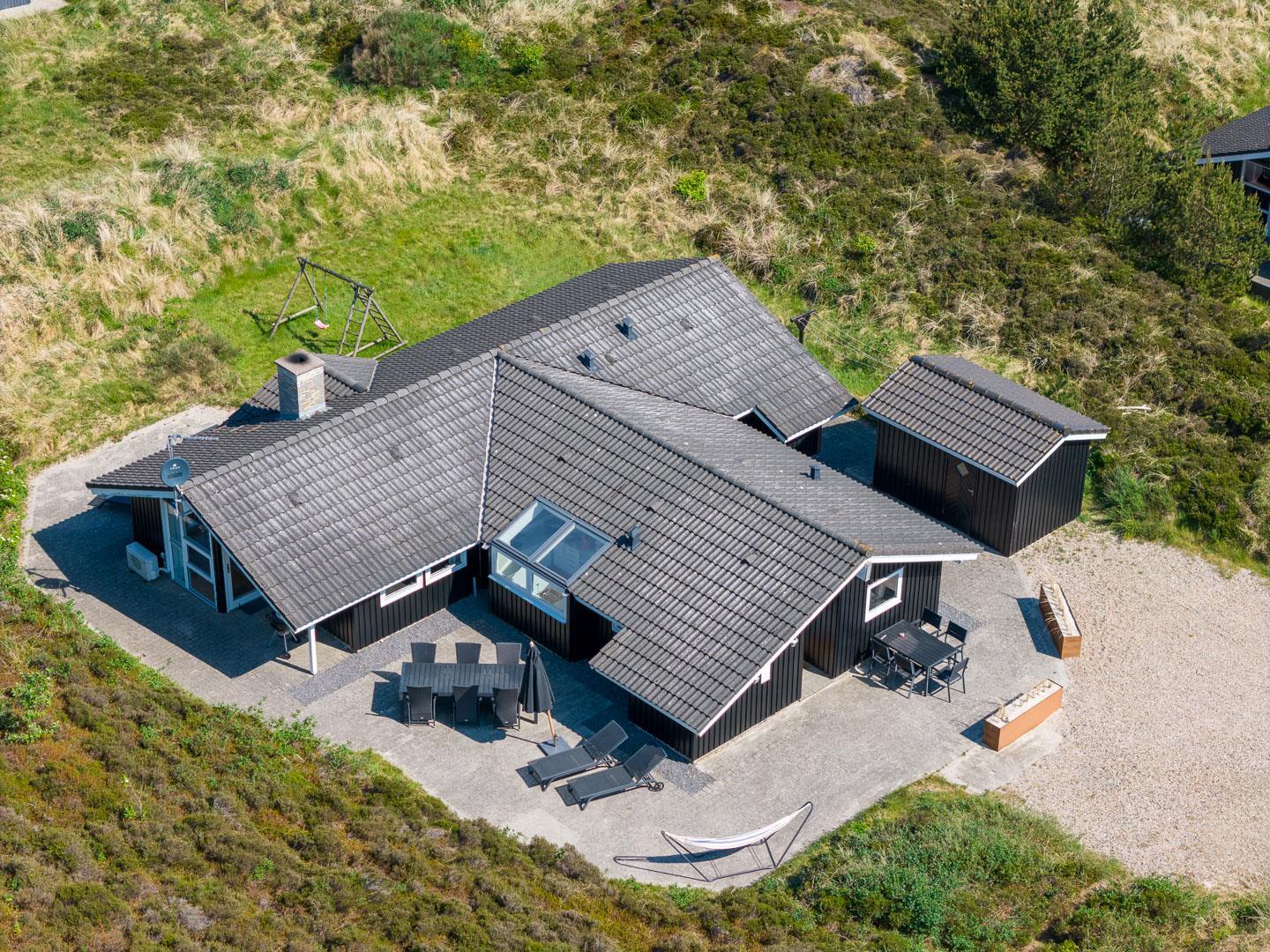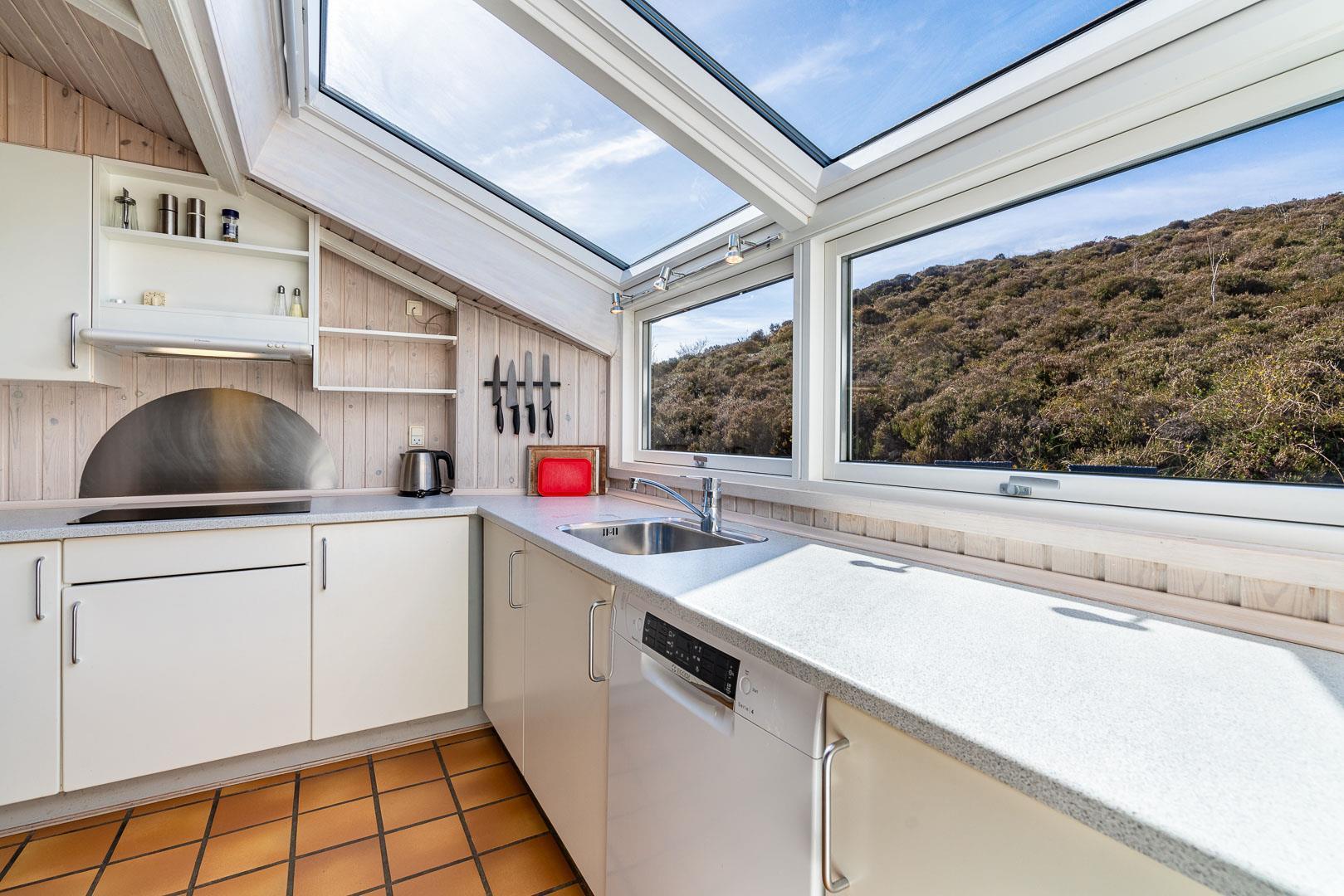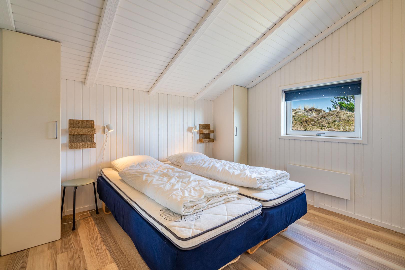 I rolige omgivelser for enden af blind stikvej finder I dette velholdte og velindrettede feriehus. Huset er omgivet af klitter, så der er gode læ muligheder på den delvis overdækkede terrasse. Der er et bryggers med vaskemaskine og tørretumbler, samt 2 badeværelser, hvoraf den ene er med spabad og sauna. Feriehuset råder over 4 soverum, 3 med dobbeltseng og et rum med 2 enkeltsenge. I åben forbindelse med husets køkken finder I spisepladsen og opholdsstuen, som er delt i 2 via et trappetrin. Der er også en brændeovn og energivenlig varmepumpe til rådighed. Den delvist overdækkede terrasse omkranser næsten hele huset, så I altid kan finde et læfyldt sted.