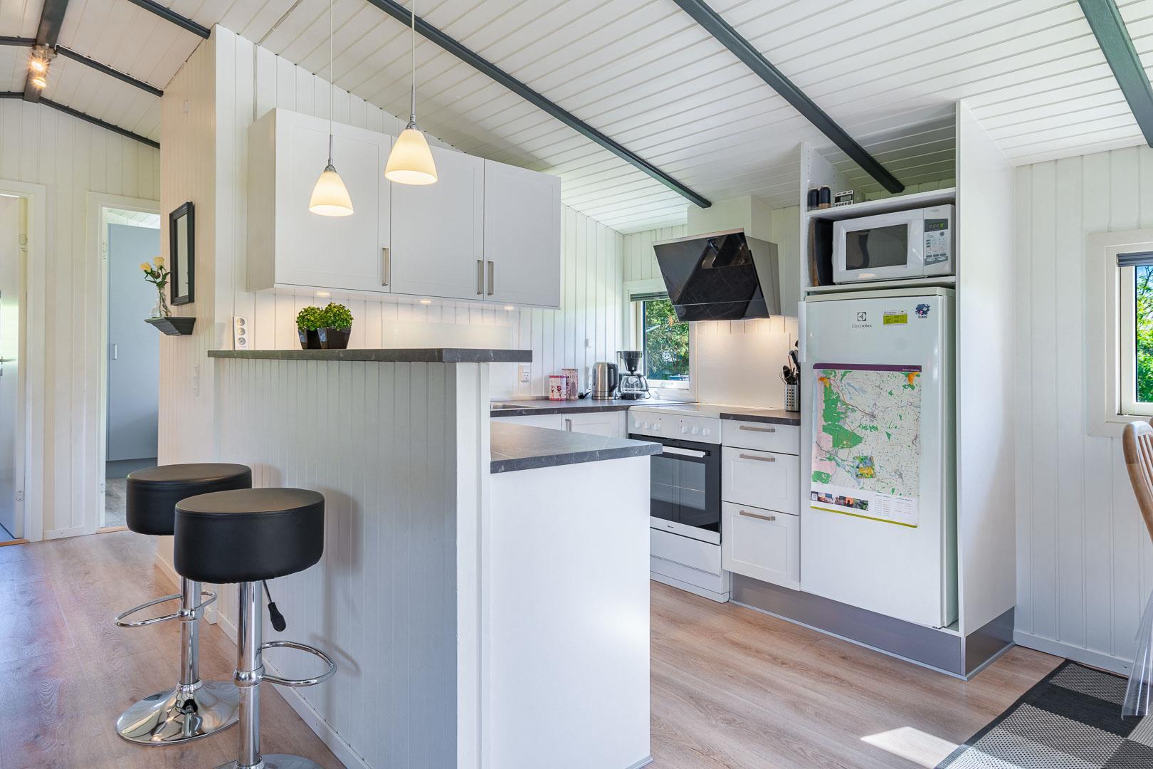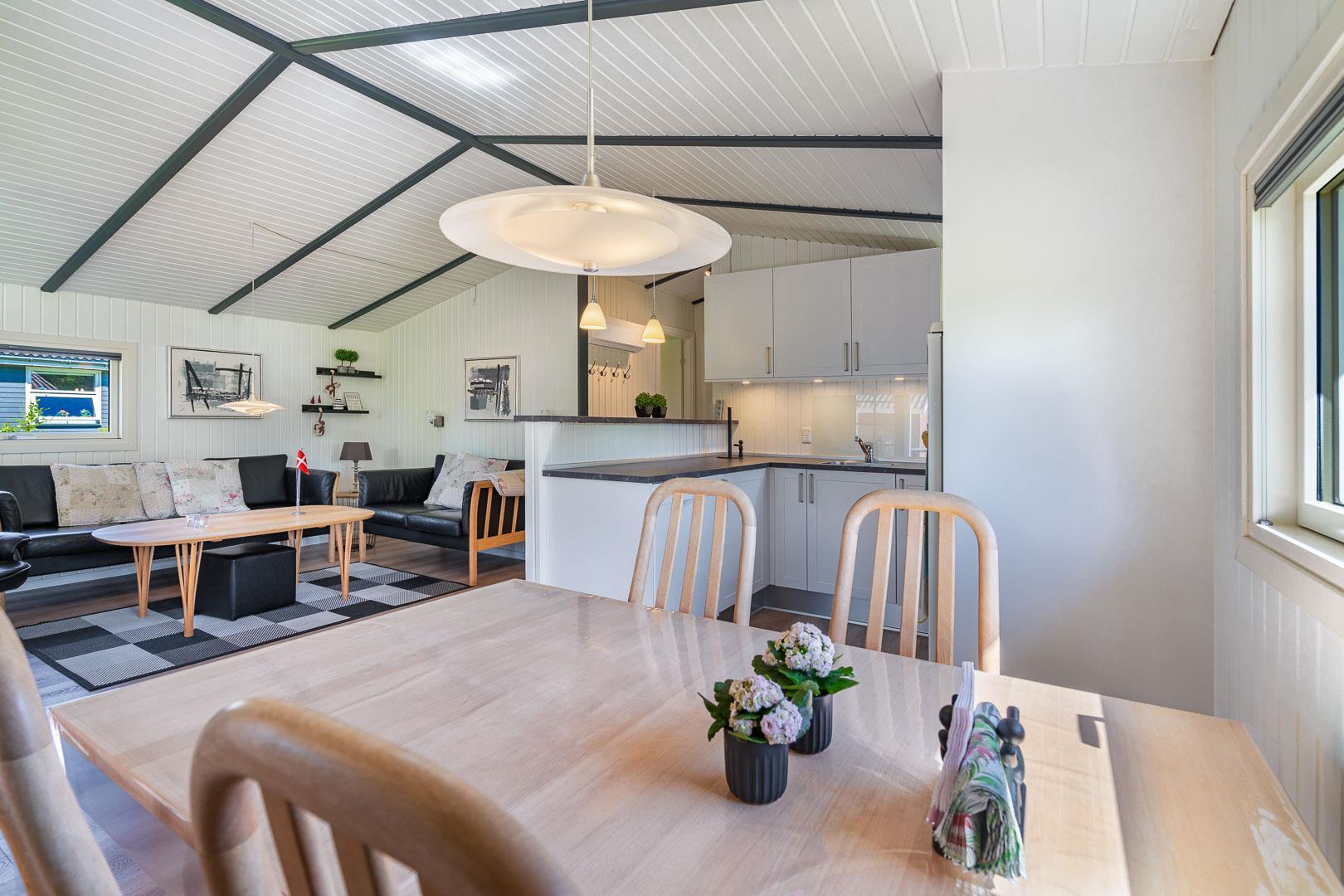 Indvendigt fremstår huset velholdt, lyst og indbydende med gode kvalitetsmøbler og en brændeovn med glaslåge, der skaber varme og stemning på kølige aftener. Alt er passet godt på – her føler man sig straks hjemme.