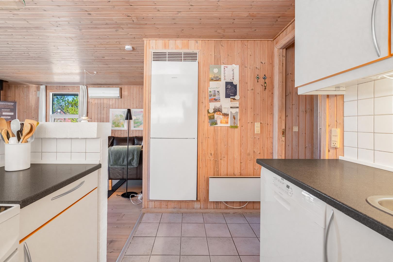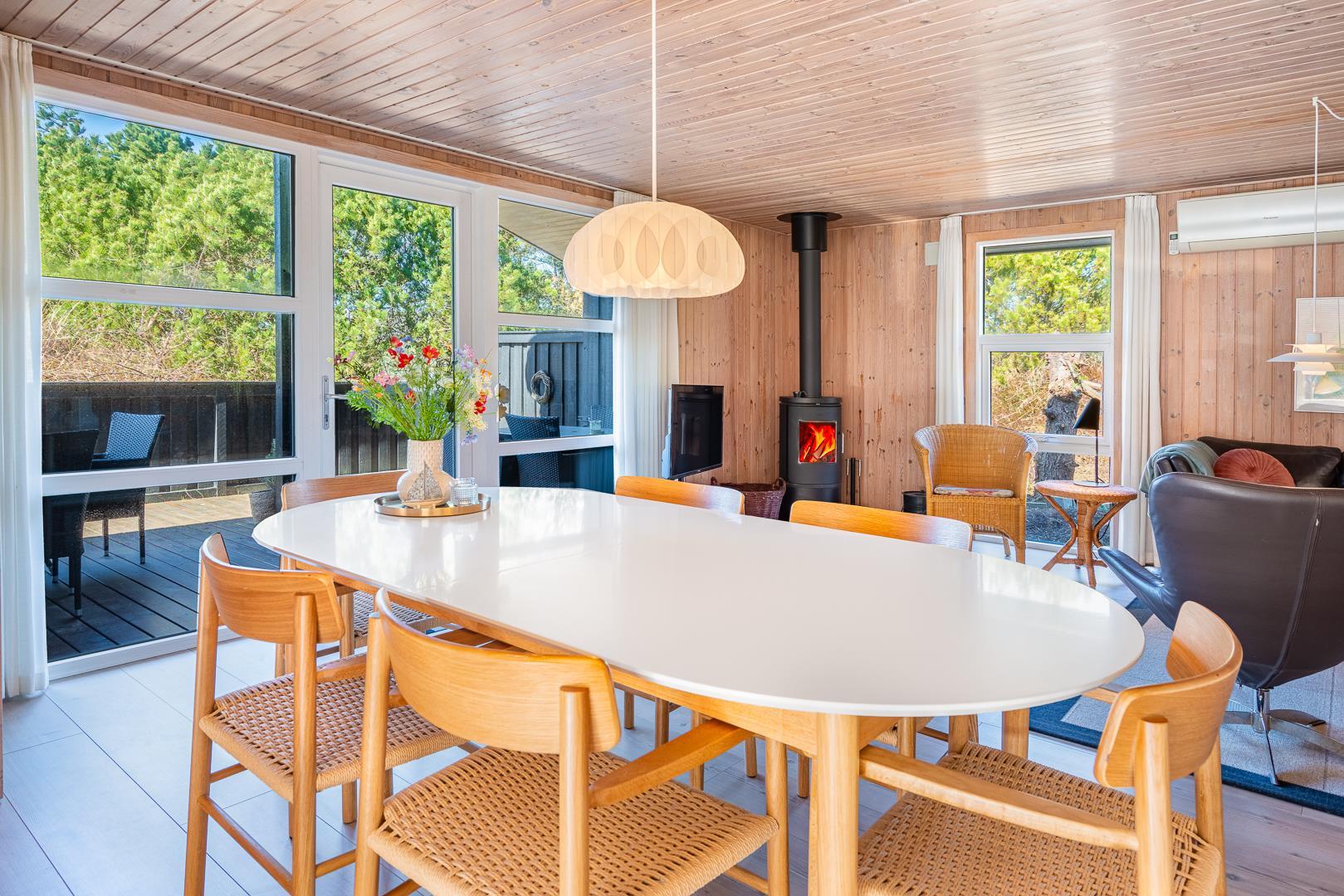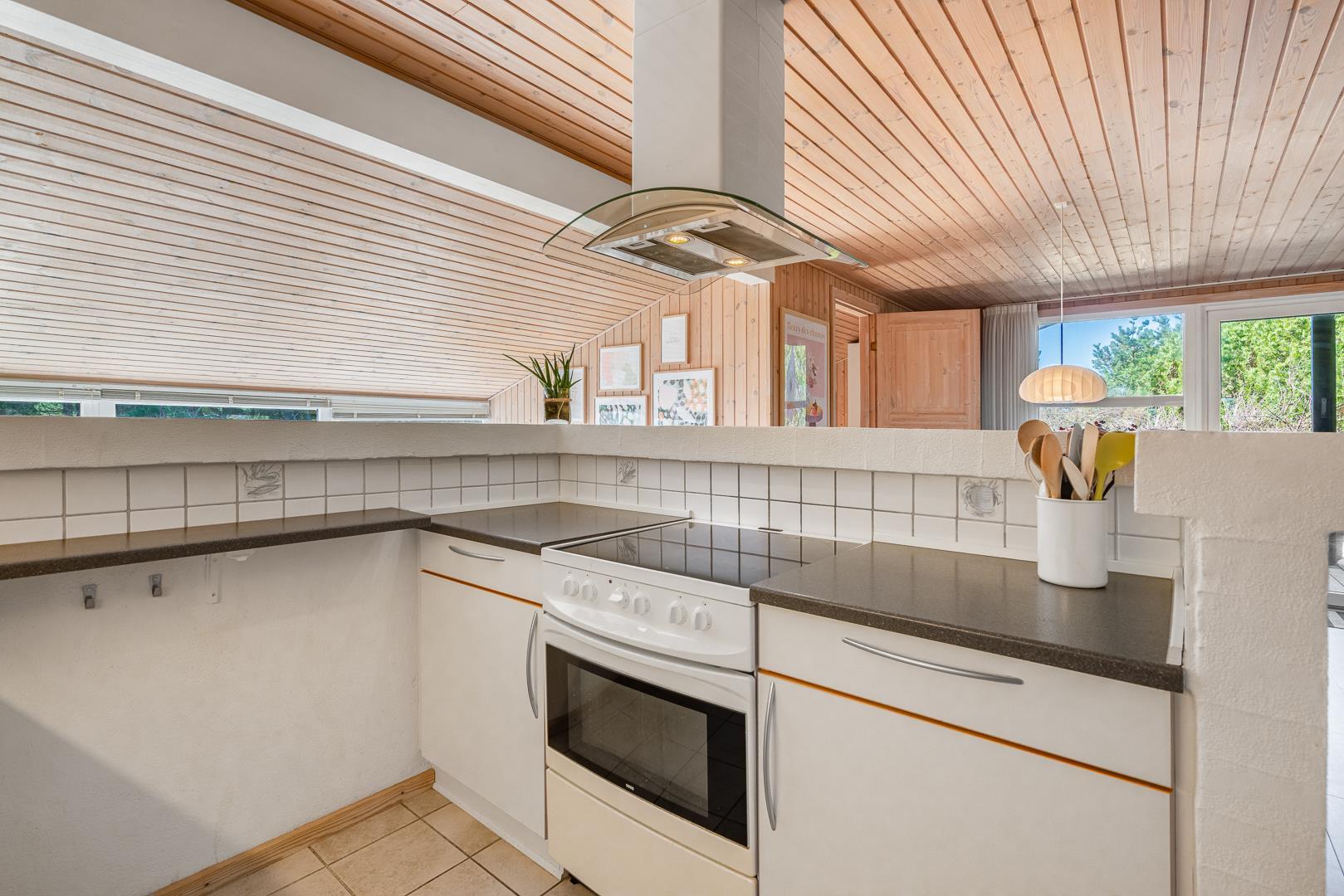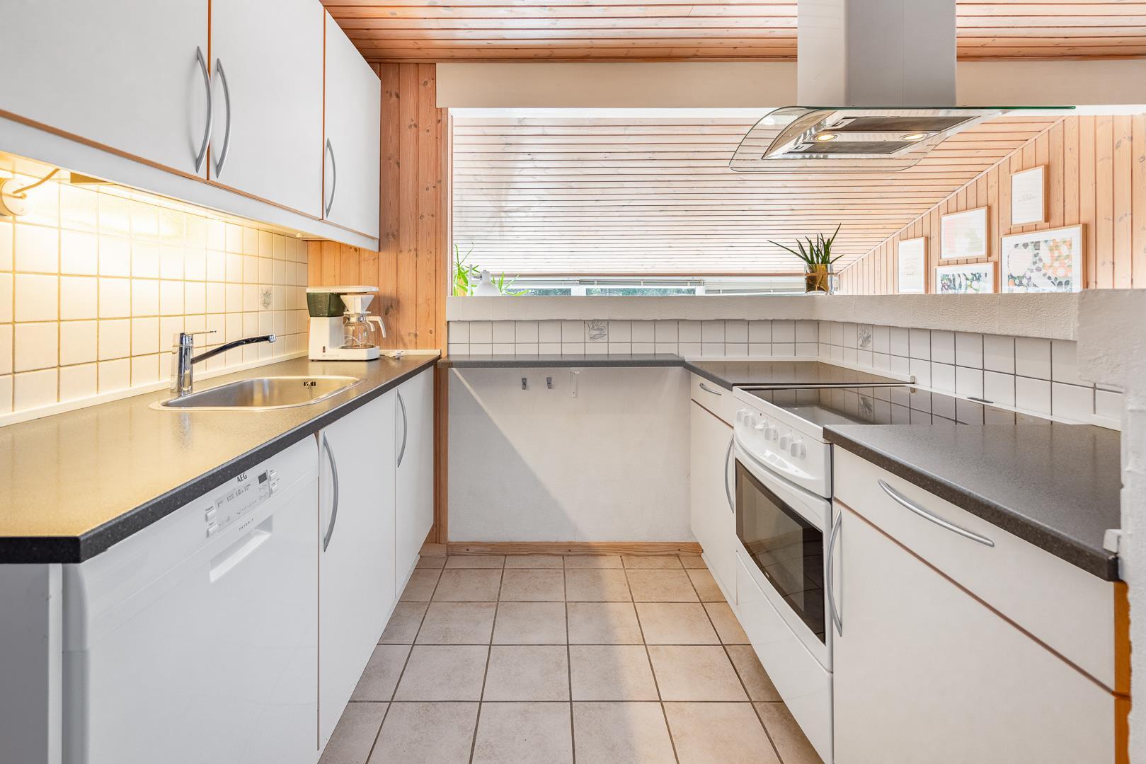 Et åbent køkken og en rummelig stue med brændeovn hvor gavlen i vest har et stort vinduesparti ud til terrassen hvor man kan nyde aftensolen. Køkkenet er lyst og venligt i skandinavisk stil. Ved øst gavlen er der en lille havestue.
