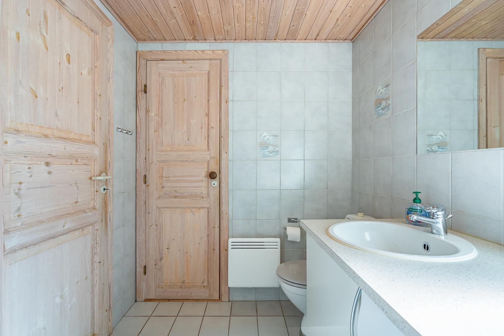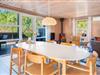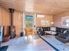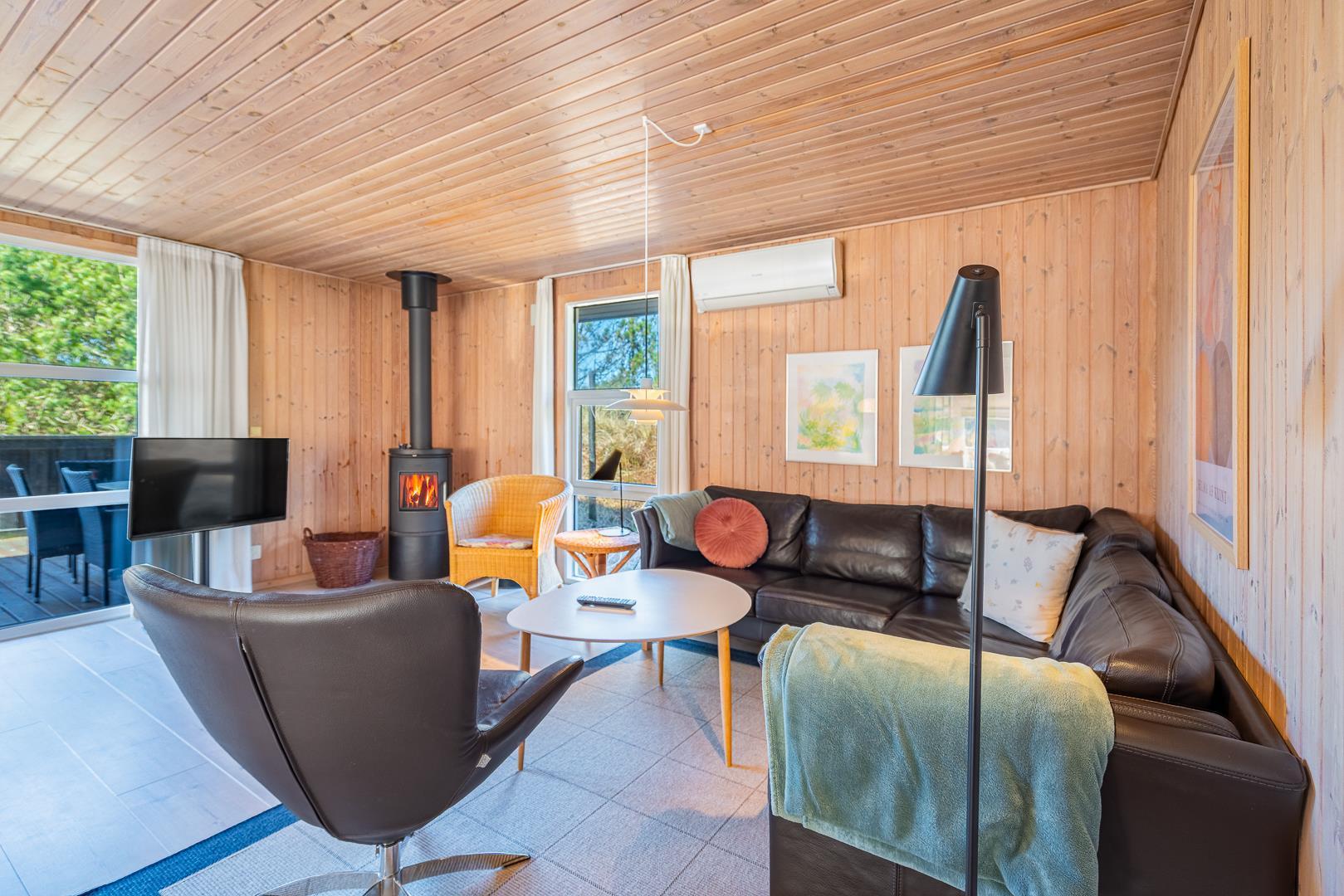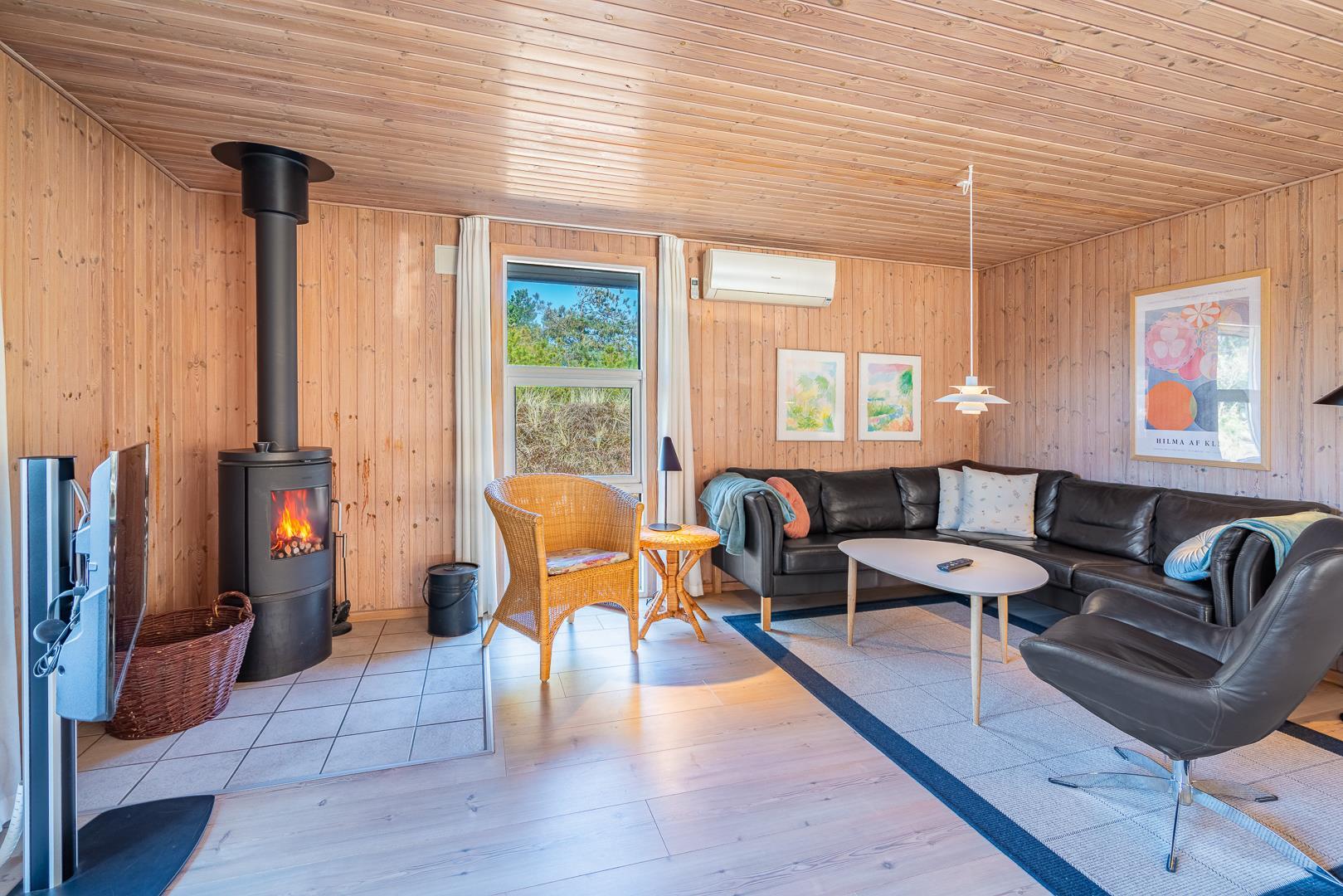 Et åbent køkken og en rummelig stue med brændeovn hvor gavlen i vest har et stort vinduesparti ud til terrassen hvor man kan nyde aftensolen. Køkkenet er lyst og venligt i skandinavisk stil. Ved øst gavlen er der en lille havestue.