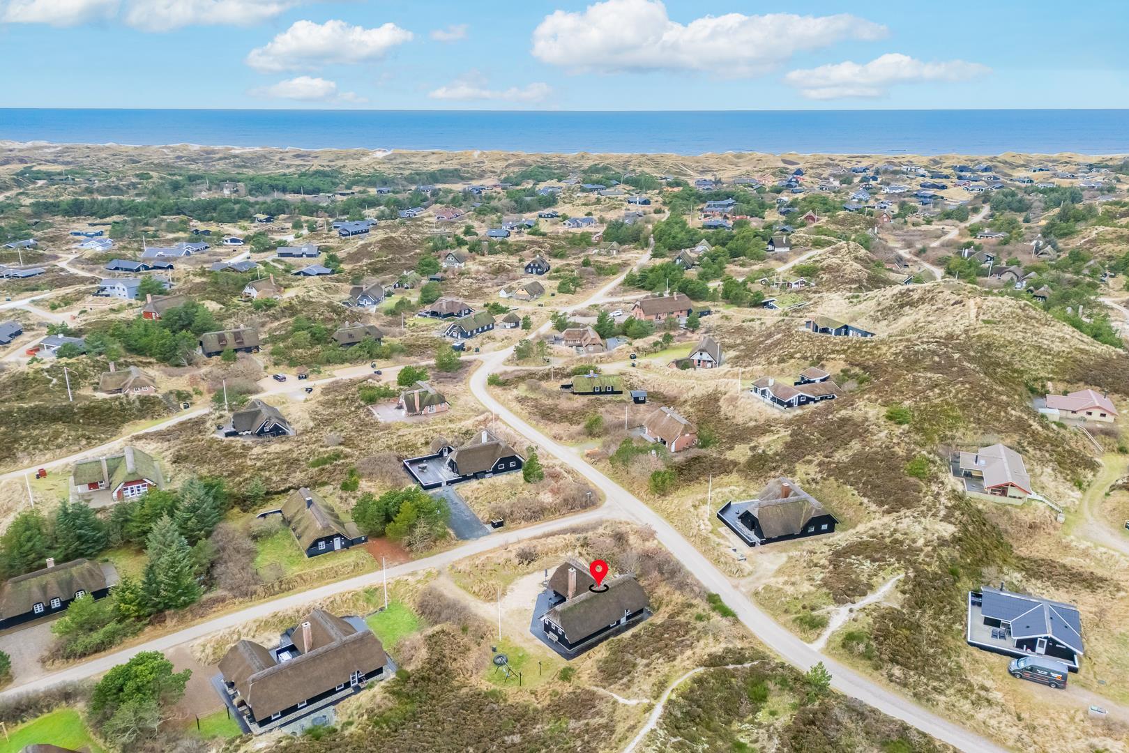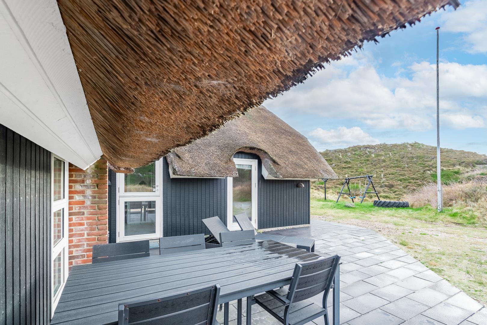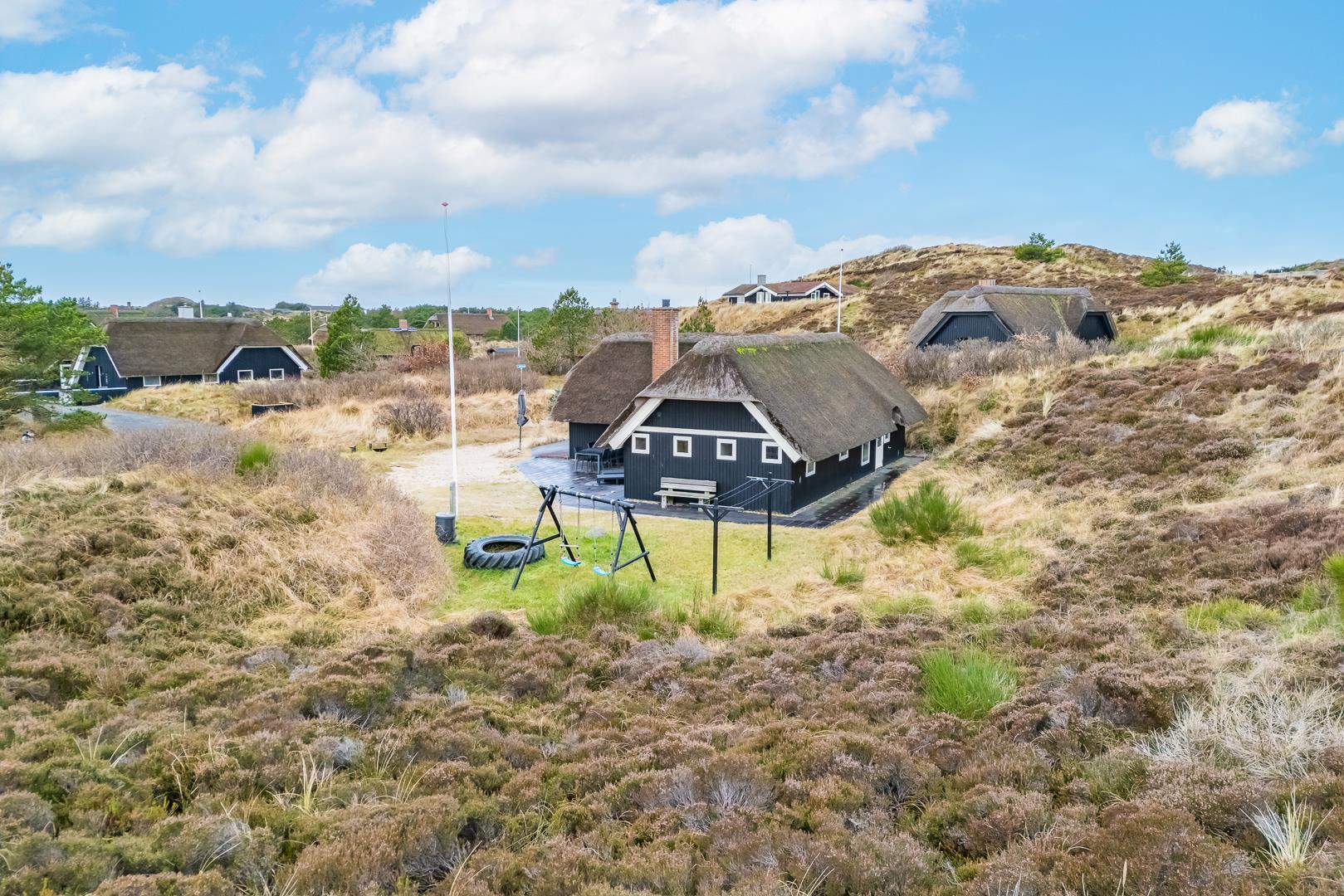 Når I har parkeret bilen ude foran det stråtækte hus, kan I med det samme sænke skuldrene og slappe helt af. Huset ligger nemlig ganske fredeligt og ugeneret på en stor klitgrund med god afstand til de omkringliggende huse. De voksne kan se frem til at nyde solen på den store solrige terrasse, mens børnene gynger på gyngestativet. Og hvis vejret ikke er til udendørsaktiviteter, kan I trække indenfor, hvor stemningen indbyder til afslapning med Anders And-blade og gode krimier eller hjemmelavet saunagus.