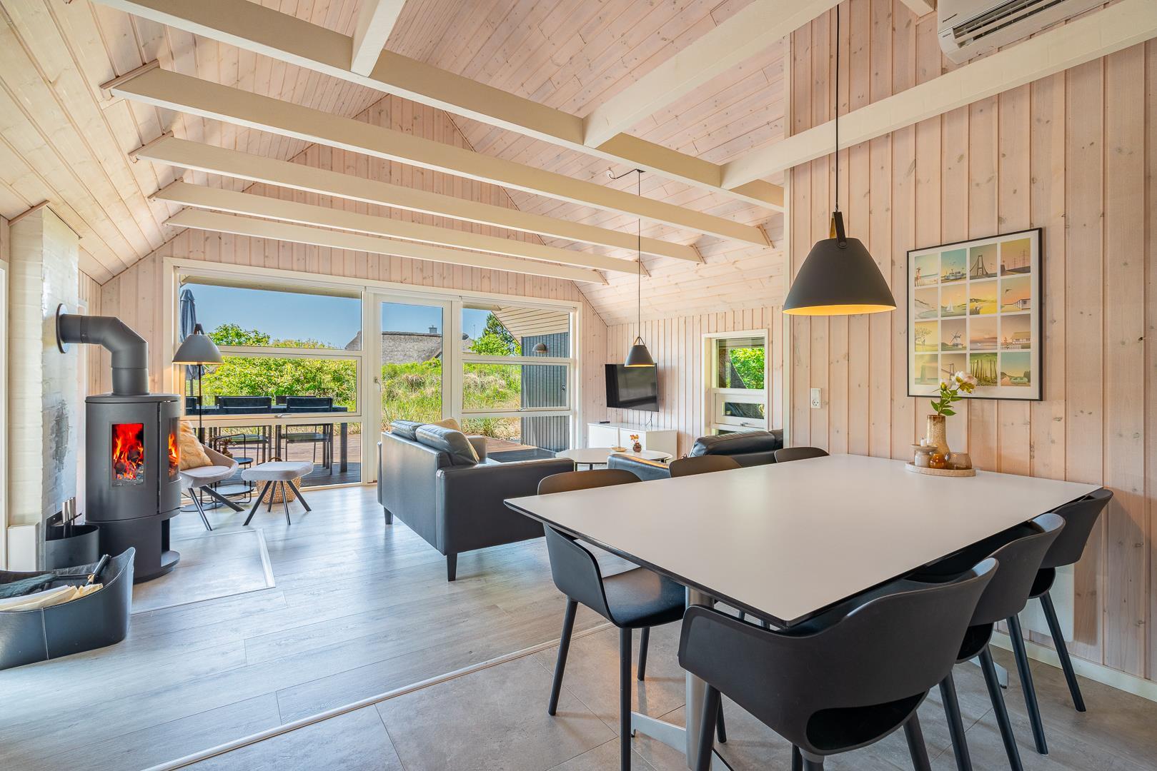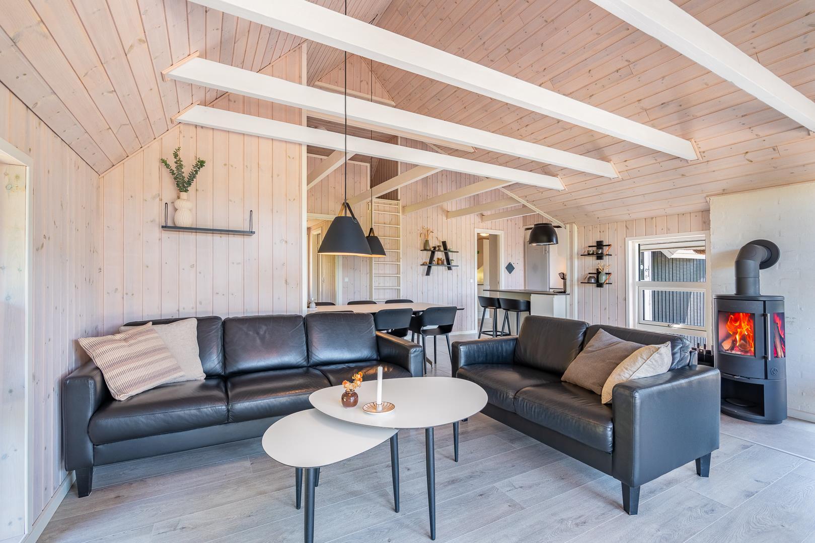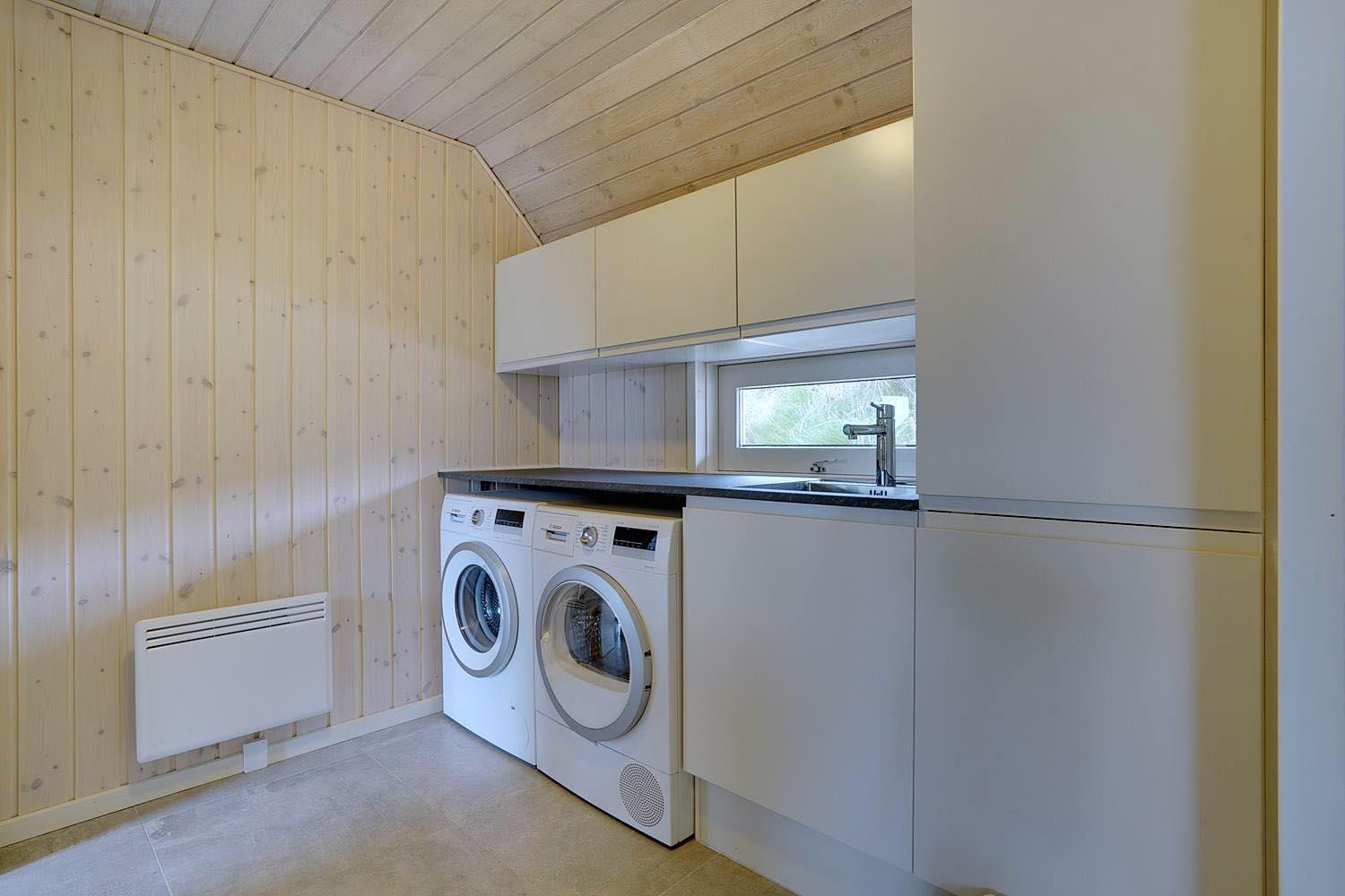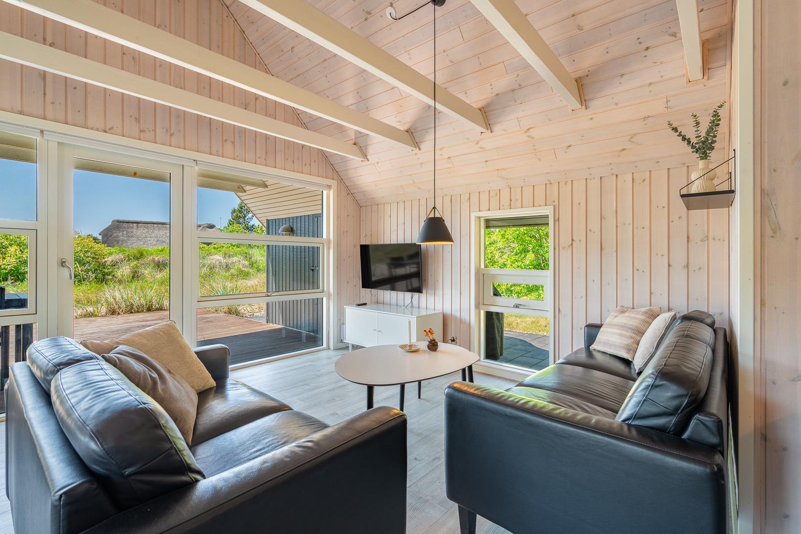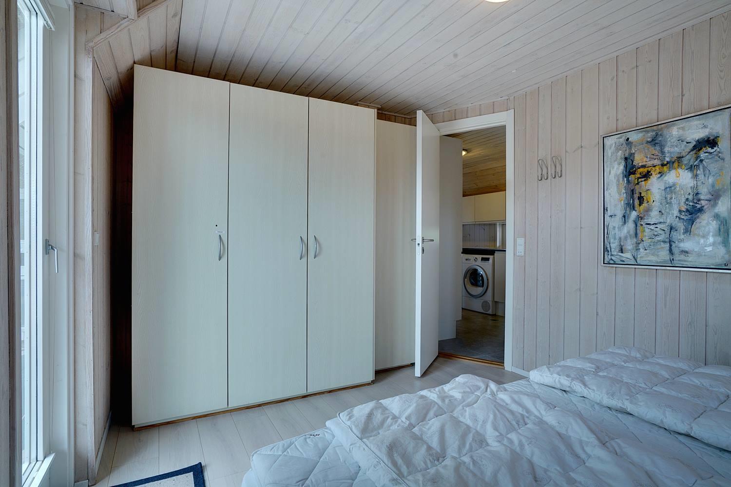 Foruden dette åbne opholdsmiljø byder huset på seks sovepladser fordelt på to separate afdelinger, som begge har badeværelser – det ene med sauna og det andet med spa. Endelig er der et praktisk bryggers med vaskemaskine og tørretumbler.