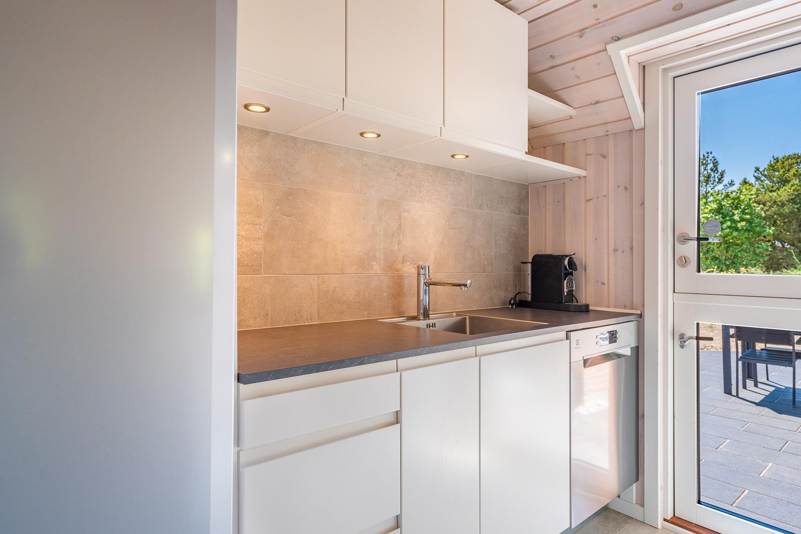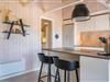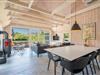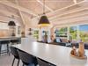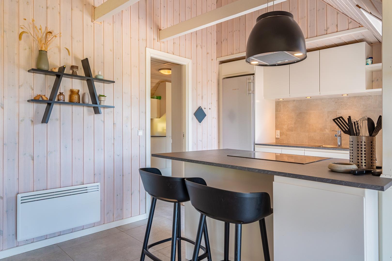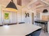 Køkkenet ligger i åben forbindelse med en stemningsfyldt stue med hems og loft til kip.