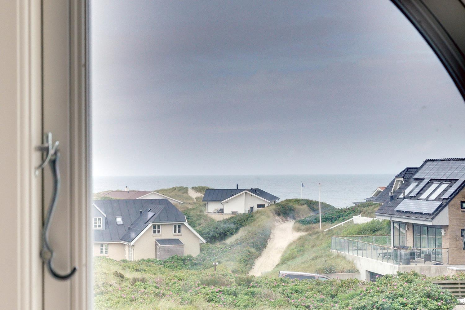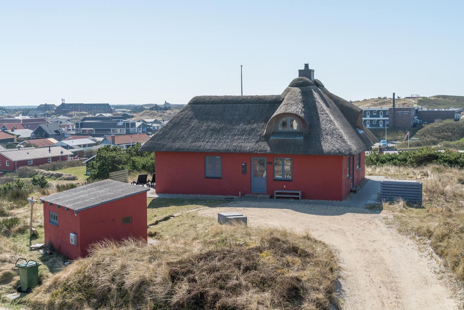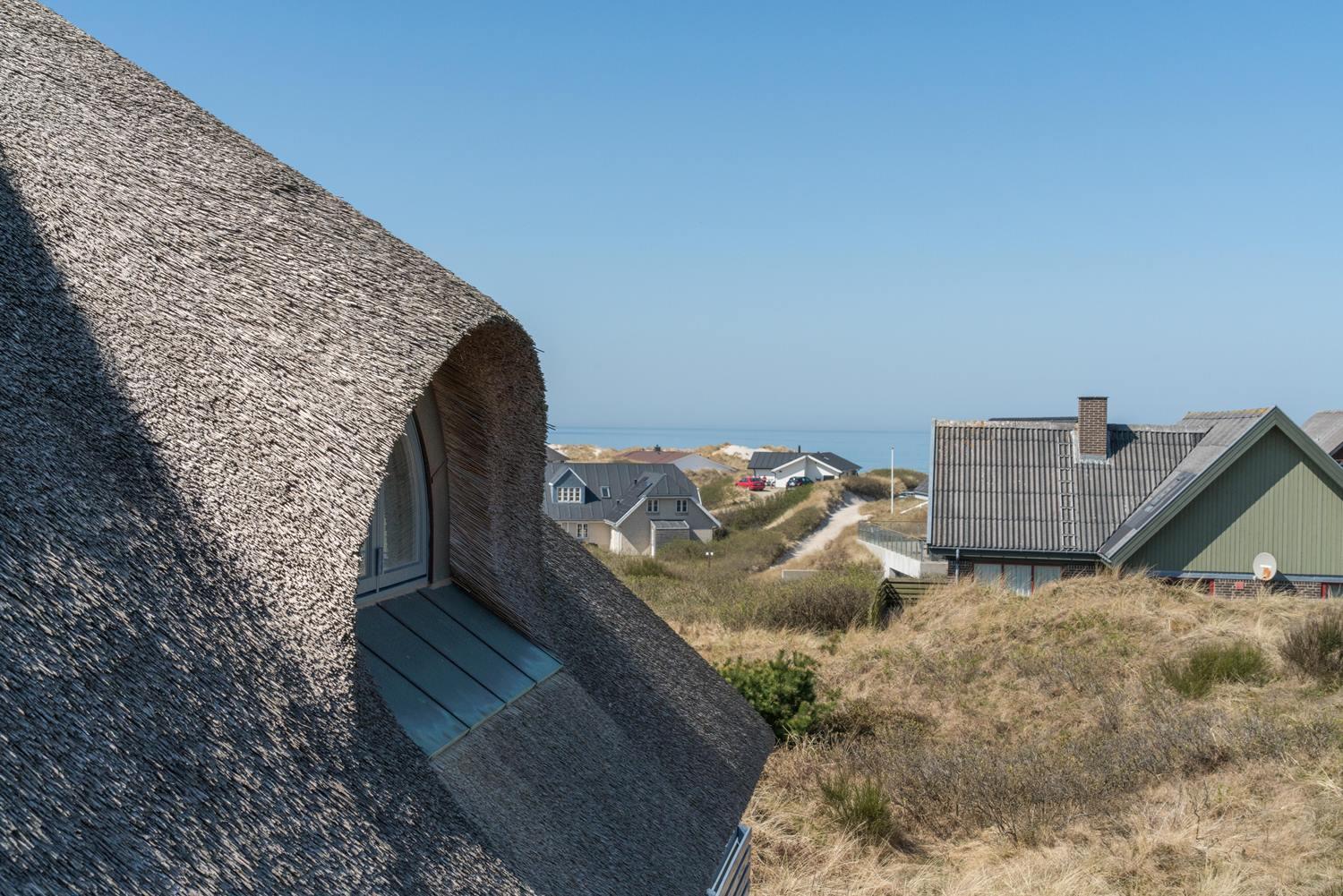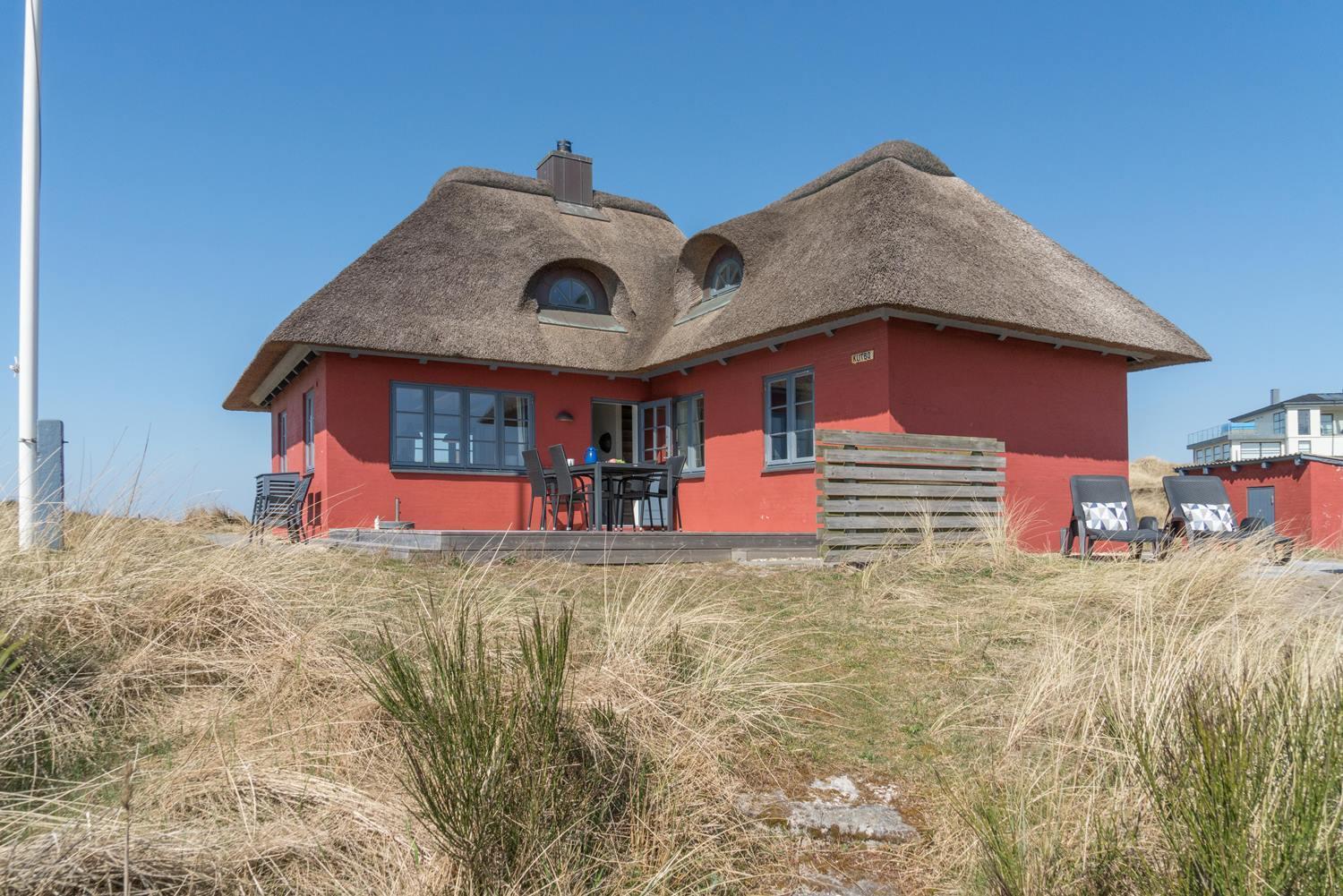 På en højtliggende naturgrund i rolige omgivelser og med fantastisk udsigt over Henne Strand og havet, ligger dette murede, stråtækte feriehus. Huset har et nyere flot køkken med gulvvarme, hyggelig og lys stue hvorfra udsigten over byen og havet kan nydes. Fra stuen er der udgang til skøn sydvendt træterrasse . På 1 sal finde man stort nyt soverum med dobbeltseng og 2 (barnesenge), det sidste soverum er i stueetagen. Huset egner sig kun til maks. 4 voksne - men der kan f.eks. godt være 4 voksne og 2 mindre børn...
