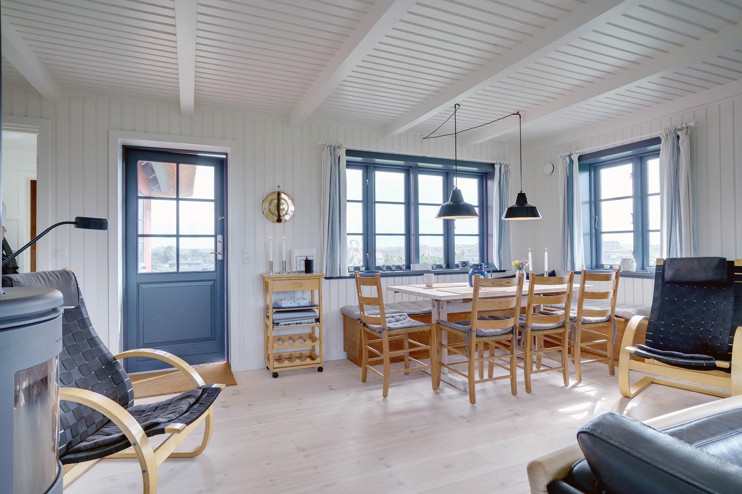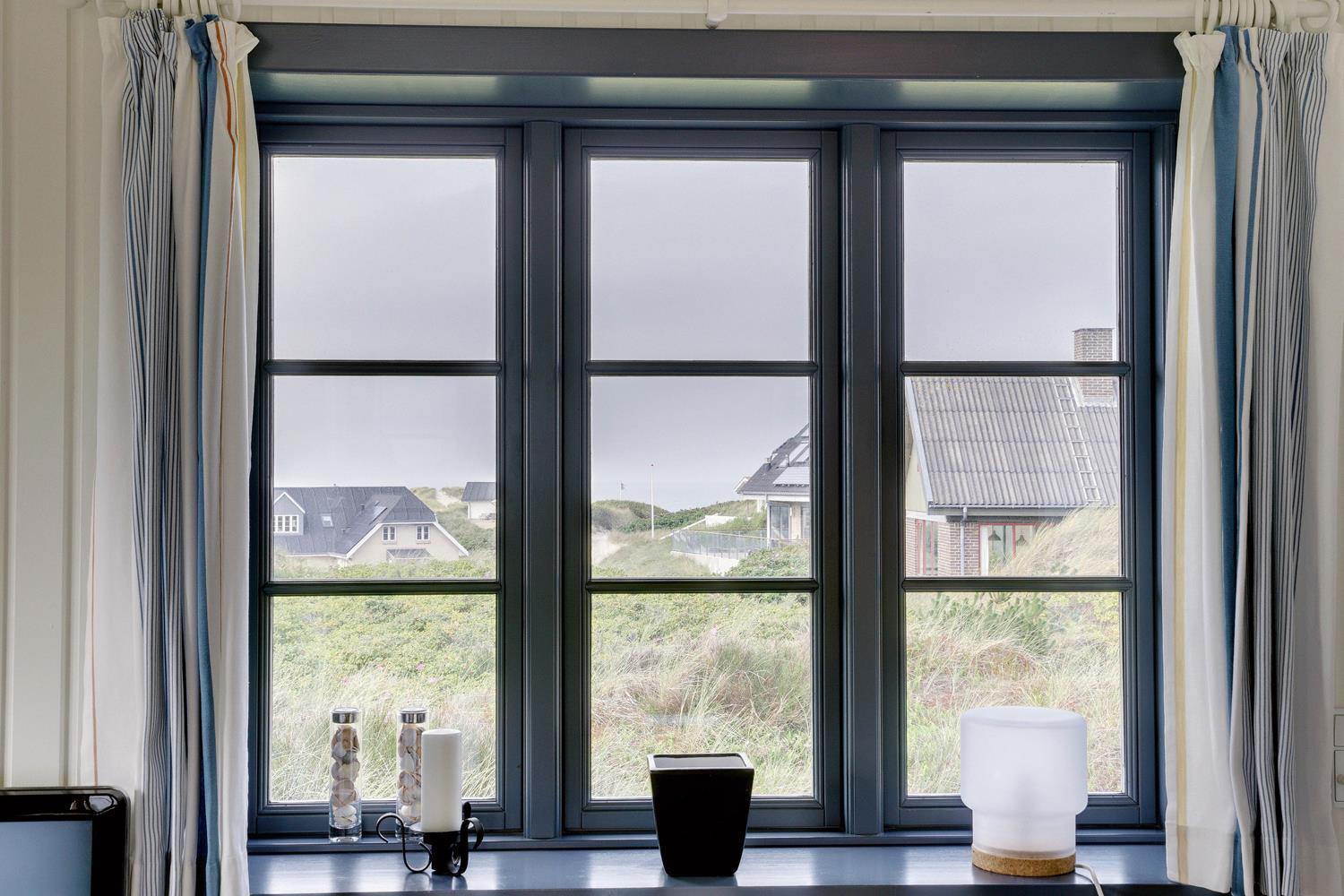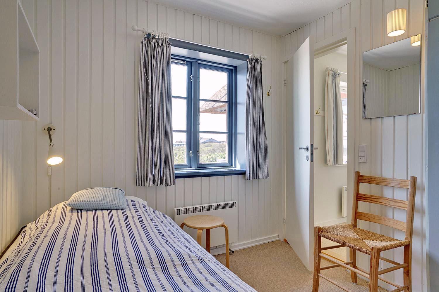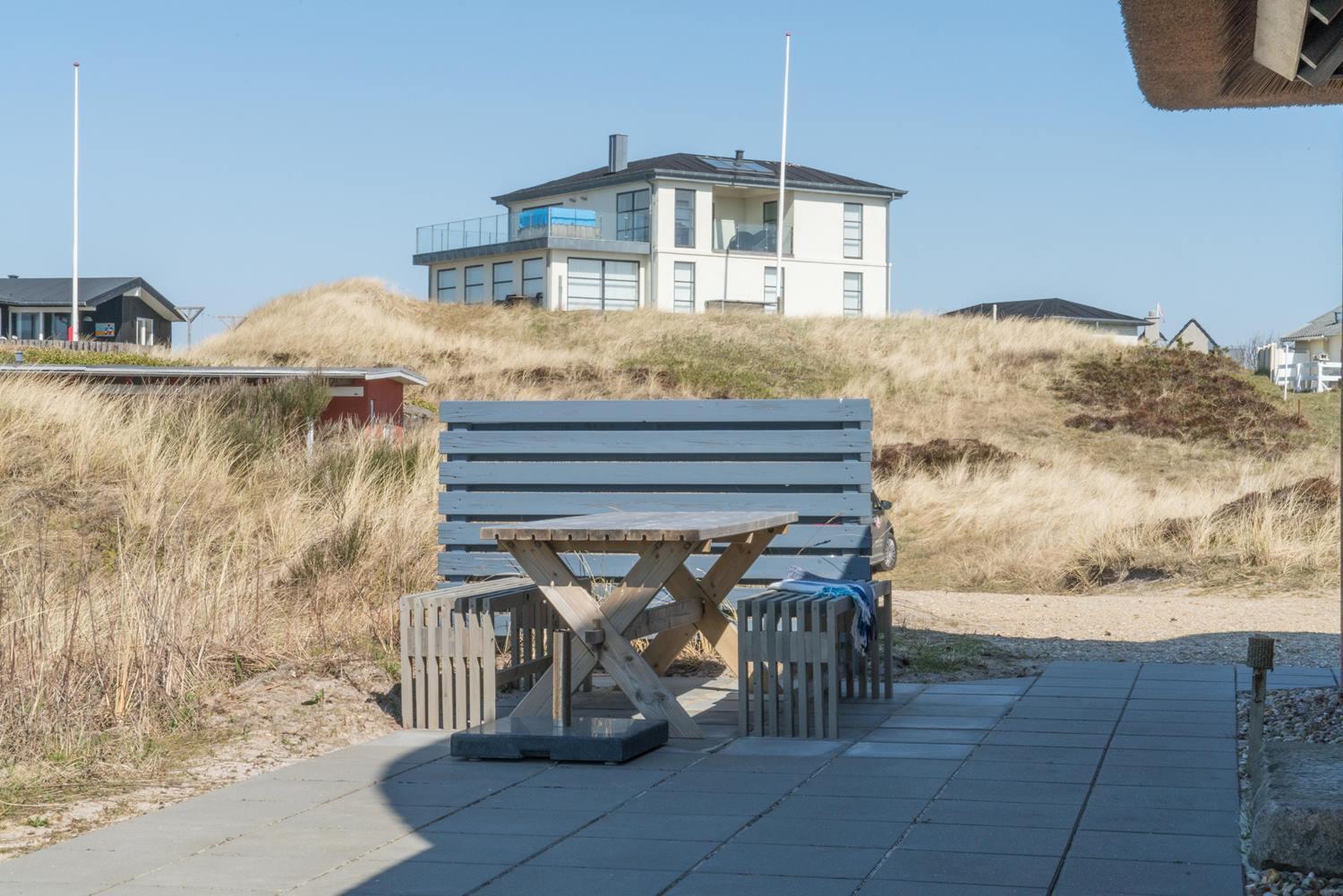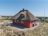 På en højtliggende naturgrund i rolige omgivelser og med fantastisk udsigt over Henne Strand og havet, ligger dette murede, stråtækte feriehus. Huset har et nyere flot køkken med gulvvarme, hyggelig og lys stue hvorfra udsigten over byen og havet kan nydes. Fra stuen er der udgang til skøn sydvendt træterrasse . På 1 sal finde man stort nyt soverum med dobbeltseng og 2 (barnesenge), det sidste soverum er i stueetagen. Huset egner sig kun til maks. 4 voksne - men der kan f.eks. godt være 4 voksne og 2 mindre børn...