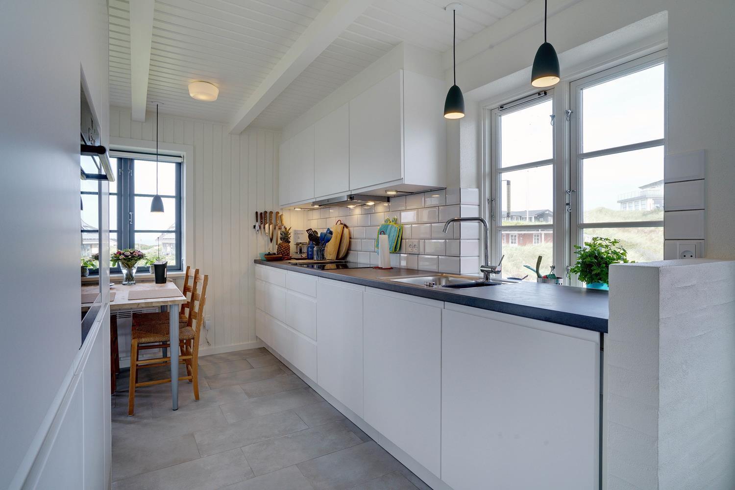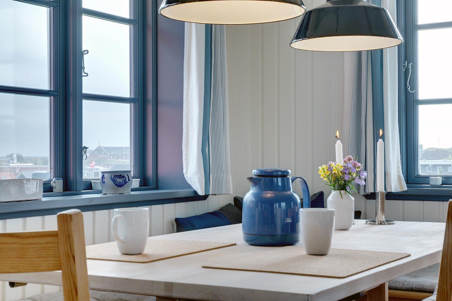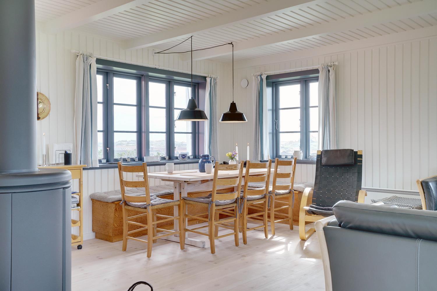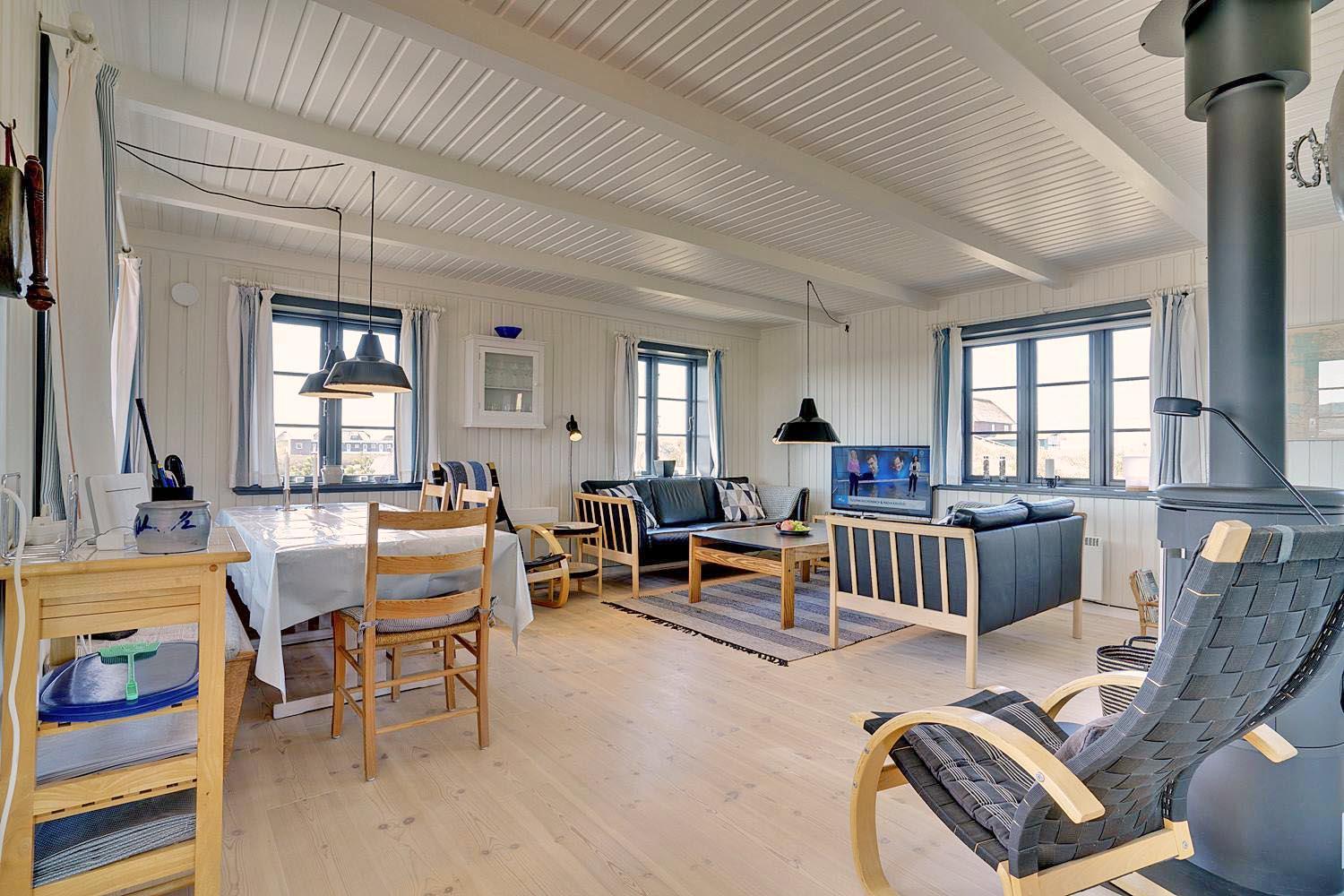 På en højtliggende naturgrund i rolige omgivelser og med fantastisk udsigt over Henne Strand og havet, ligger dette murede, stråtækte feriehus. Huset har et nyere flot køkken med gulvvarme, hyggelig og lys stue hvorfra udsigten over byen og havet kan nydes. Fra stuen er der udgang til skøn sydvendt træterrasse . På 1 sal finde man stort nyt soverum med dobbeltseng og 2 (barnesenge), det sidste soverum er i stueetagen. Huset egner sig kun til maks. 4 voksne - men der kan f.eks. godt være 4 voksne og 2 mindre børn...