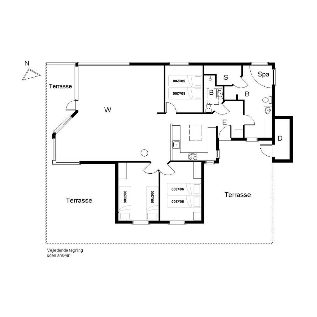 Sengestørrelse: 1 dobbeltseng med 2 madrasser 90 x 200 cm + 1 dobbeltseng med 2 madrasser 80 x 200 cm + 2 enkeltsenge 90 x 200 cm.