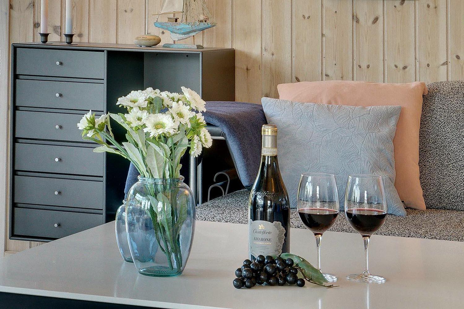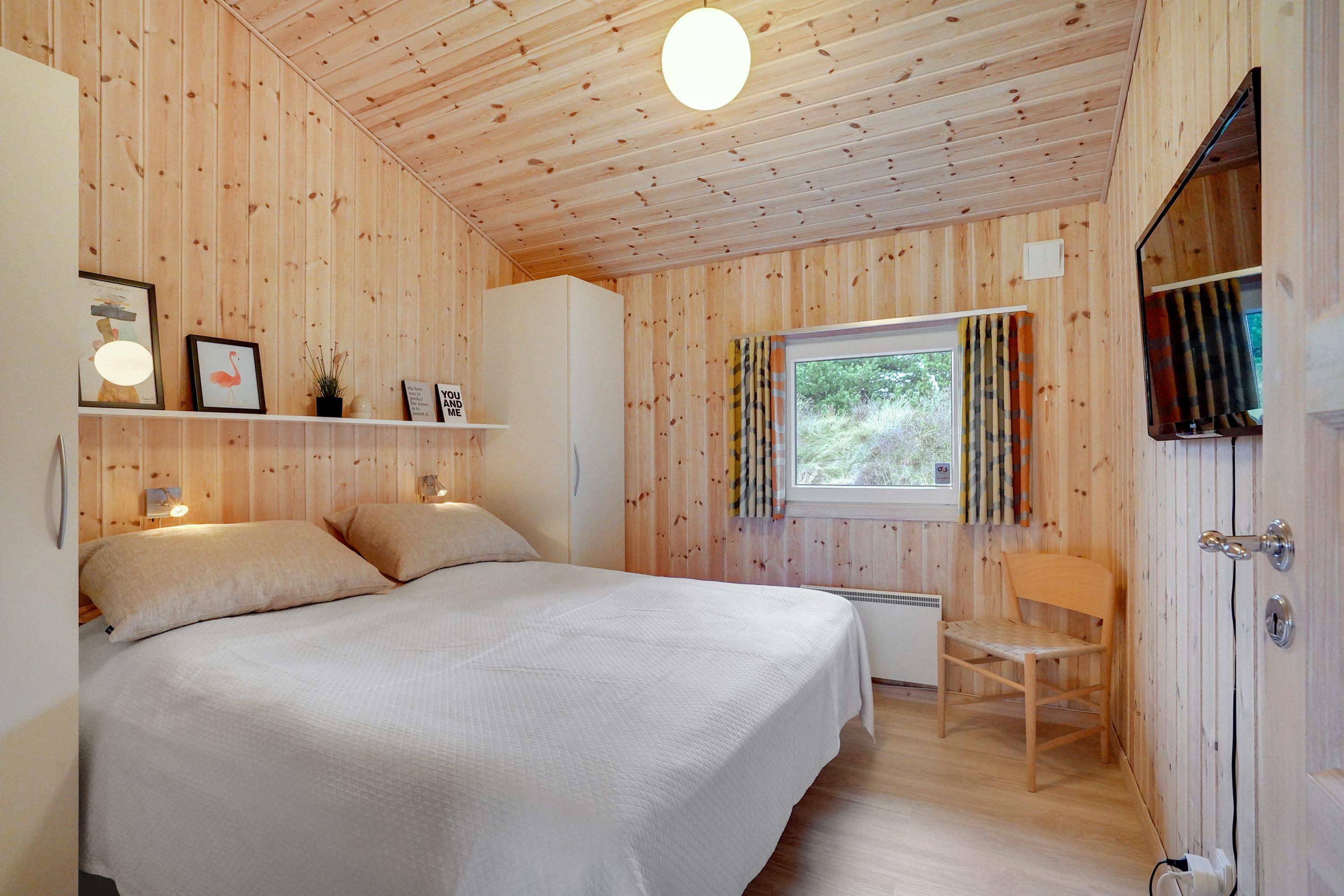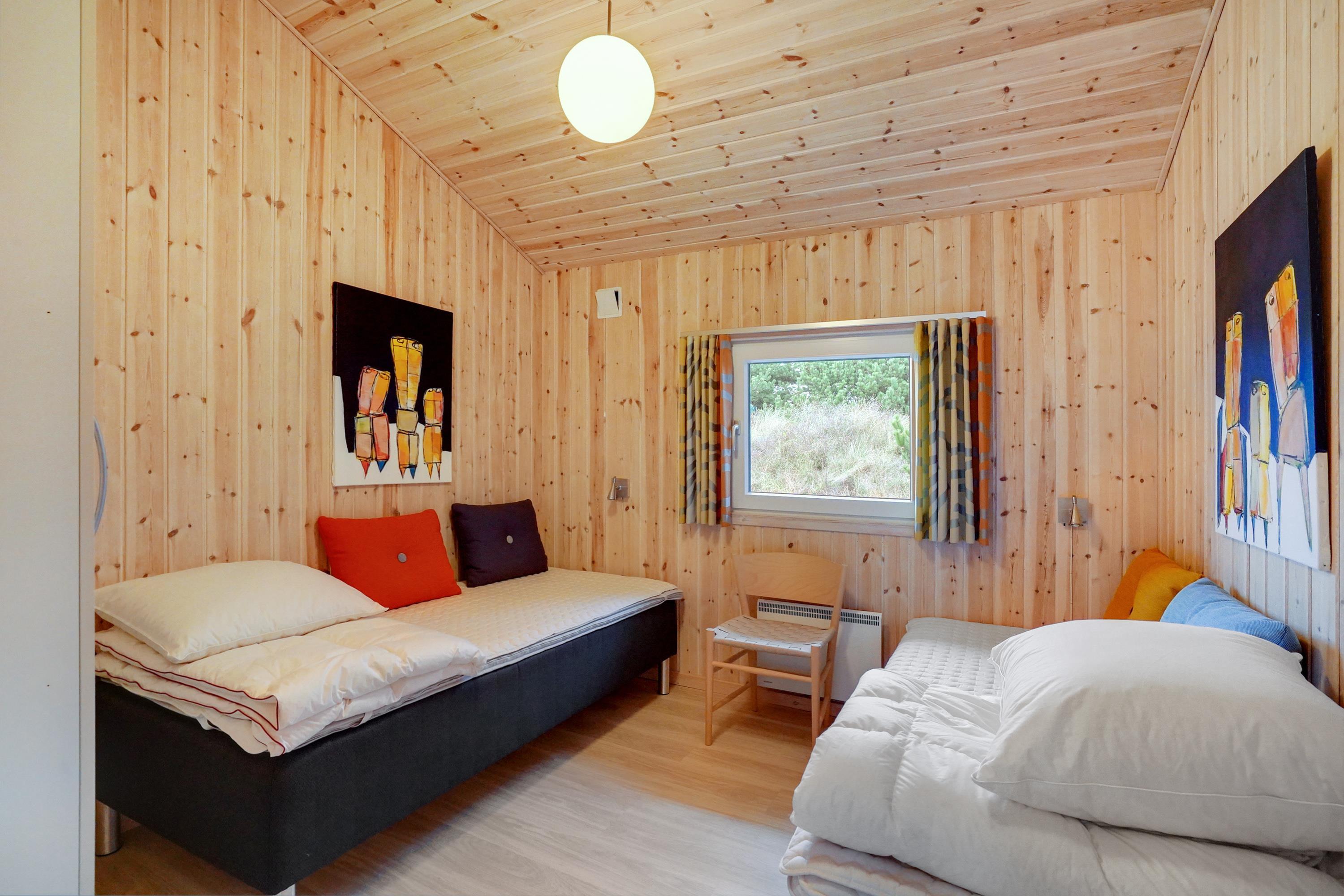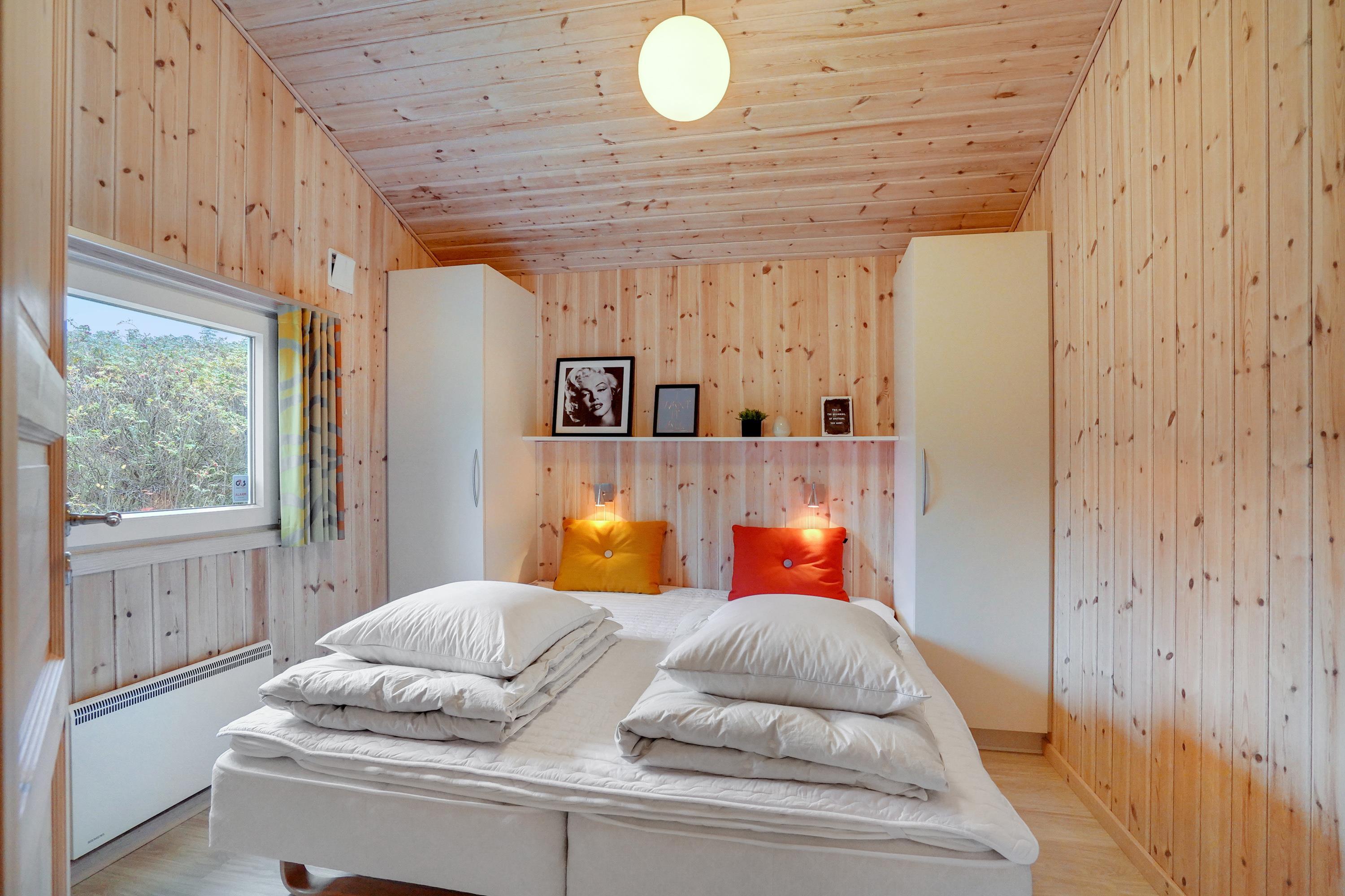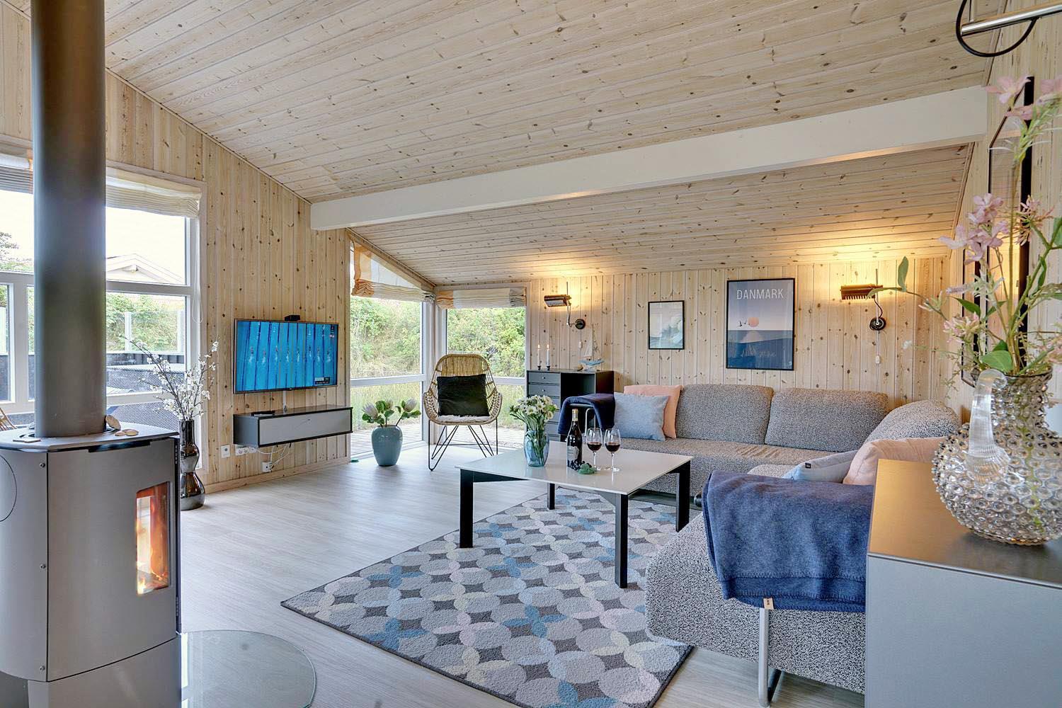 Stressniveauet falder straks, når I bevæger jer ind i sommerhusets store, sammenhængende, højloftede opholdsrum. Her er både gulvvarme og brændeovn, og interiøret er i stilrent design. Der er plads til seks overnattende gæster, som alle kommer til at ligge behageligt fordelt i tre soveværelser, hvoraf de to har dobbeltsenge. Huset byder herudover på badeværelse, gæstetoilet og et depotrum.
