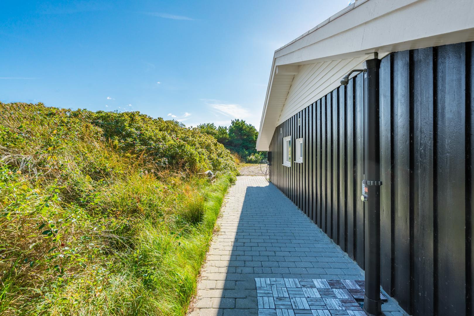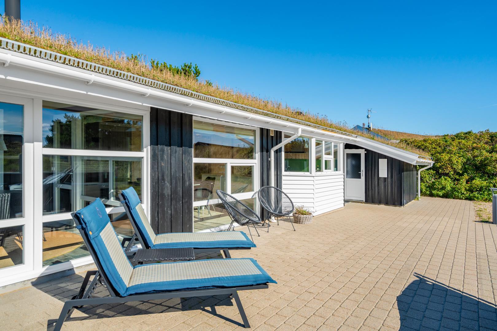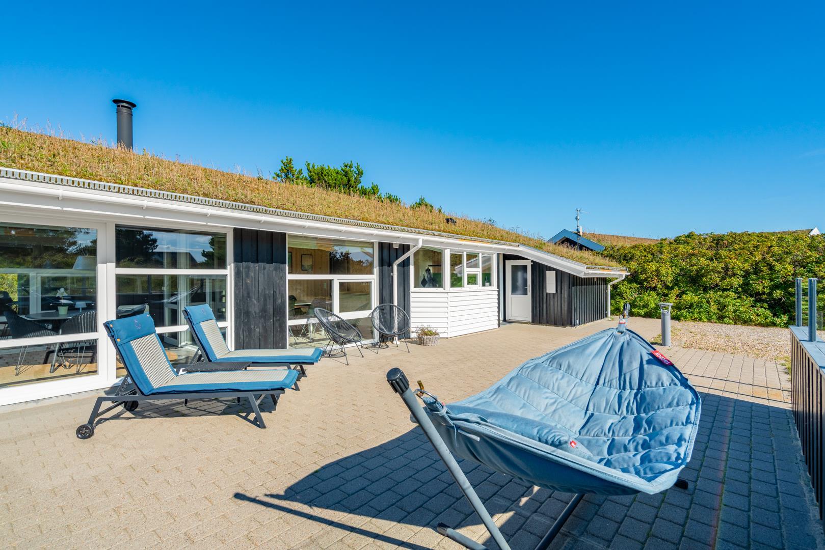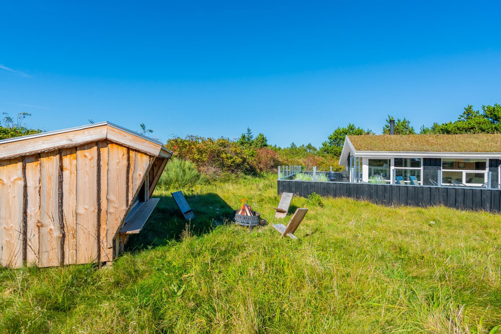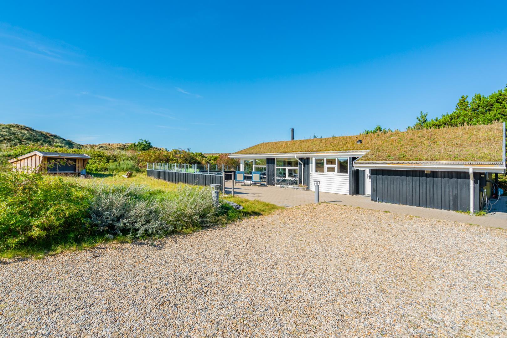Huset ligger på en fredelig grund med udsigt til bløde klitter. Naturen er således lige udenfor døren, og der er rig mulighed for at opleve de grønklædte klitter, åbne hedelandskaber og skovens dybe stille ro. Desunden findes der en shelter med 4 sovepladser. Gåturen til stranden og Strandvejens butikker og spisesteder tager desuden knap et kvarter, og der er blot tre kilometer til Henne Golfklub.