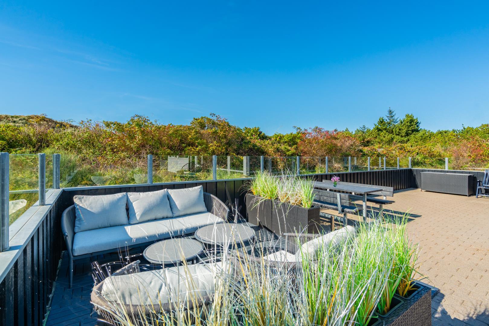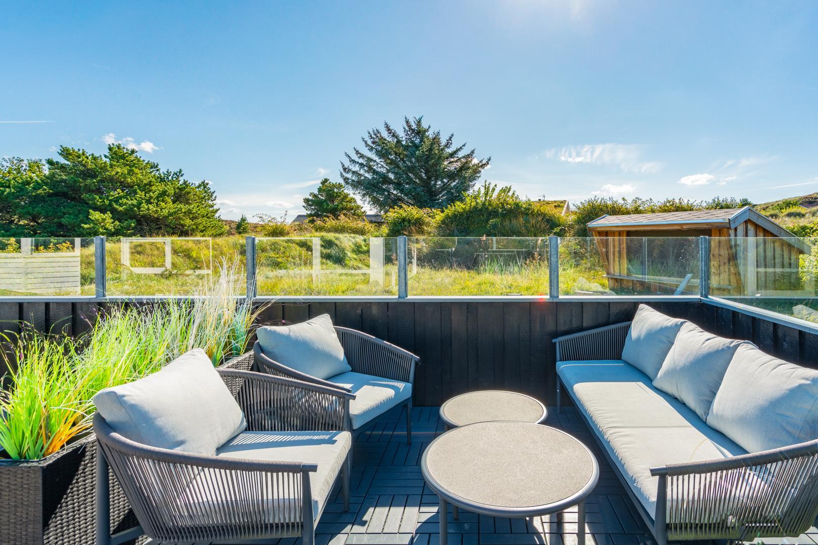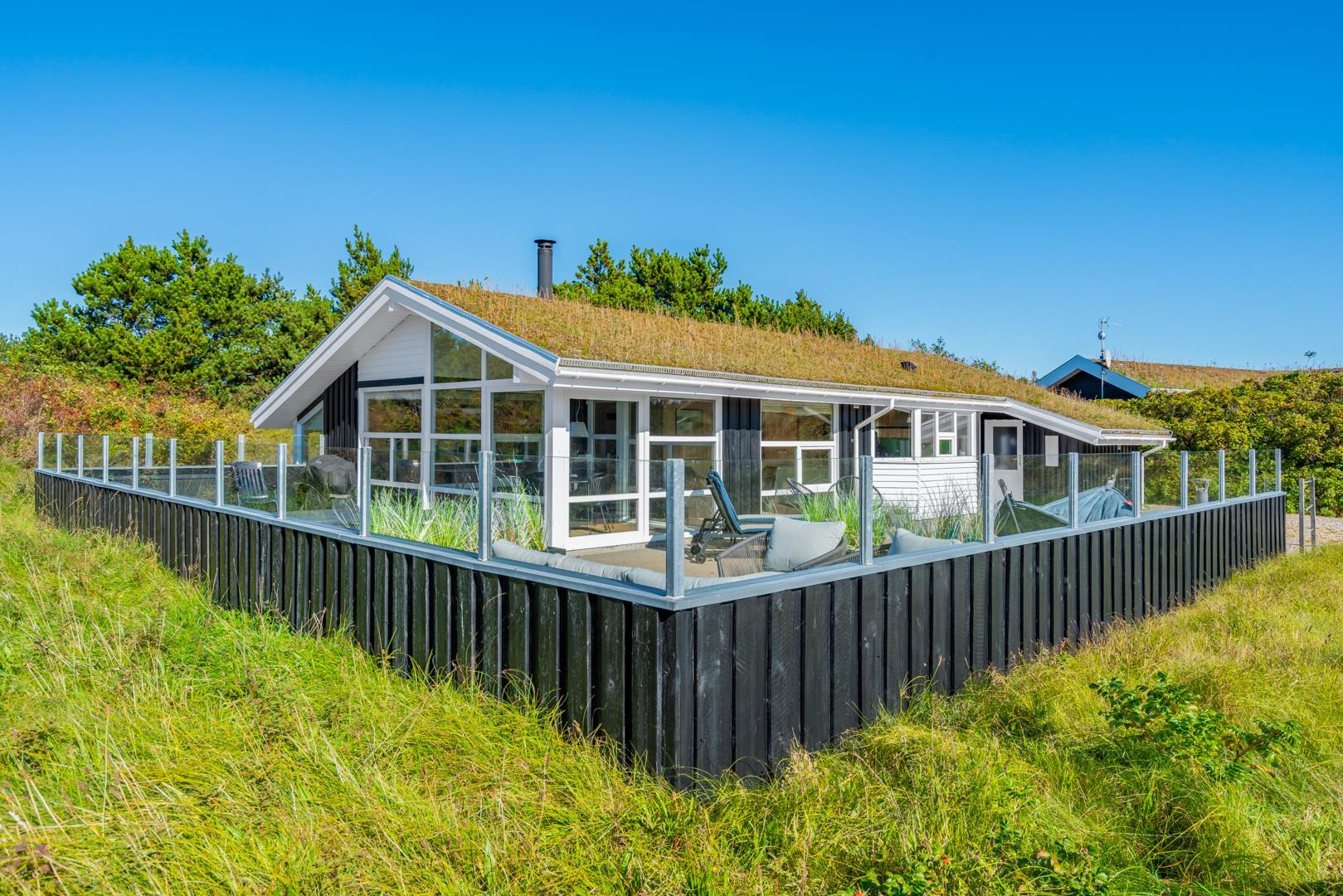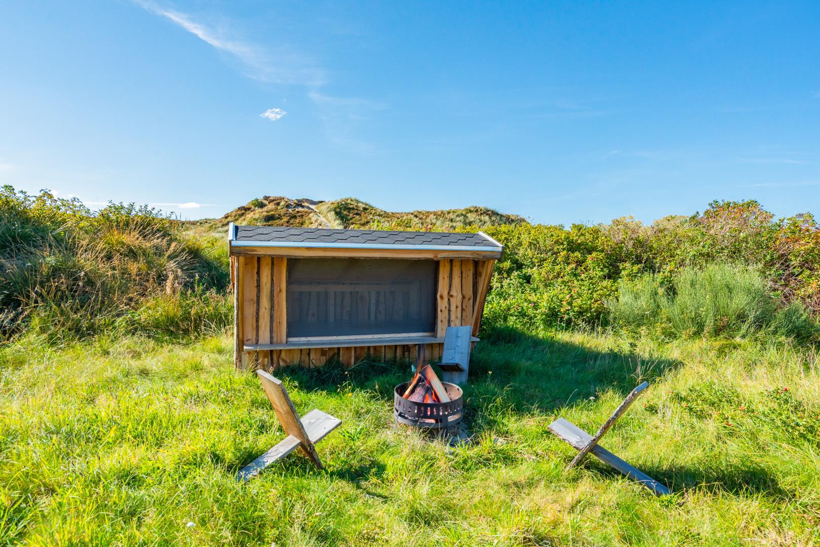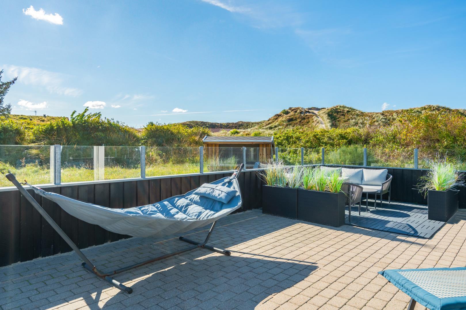 Huset ligger på en fredelig grund med udsigt til bløde klitter. Naturen er således lige udenfor døren, og der er rig mulighed for at opleve de grønklædte klitter, åbne hedelandskaber og skovens dybe stille ro. Desunden findes der en shelter med 4 sovepladser. Gåturen til stranden og Strandvejens butikker og spisesteder tager desuden knap et kvarter, og der er blot tre kilometer til Henne Golfklub.