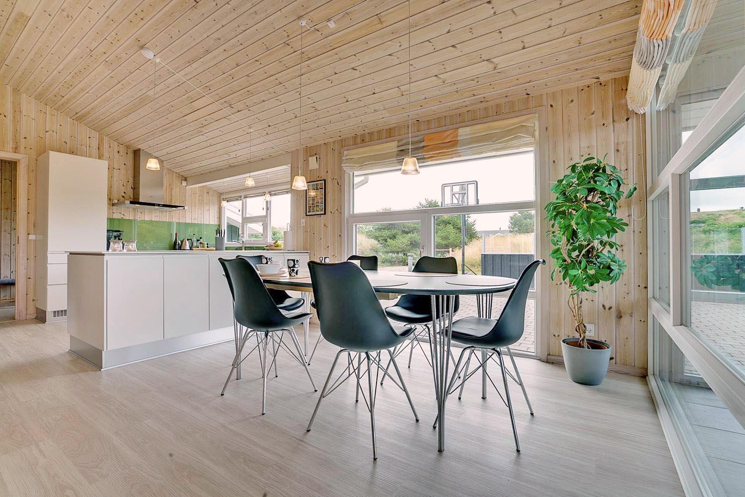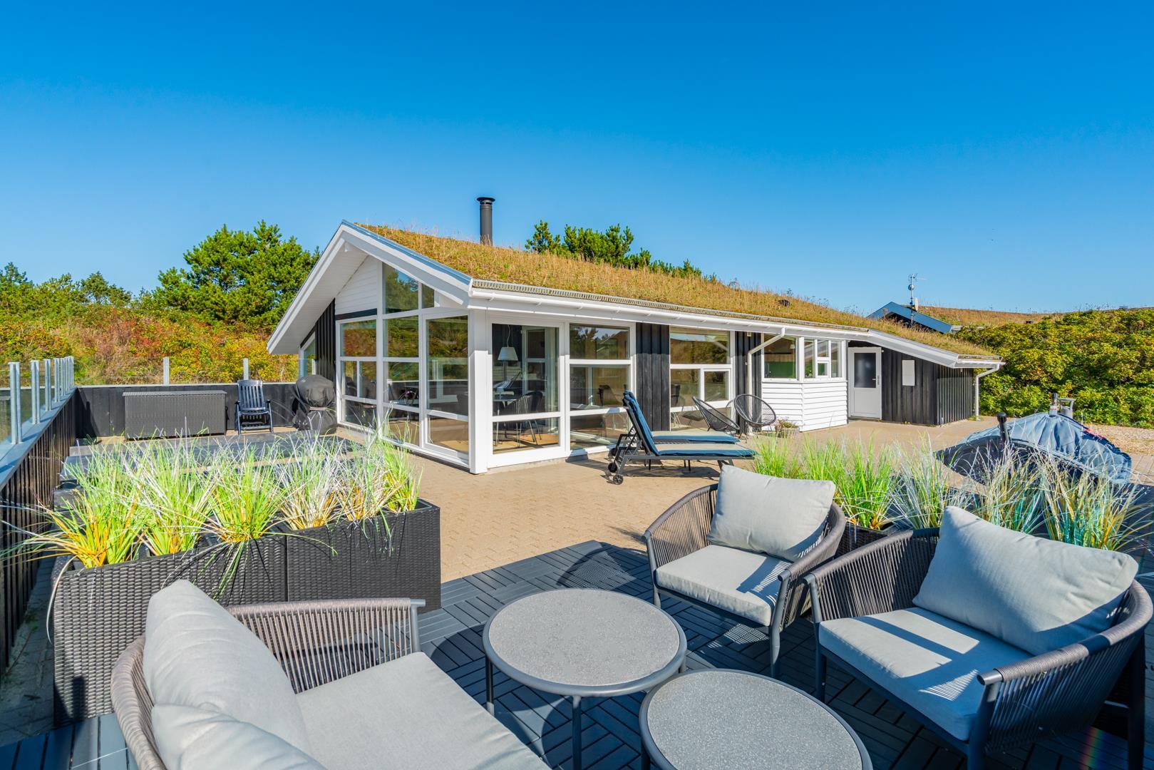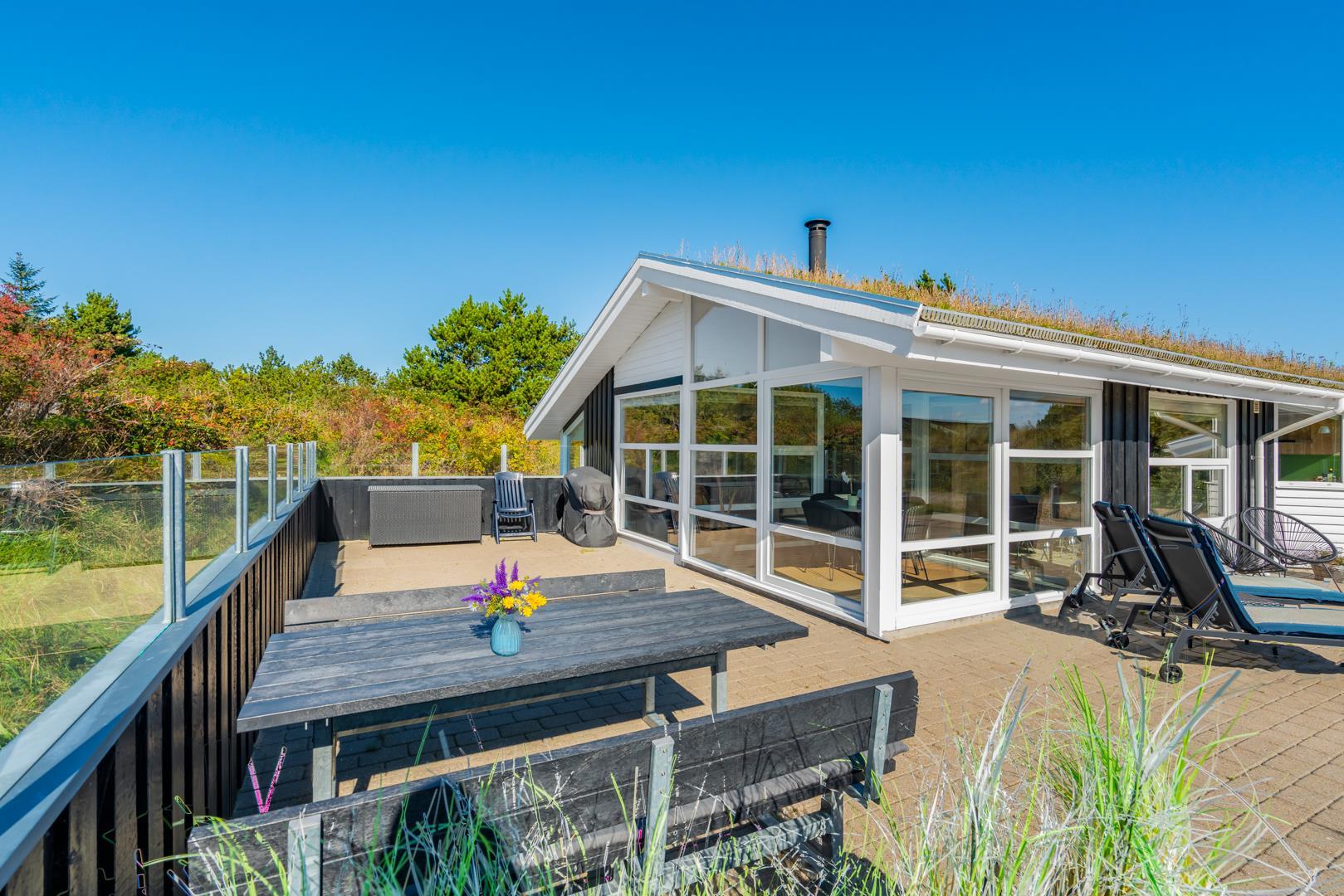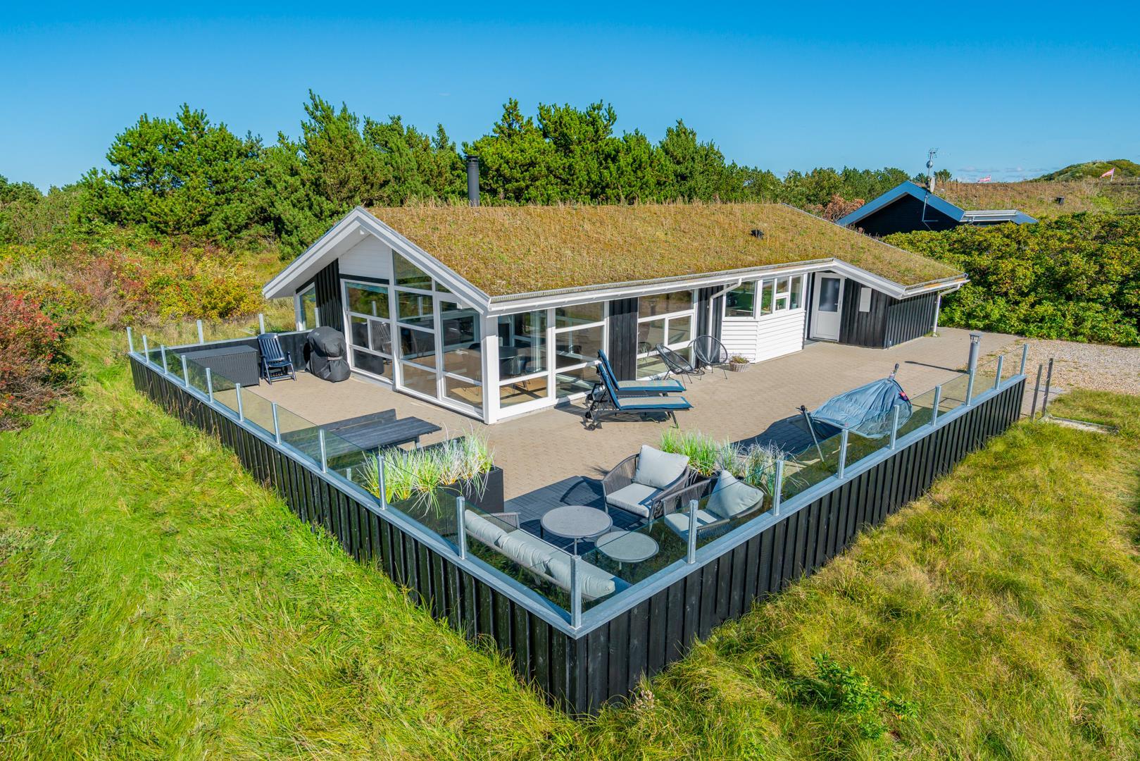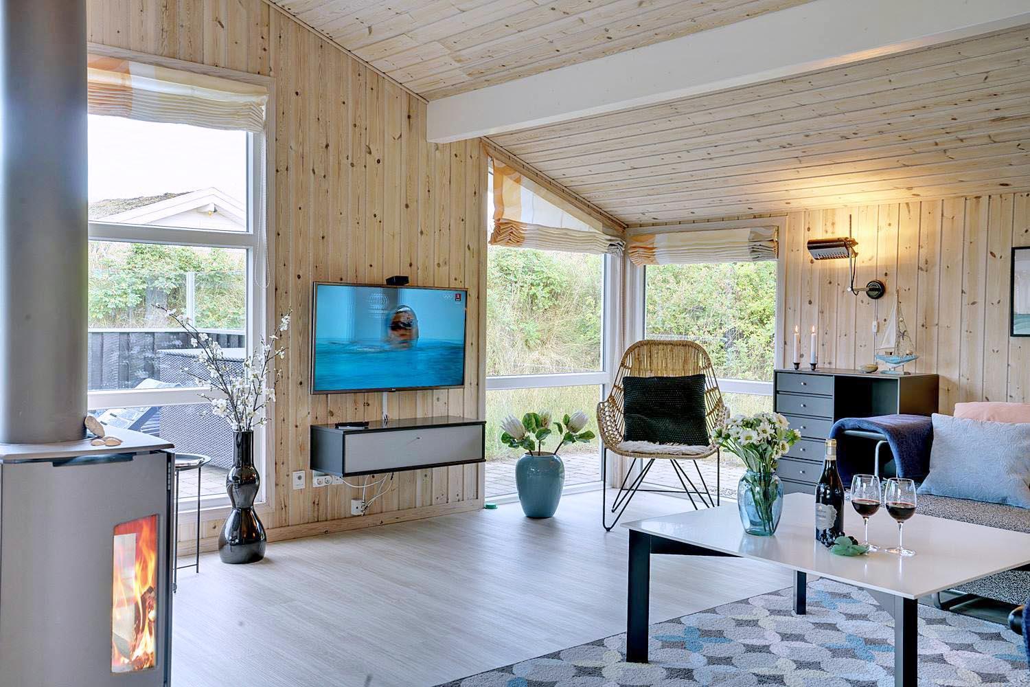 Lyset strømmer ind gennem store glaspartier i dette skønne feriehus i Henne. Huset er netop blevet moderniseret i 2020, og det står klar med spa, sauna, brændeovn og masser af hygge, så du kan invitere dine nærmeste på en ferie med masser af mindeværdige oplevelser.