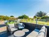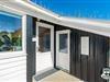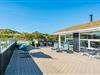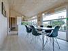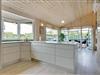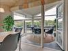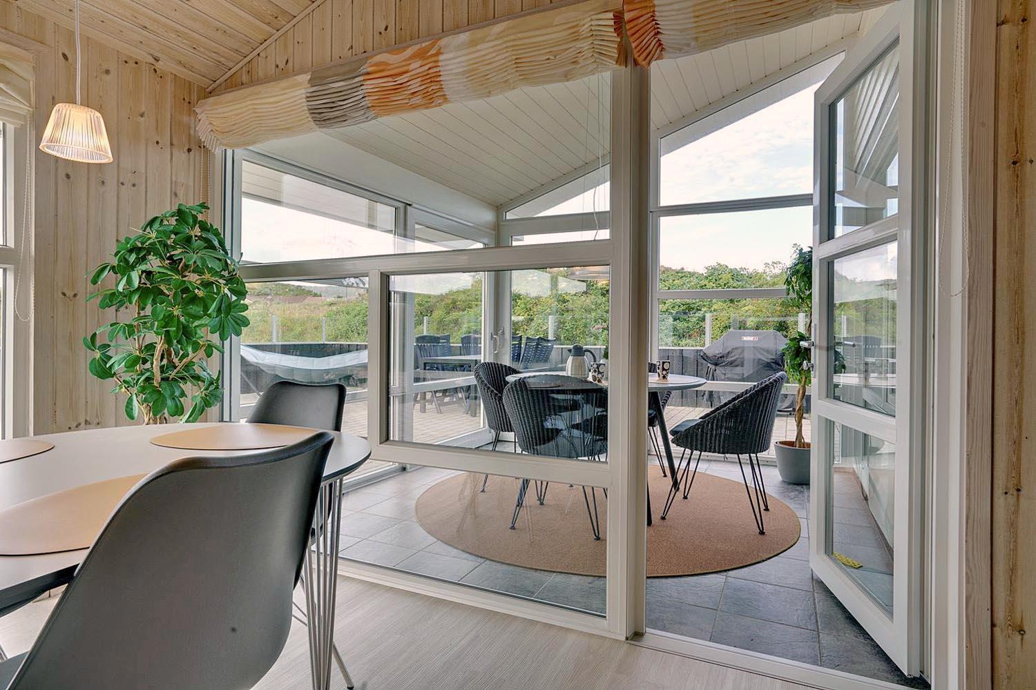 Døren i et af opholdsrummets mange glaspartier fører dig direkte videre til en lys udestue, og er det sommer, kan du skyde døren til side herude også, og skabe åben forbindelse helt ud på husets kæmpestore terrasse.