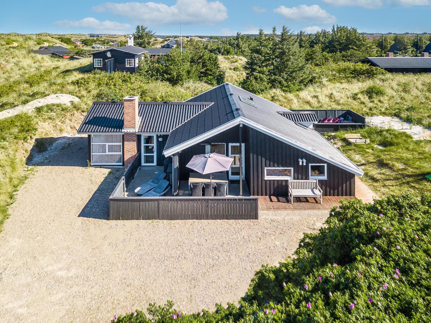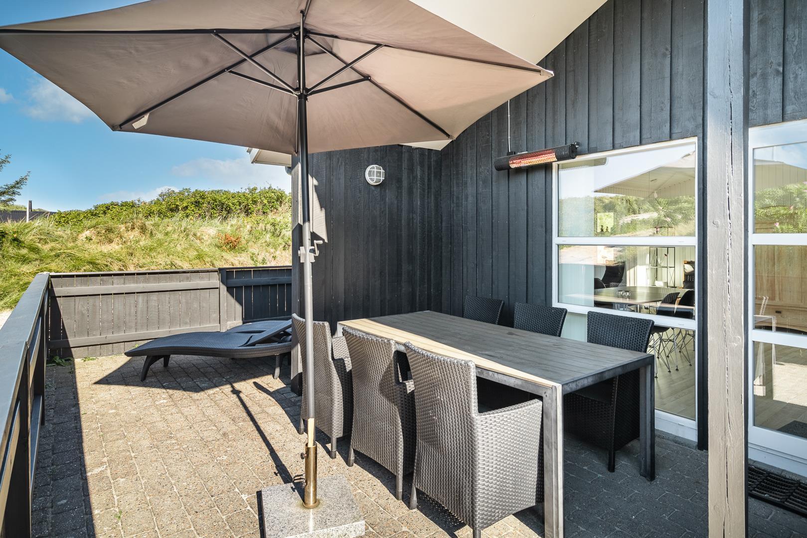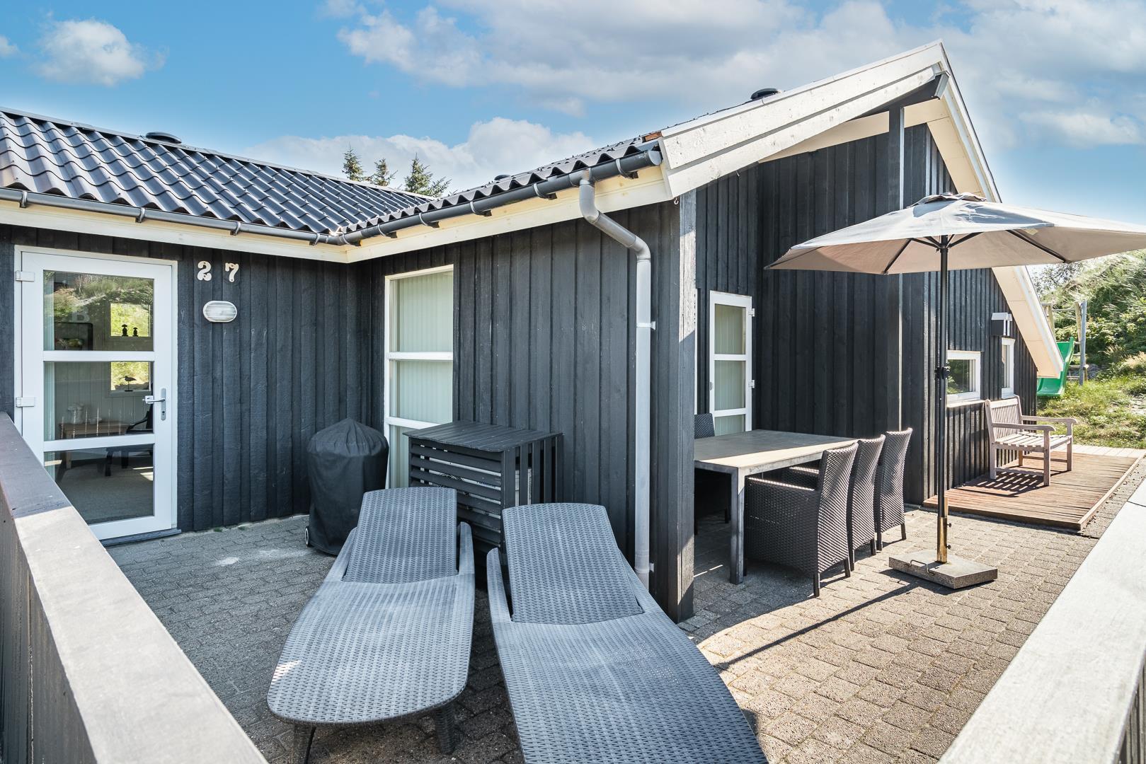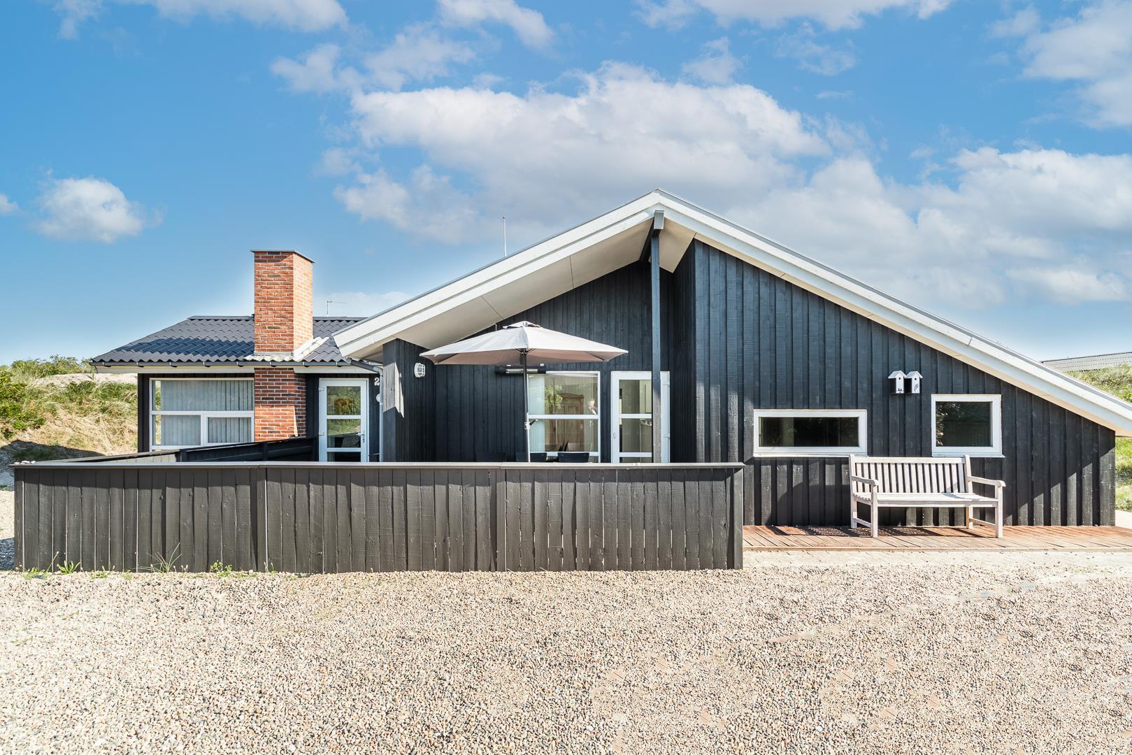 Hyggeligt renoveret feriehus i rolige omgivelser nær Henne Strand med sauna og flere terrasser.