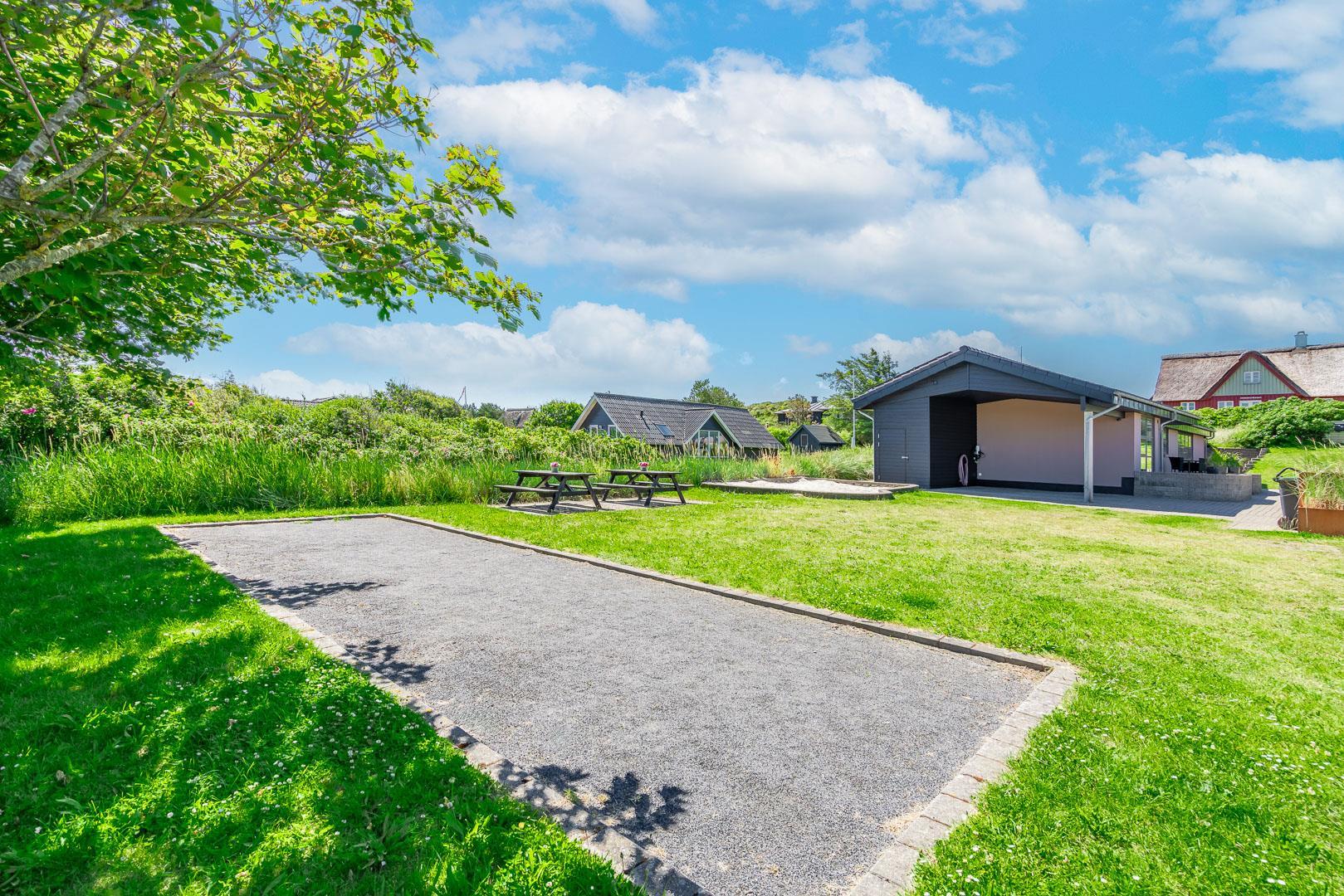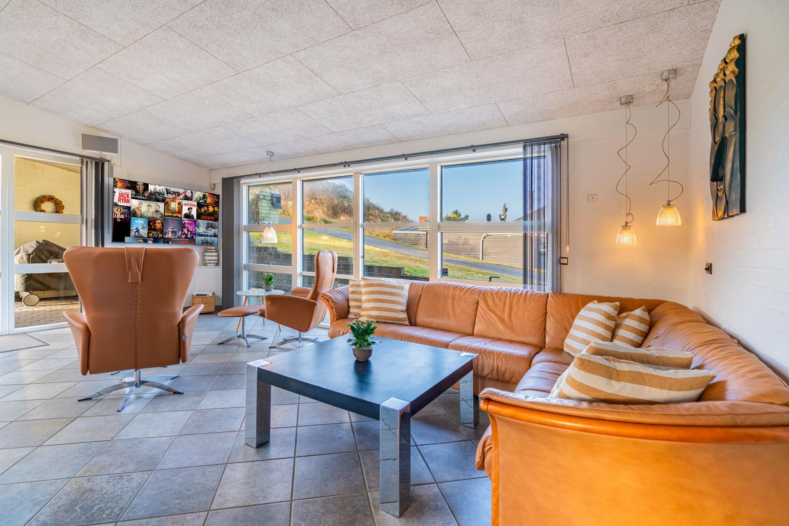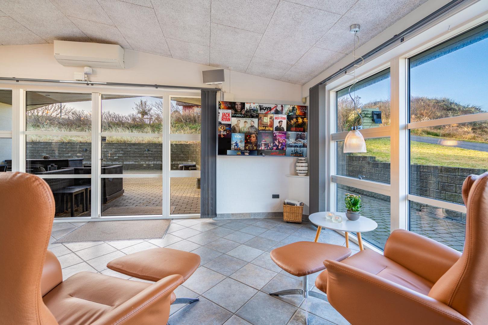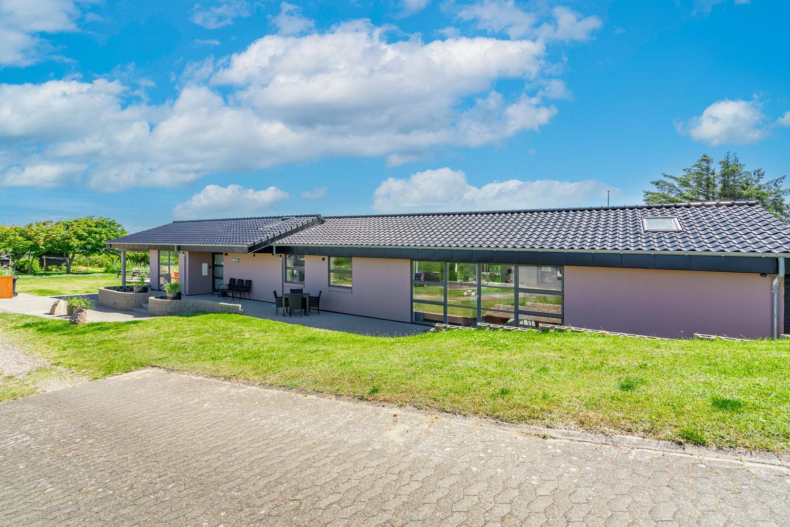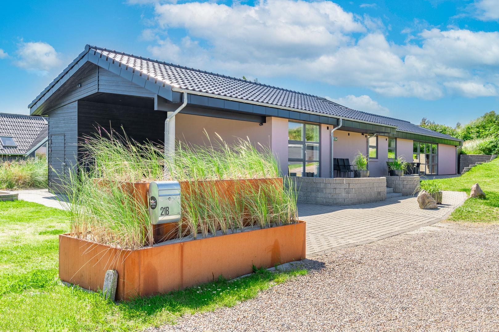 Lækkert luksus feriehus med alt hvad hjertet begære af faciliteter, beliggende på skøn naturgrund helt tæt på Henne strand centrum og få minutters gang til den dejligste sandstrand. Huset indeholder stort lækkert, veludstyret køkken & stue med stort 65" fladskærms Smart TV, SONOS Sound System Play-5 til afspilning deres egen musik via tablet eller mobil. Herudover 5 soveværelser med dobbeltsenge, faste skabe og alle værelser med 43" fladskærms TV. Huset er velmøbleret og overalt belagt med Italienske klinker med energibesparende gulvvarme fra jordvarmeanlæg, lofter er ført til kip overalt i huset. 2 lækre badeværelser, 1 med wc, spa og bruser samt 1 med wc, bruser og direkte adgang til sauna, begge badeværelser og opholdsrum er med indbygget elektriske vinduer i taget der giver et dejligt naturligt lysindfald. Flere lækre og læfulde terrasser omkring huset, 1 stor overdækket og total ugeneret terrasse ud fra stuen af huset hvor man kan nyde solen i liggestole, bruse sig under udendørs bruser med V+K vand, forberede en hyggelig grillaften. Eller tag et spil petanque på egen bane eller et spil dart i hyggelige omgivelser på terrassen, legehjørne med stor sandkasse. Et superlækkert luksushus hvor rammerne er til stede for en rigtig god ferie med familien - hele året.