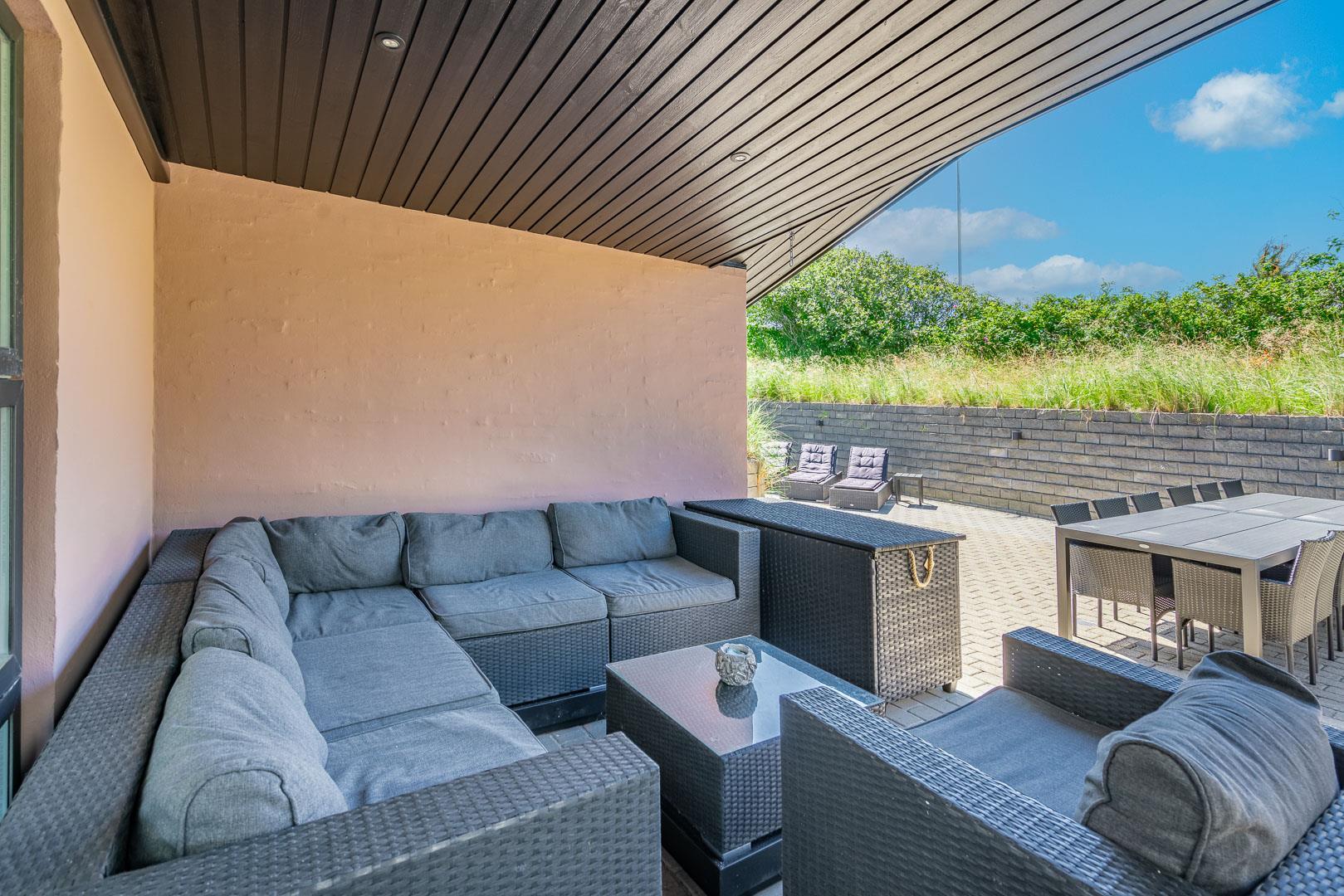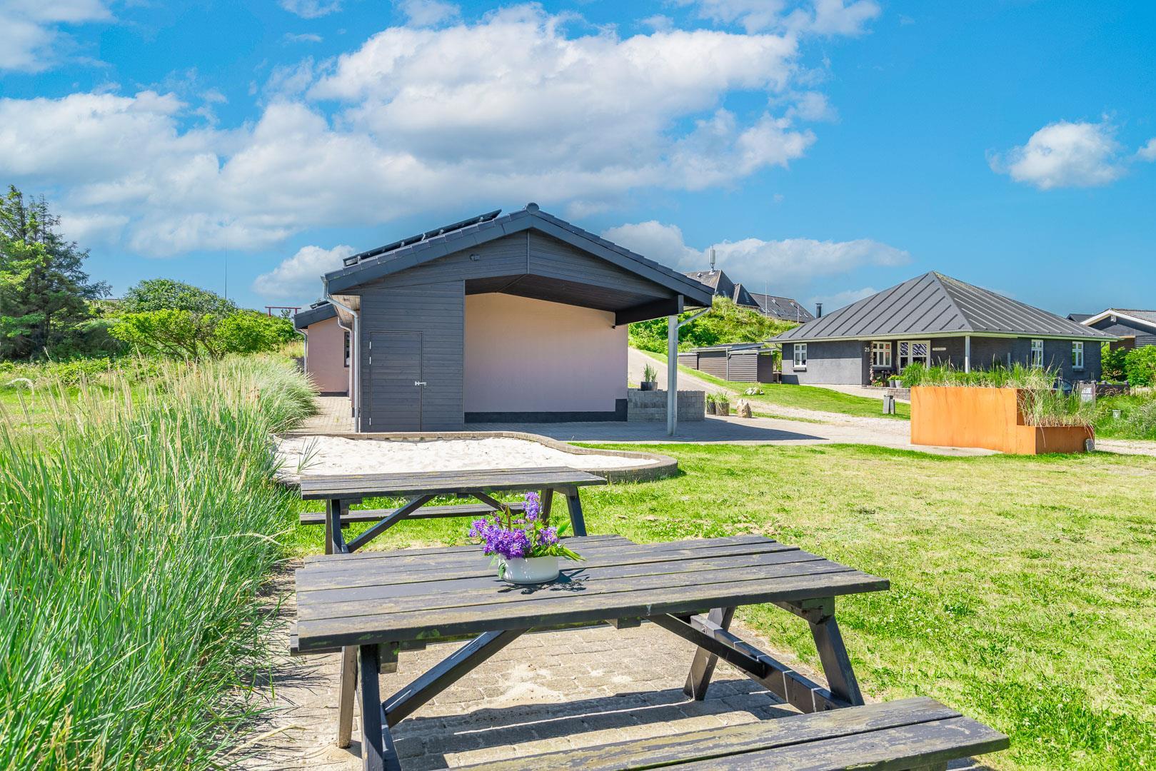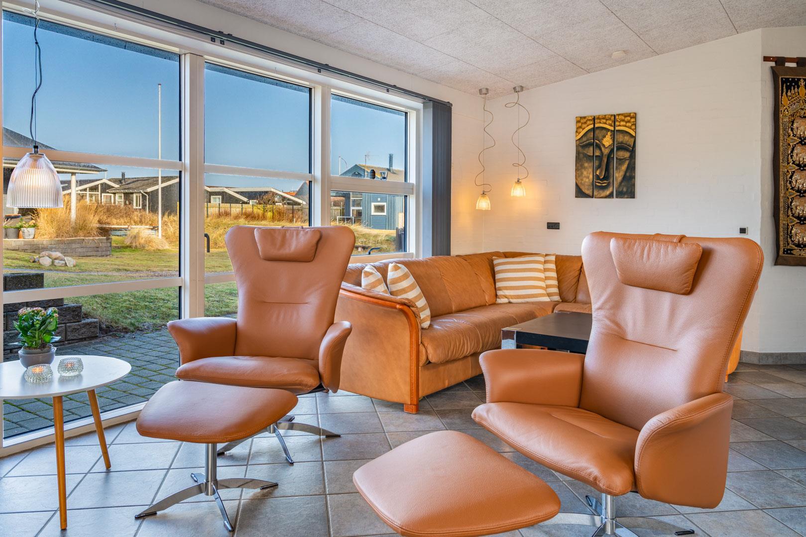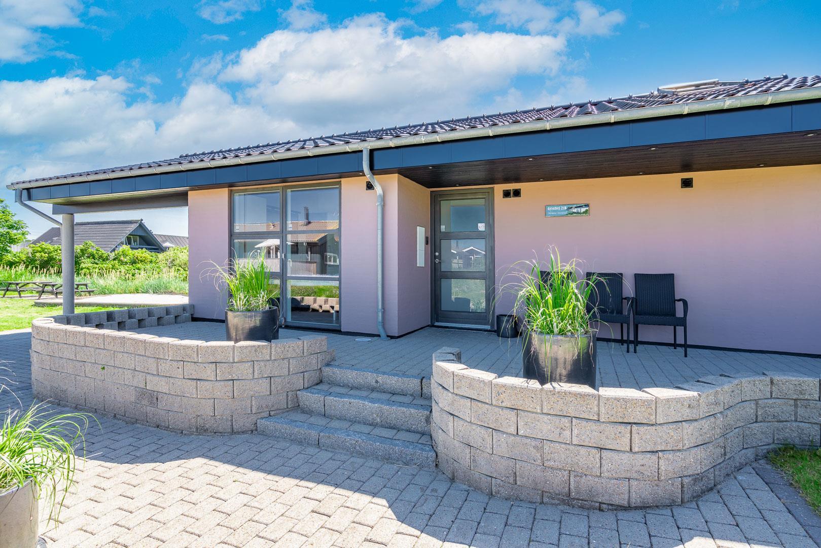 Lækkert luksus feriehus med alt hvad hjertet begære af faciliteter, beliggende på skøn naturgrund helt tæt på Henne strand centrum og få minutters gang til den dejligste sandstrand. Huset indeholder stort lækkert, veludstyret køkken & stue med stort 65" fladskærms Smart TV, SONOS Sound System Play-5 til afspilning deres egen musik via tablet eller mobil. Herudover 5 soveværelser med dobbeltsenge, faste skabe og alle værelser med 43" fladskærms TV. Huset er velmøbleret og overalt belagt med Italienske klinker med energibesparende gulvvarme fra jordvarmeanlæg, lofter er ført til kip overalt i huset. 2 lækre badeværelser, 1 med wc, spa og bruser samt 1 med wc, bruser og direkte adgang til sauna, begge badeværelser og opholdsrum er med indbygget elektriske vinduer i taget der giver et dejligt naturligt lysindfald. Flere lækre og læfulde terrasser omkring huset, 1 stor overdækket og total ugeneret terrasse ud fra stuen af huset hvor man kan nyde solen i liggestole, bruse sig under udendørs bruser med V+K vand, forberede en hyggelig grillaften. Eller tag et spil petanque på egen bane eller et spil dart i hyggelige omgivelser på terrassen, legehjørne med stor sandkasse. Et superlækkert luksushus hvor rammerne er til stede for en rigtig god ferie med familien - hele året.