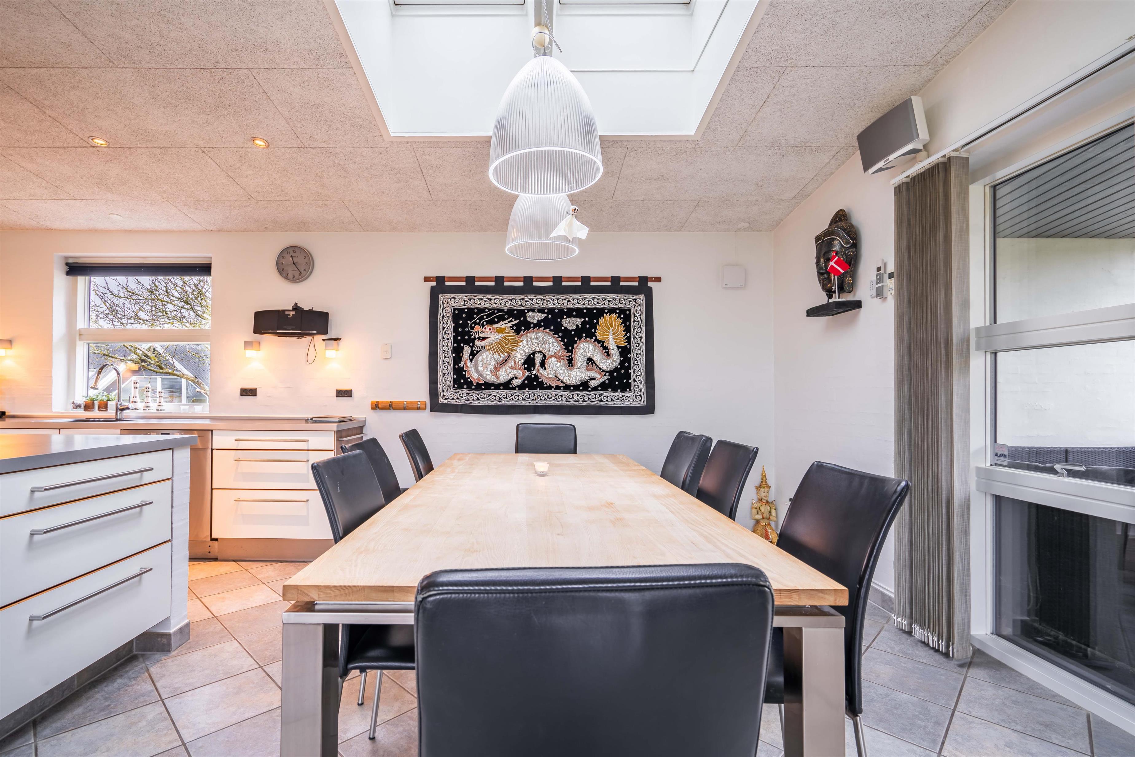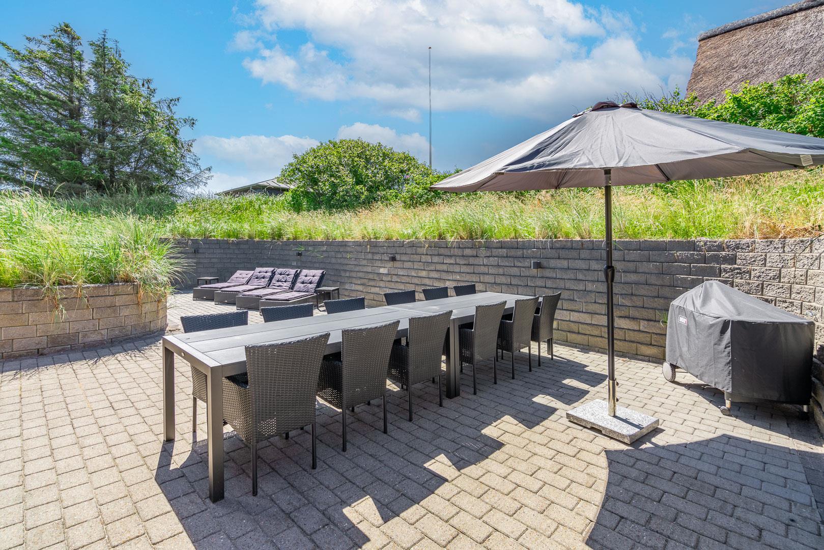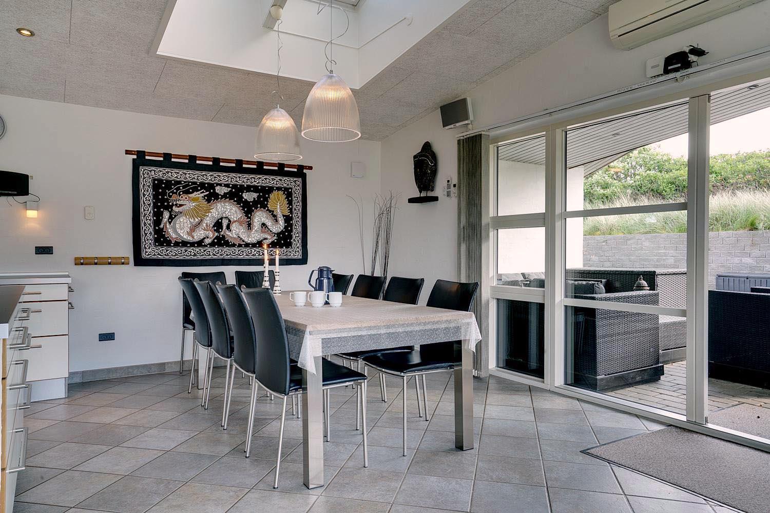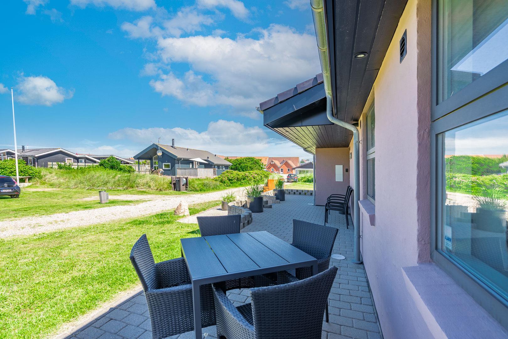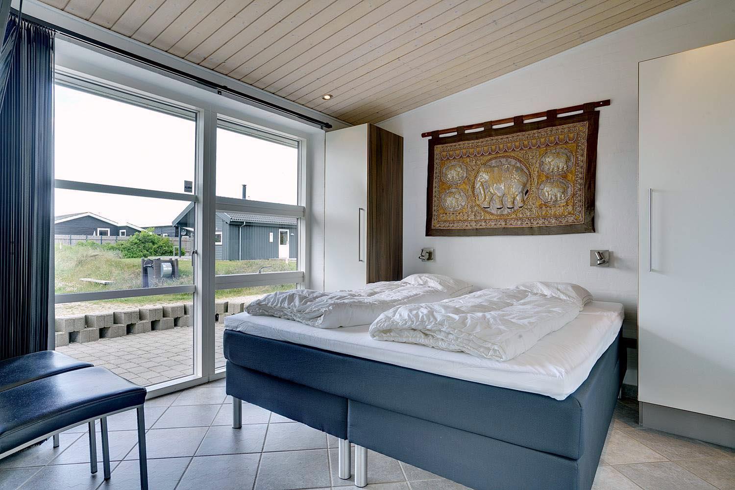 Lækkert luksus feriehus med alt hvad hjertet begære af faciliteter, beliggende på skøn naturgrund helt tæt på Henne strand centrum og få minutters gang til den dejligste sandstrand. Huset indeholder stort lækkert, veludstyret køkken & stue med stort 65" fladskærms Smart TV, SONOS Sound System Play-5 til afspilning deres egen musik via tablet eller mobil. Herudover 5 soveværelser med dobbeltsenge, faste skabe og alle værelser med 43" fladskærms TV. Huset er velmøbleret og overalt belagt med Italienske klinker med energibesparende gulvvarme fra jordvarmeanlæg, lofter er ført til kip overalt i huset. 2 lækre badeværelser, 1 med wc, spa og bruser samt 1 med wc, bruser og direkte adgang til sauna, begge badeværelser og opholdsrum er med indbygget elektriske vinduer i taget der giver et dejligt naturligt lysindfald. Flere lækre og læfulde terrasser omkring huset, 1 stor overdækket og total ugeneret terrasse ud fra stuen af huset hvor man kan nyde solen i liggestole, bruse sig under udendørs bruser med V+K vand, forberede en hyggelig grillaften. Eller tag et spil petanque på egen bane eller et spil dart i hyggelige omgivelser på terrassen, legehjørne med stor sandkasse. Et superlækkert luksushus hvor rammerne er til stede for en rigtig god ferie med familien - hele året.