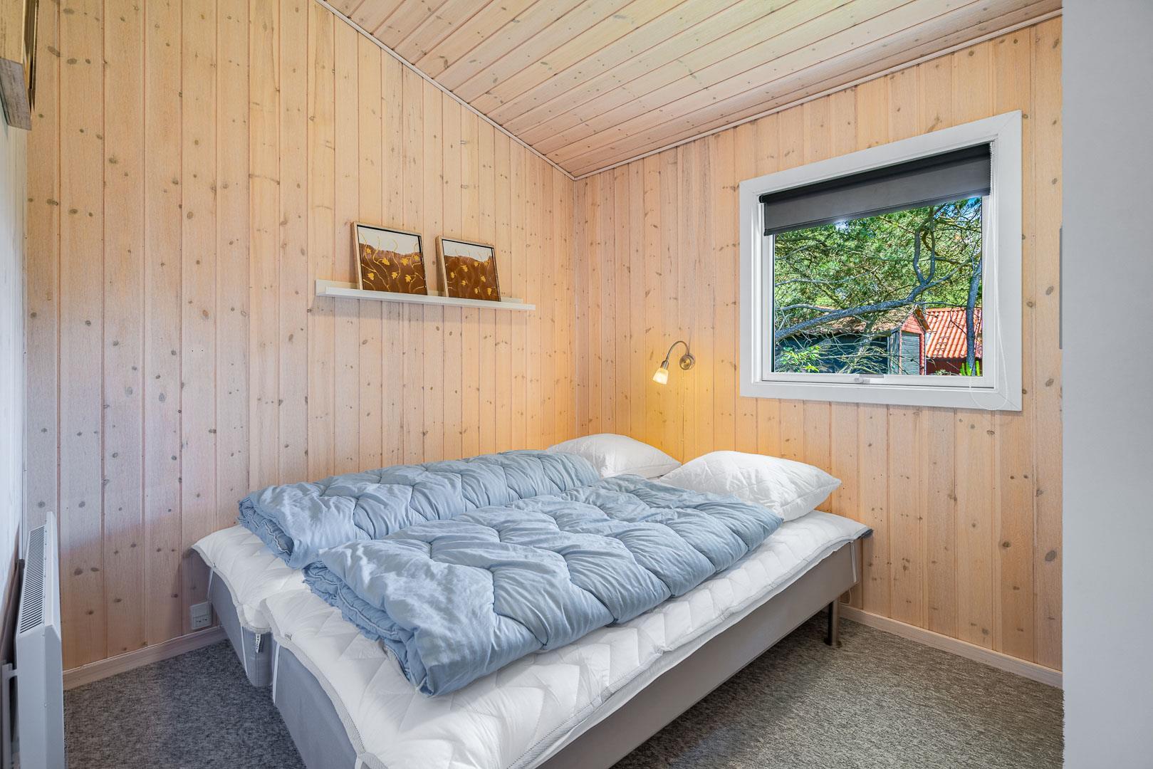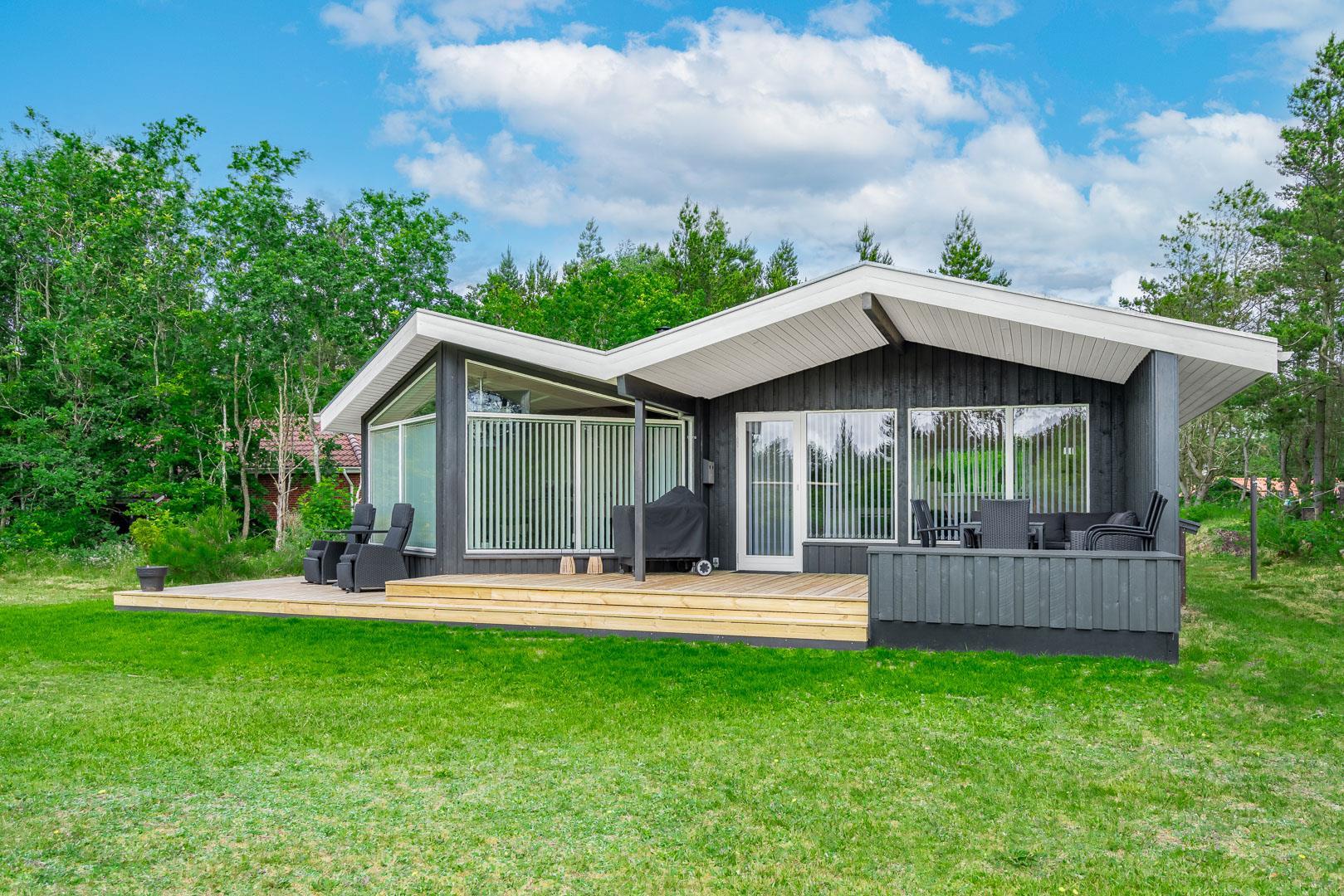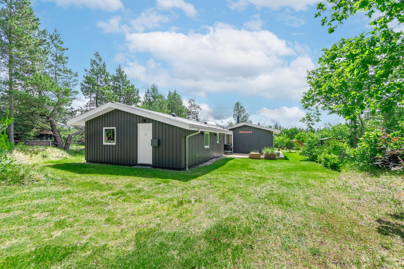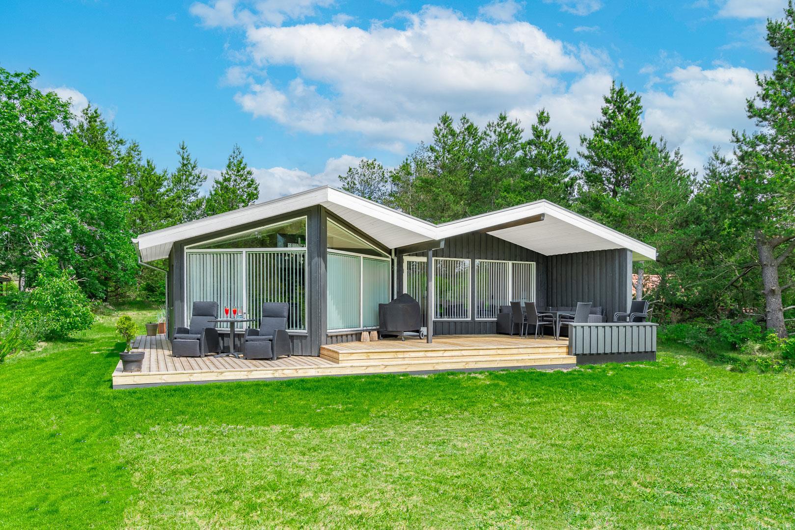 På en ugeneret og børnevenlig naturgrund omkranset af træer ligger dette hyggelige og lyst indrettede feriehus. Til huset hører stor, sydvendt, overdækket terrasse samt 2 åbne terrasser. Stor stue med dejligt lysindfald. 2 badeværelser med bruser og i det ene også badekar. Stort, veludstyret køkken/alrum. komfur med keramiske kogeplader. Gratis internetforbindelse . 3 soverum med dobbeltsenge. Barneseng, høj barnestol, gynge og sandkasse til børnene. Ingen husdyr tilladt.