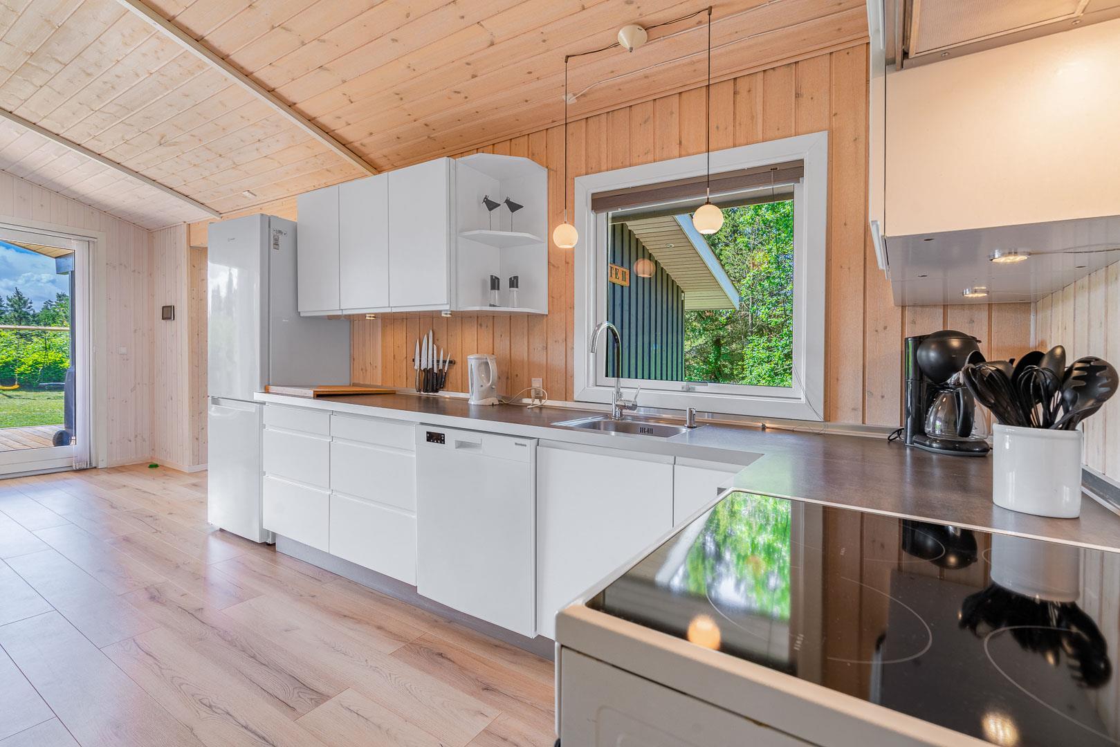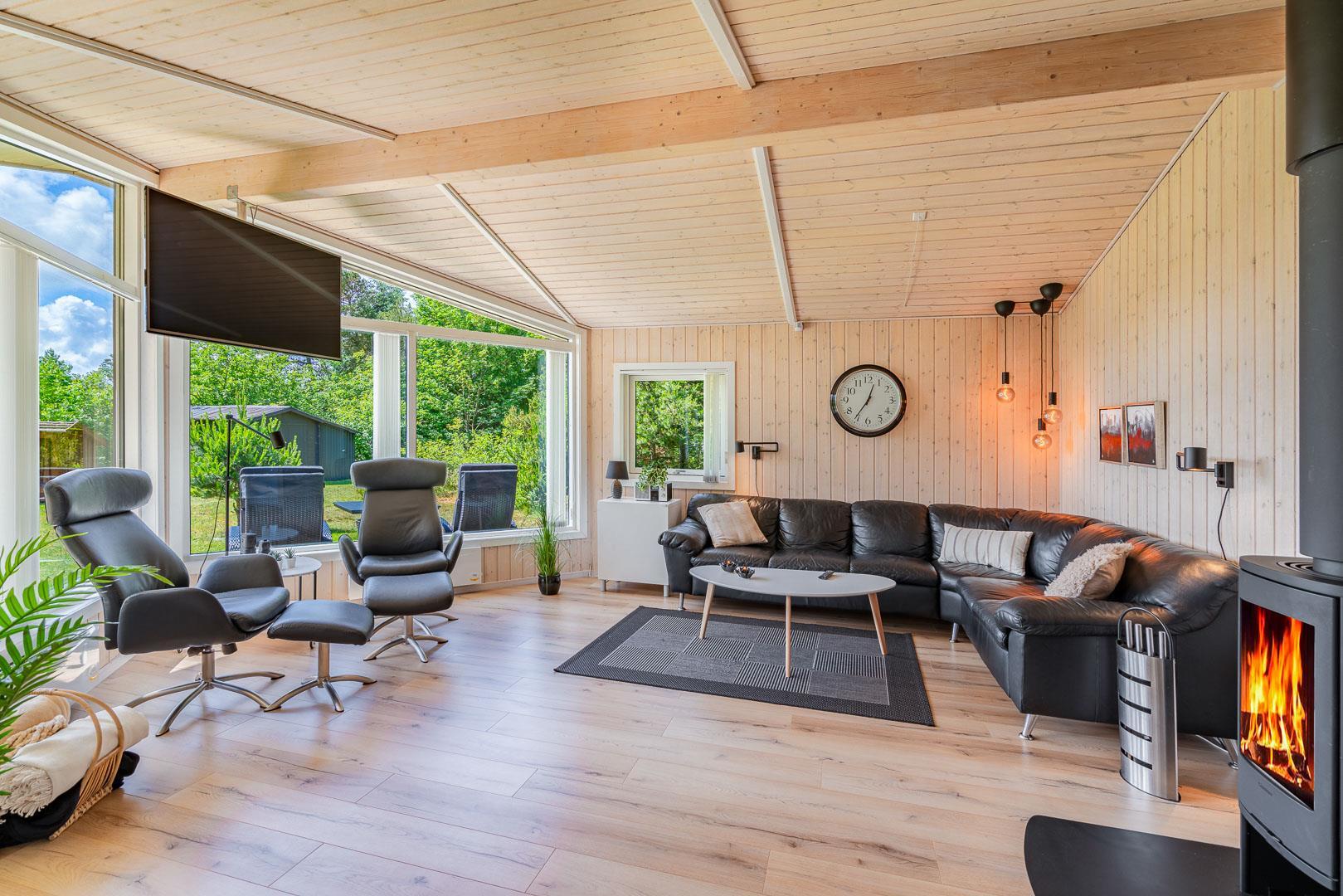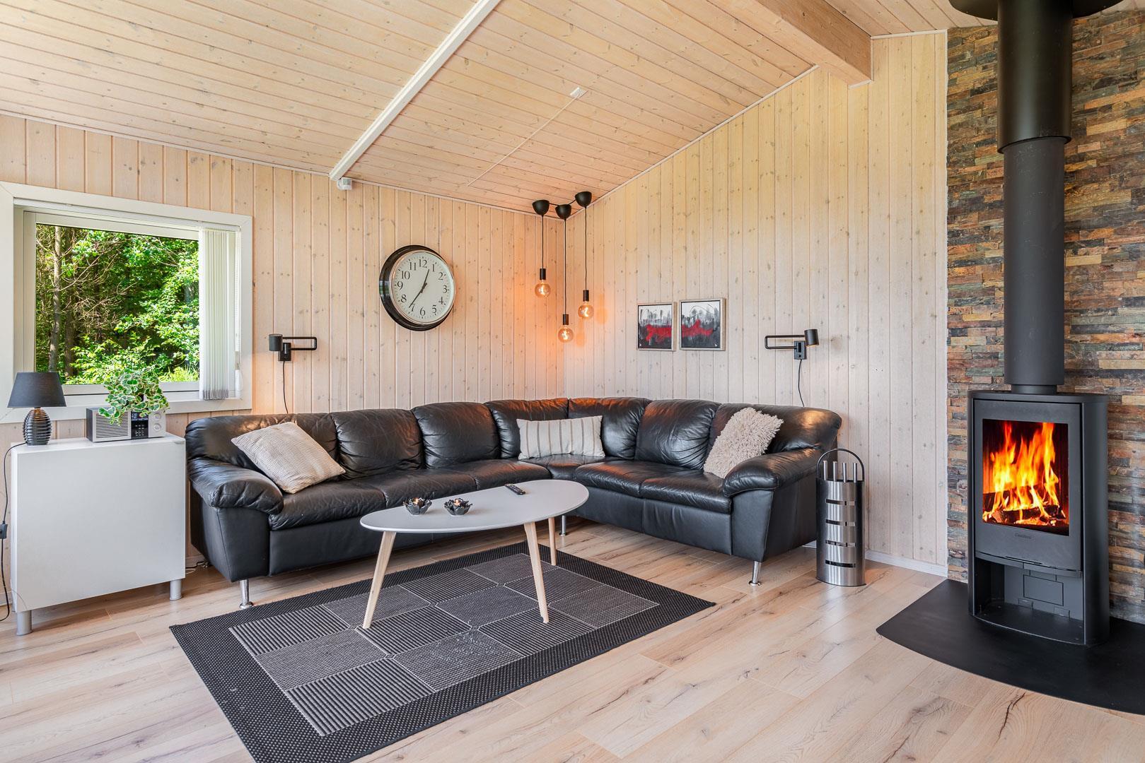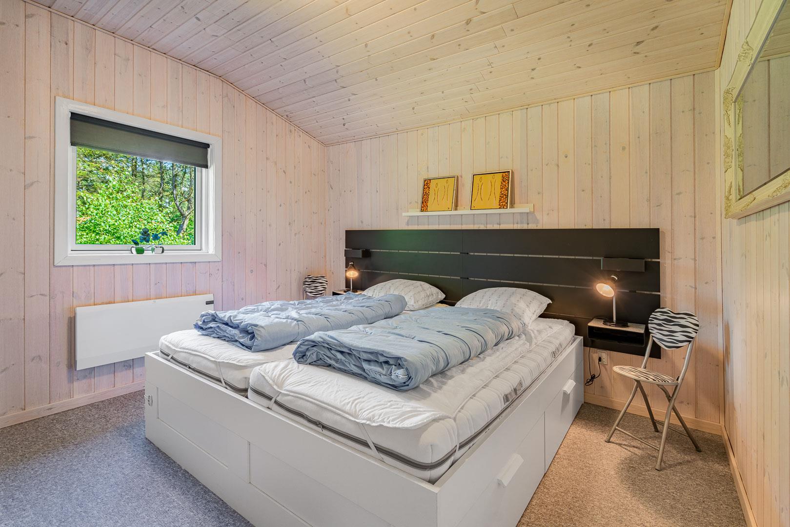 På en ugeneret og børnevenlig naturgrund omkranset af træer ligger dette hyggelige og lyst indrettede feriehus. Til huset hører stor, sydvendt, overdækket terrasse samt 2 åbne terrasser. Stor stue med dejligt lysindfald. 2 badeværelser med bruser og i det ene også badekar. Stort, veludstyret køkken/alrum. komfur med keramiske kogeplader. Gratis internetforbindelse . 3 soverum med dobbeltsenge. Barneseng, høj barnestol, gynge og sandkasse til børnene. Ingen husdyr tilladt.