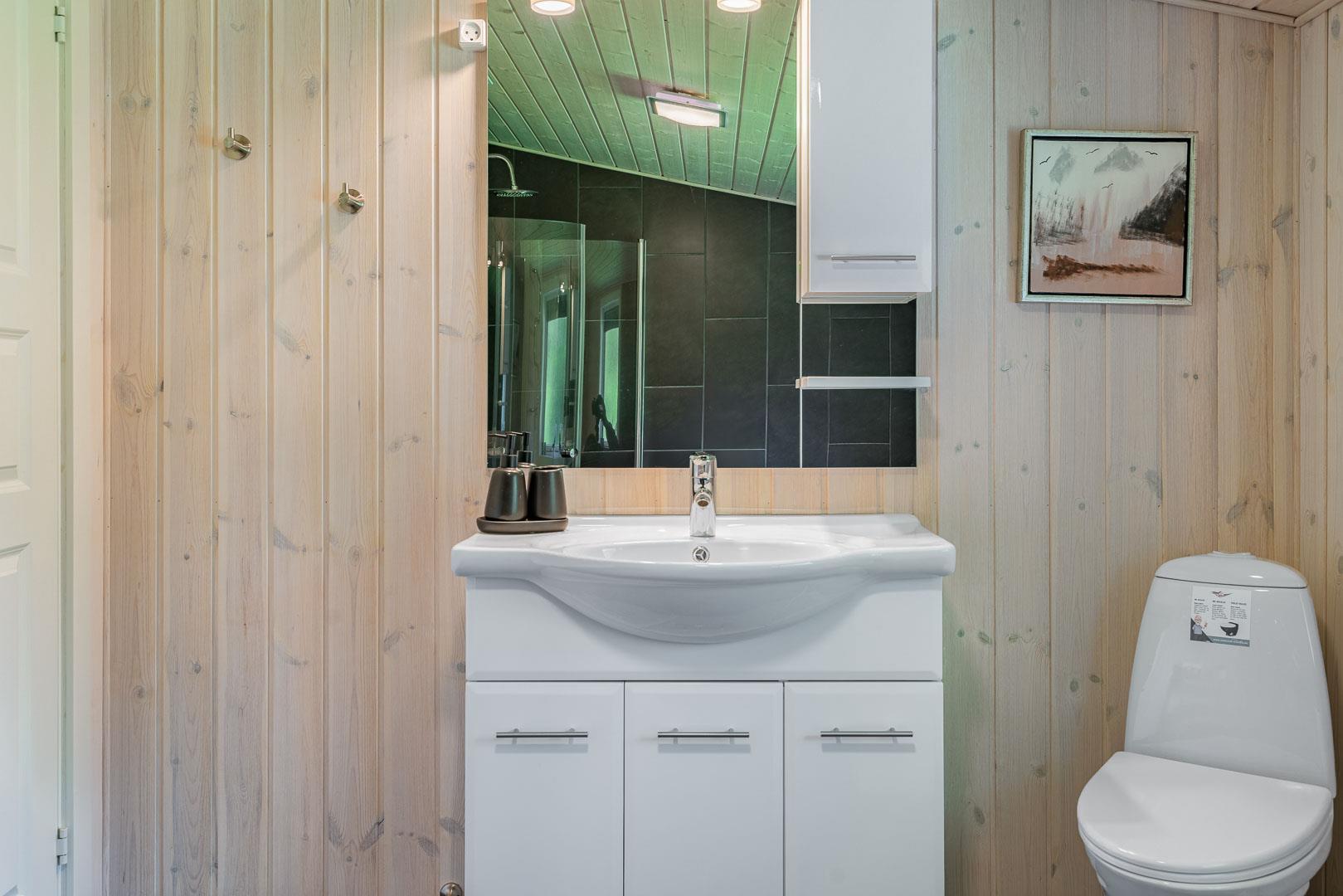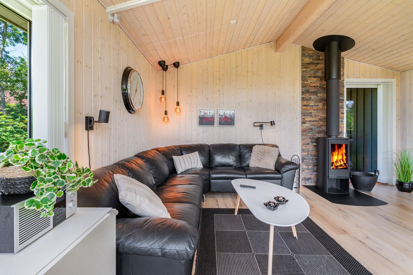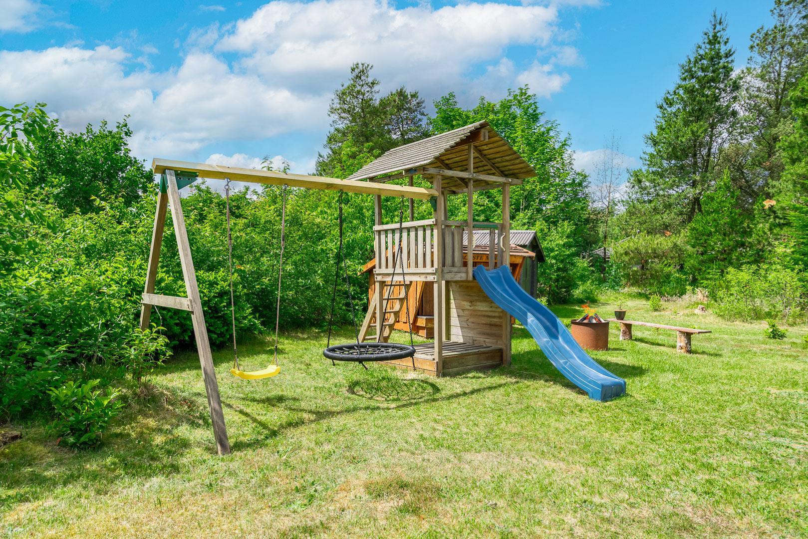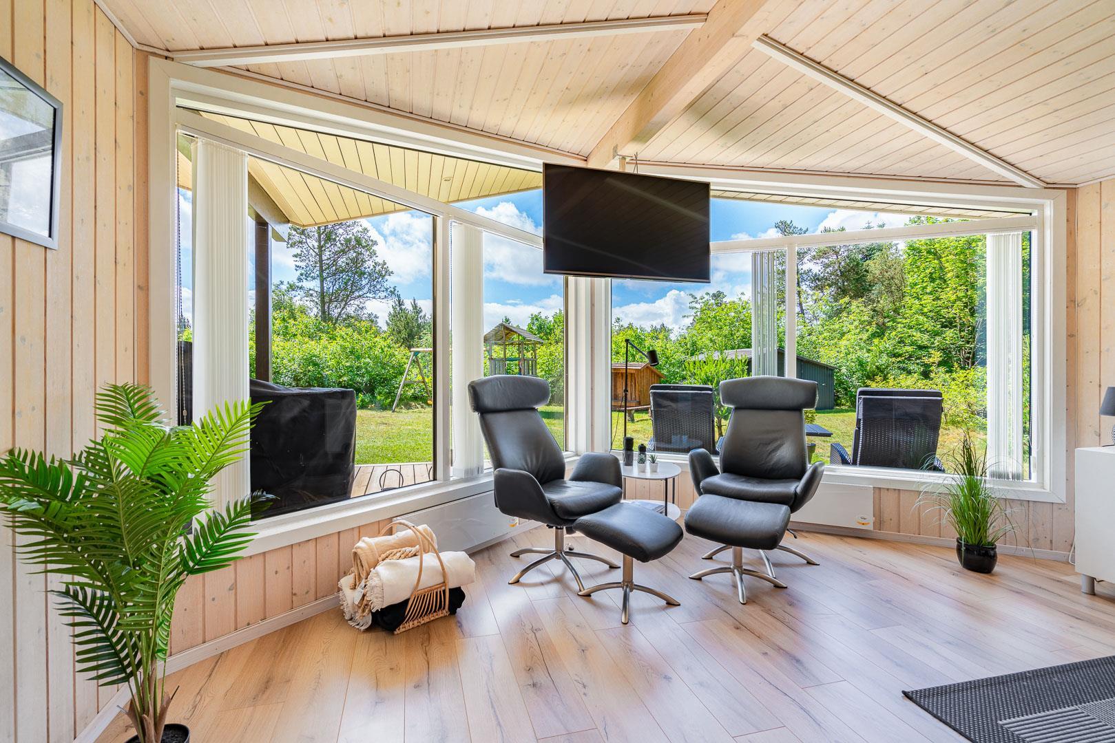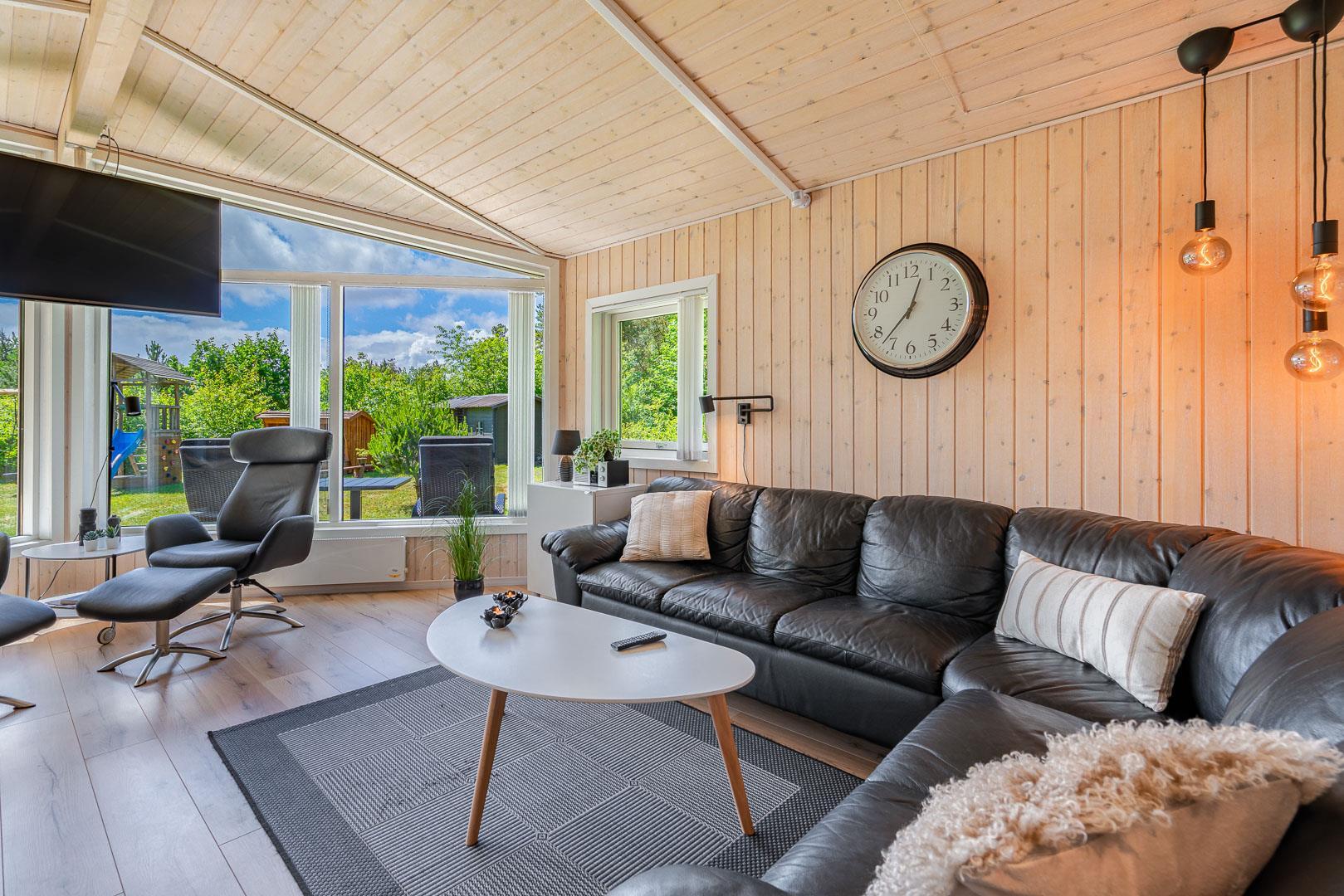 På en ugeneret og børnevenlig naturgrund omkranset af træer ligger dette hyggelige og lyst indrettede feriehus. Til huset hører stor, sydvendt, overdækket terrasse samt 2 åbne terrasser. Stor stue med dejligt lysindfald. 2 badeværelser med bruser og i det ene også badekar. Stort, veludstyret køkken/alrum. komfur med keramiske kogeplader. Gratis internetforbindelse . 3 soverum med dobbeltsenge. Barneseng, høj barnestol, gynge og sandkasse til børnene. Ingen husdyr tilladt.