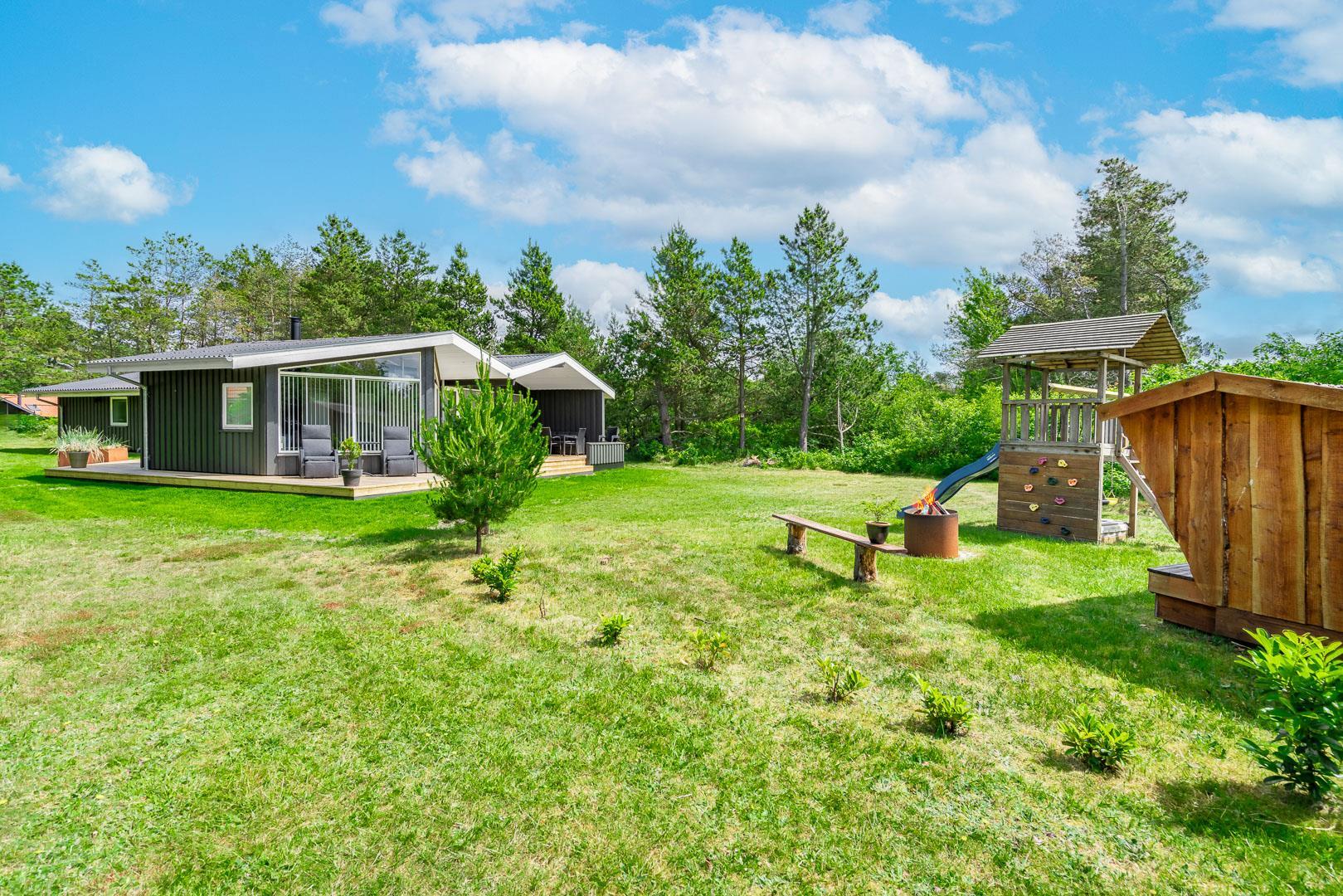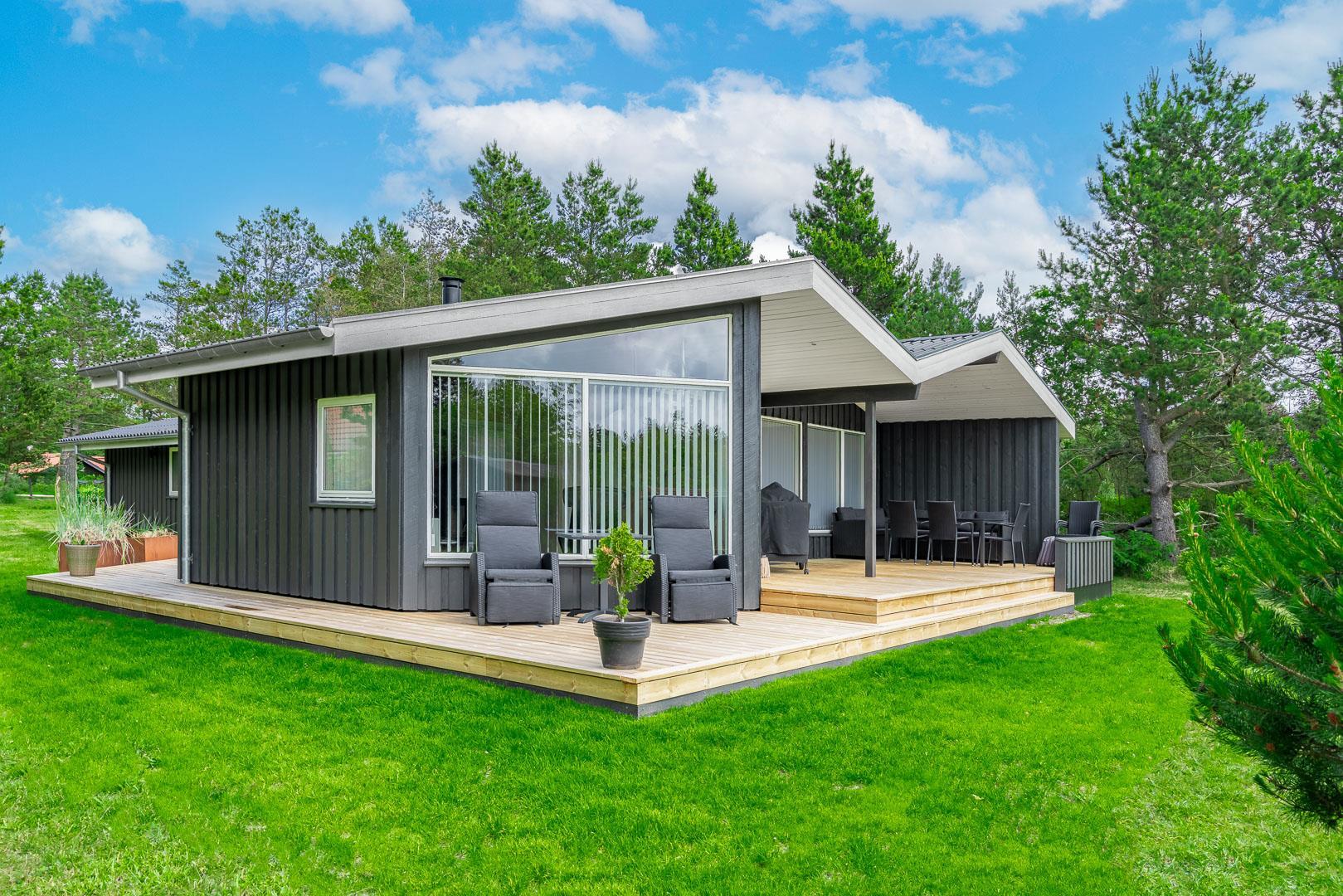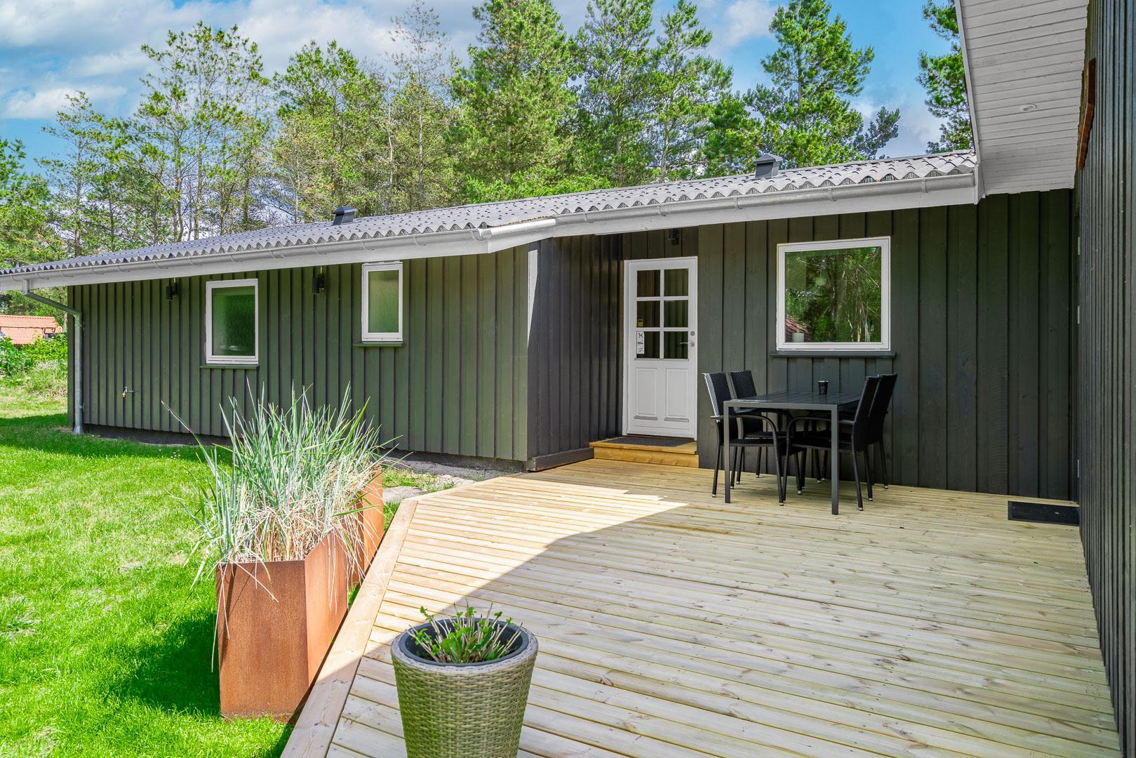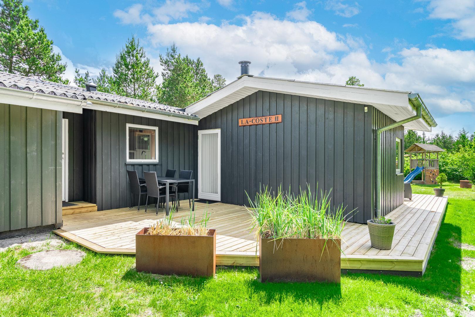 Hyggeligt feriehus i Henne Strand med stor overdækket terrasse, børnevenlige faciliteter og moderne køkken.