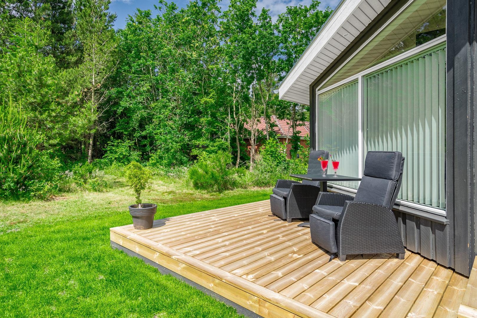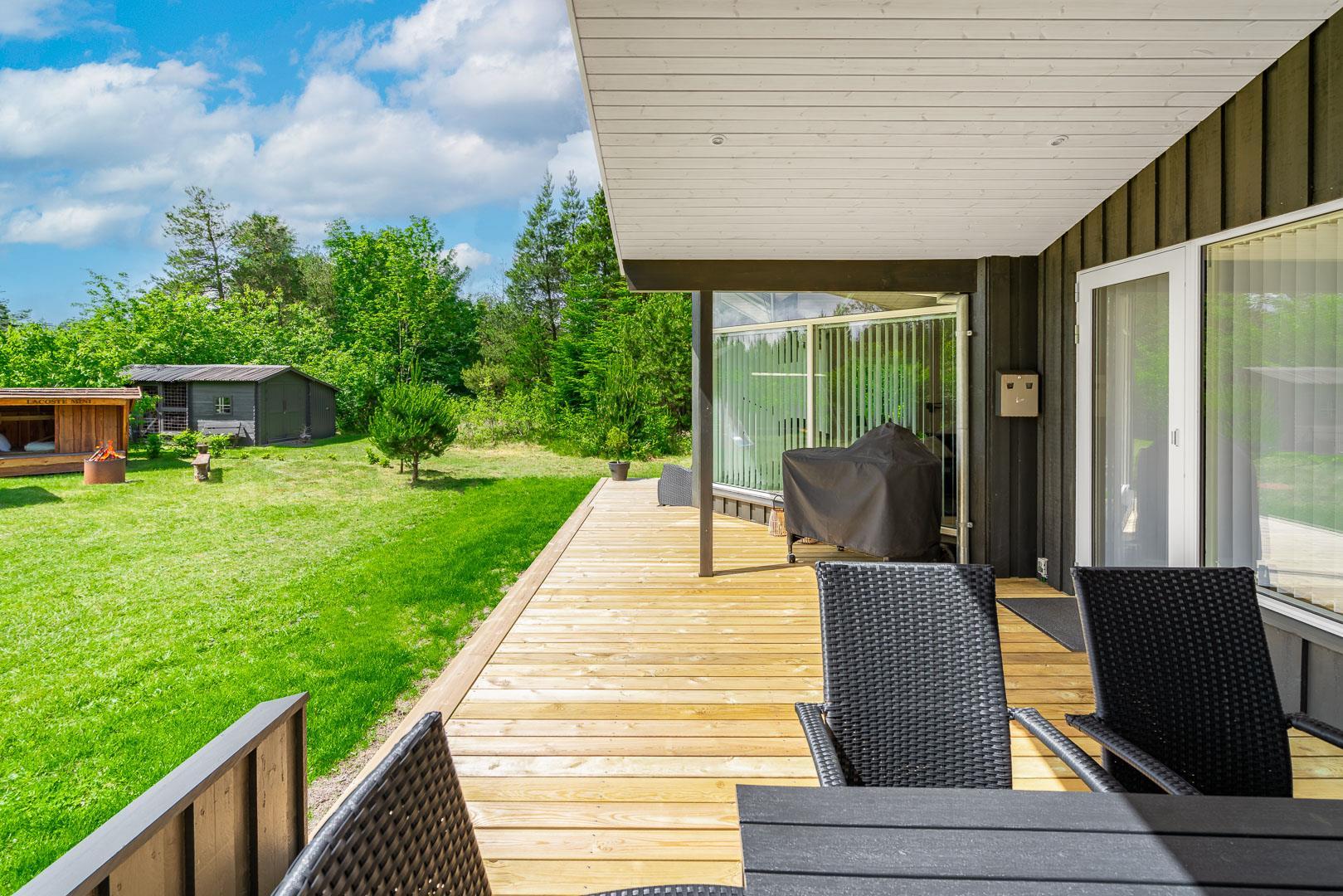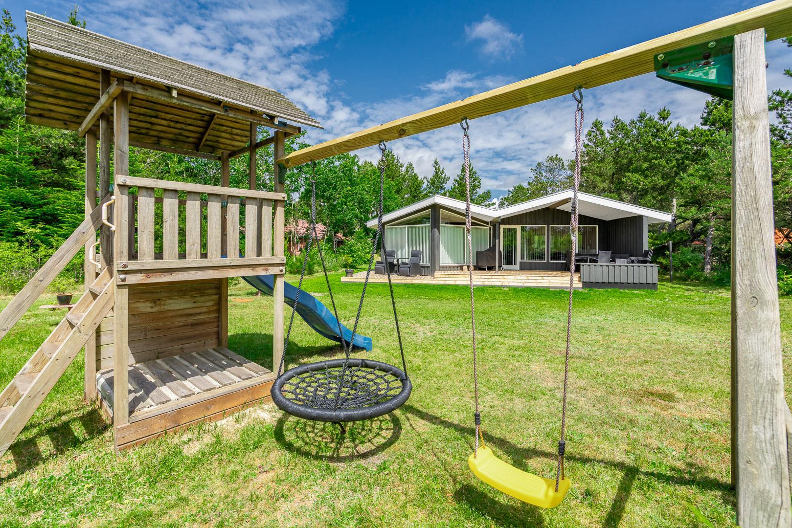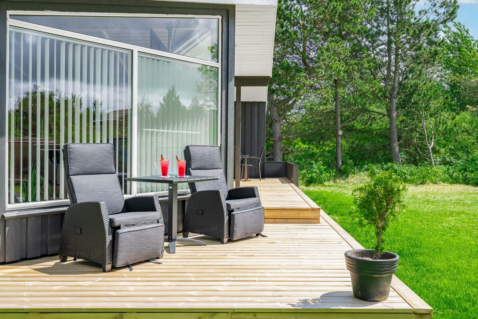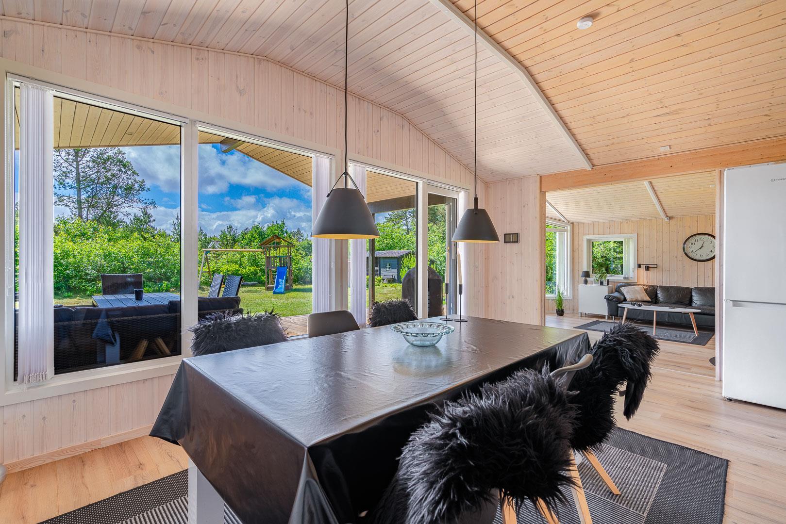 Hyggeligt feriehus i Henne Strand med stor overdækket terrasse, børnevenlige faciliteter og moderne køkken.