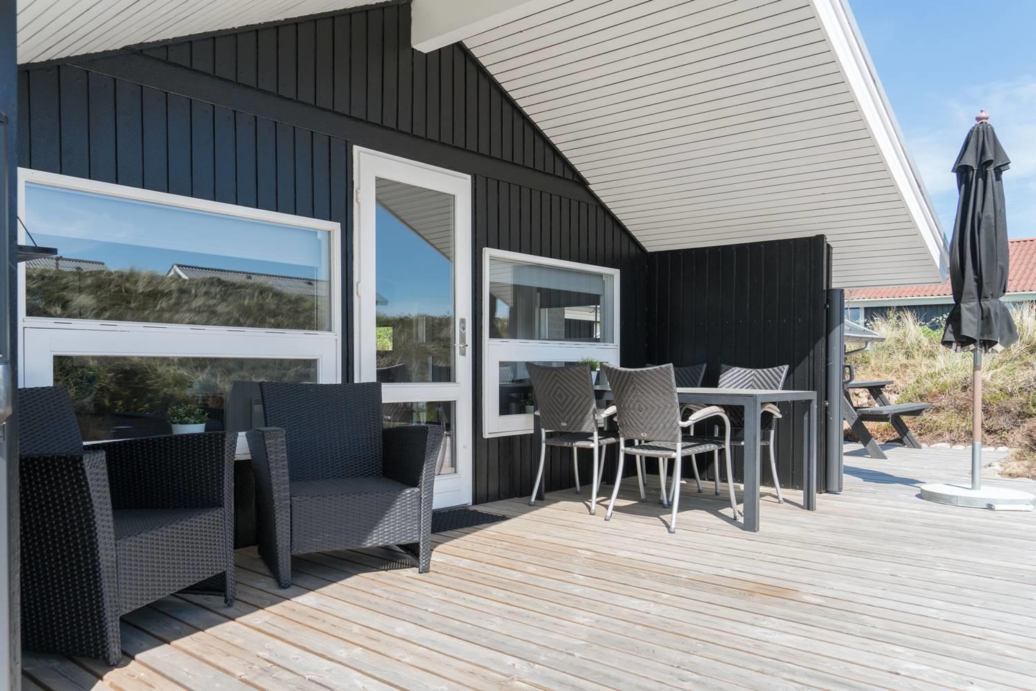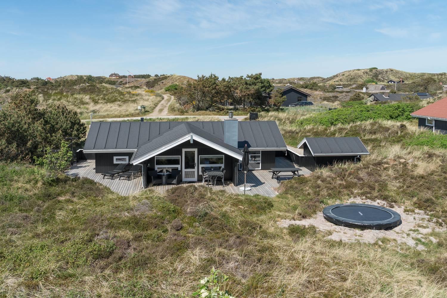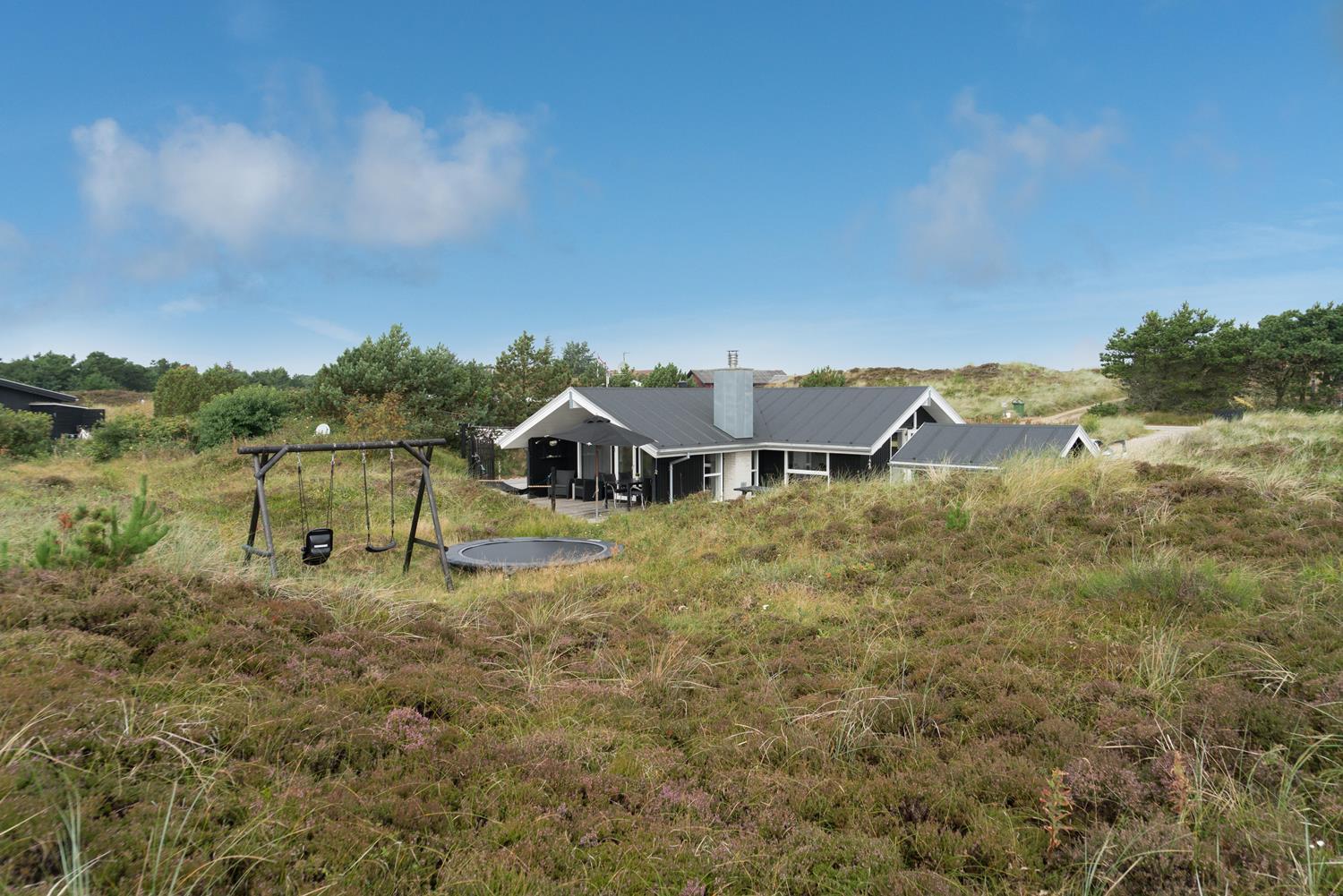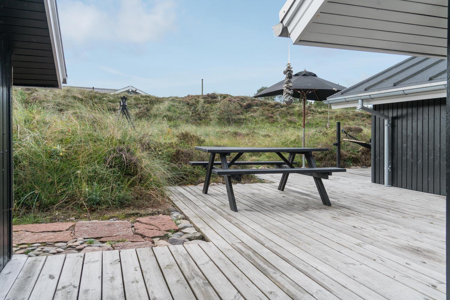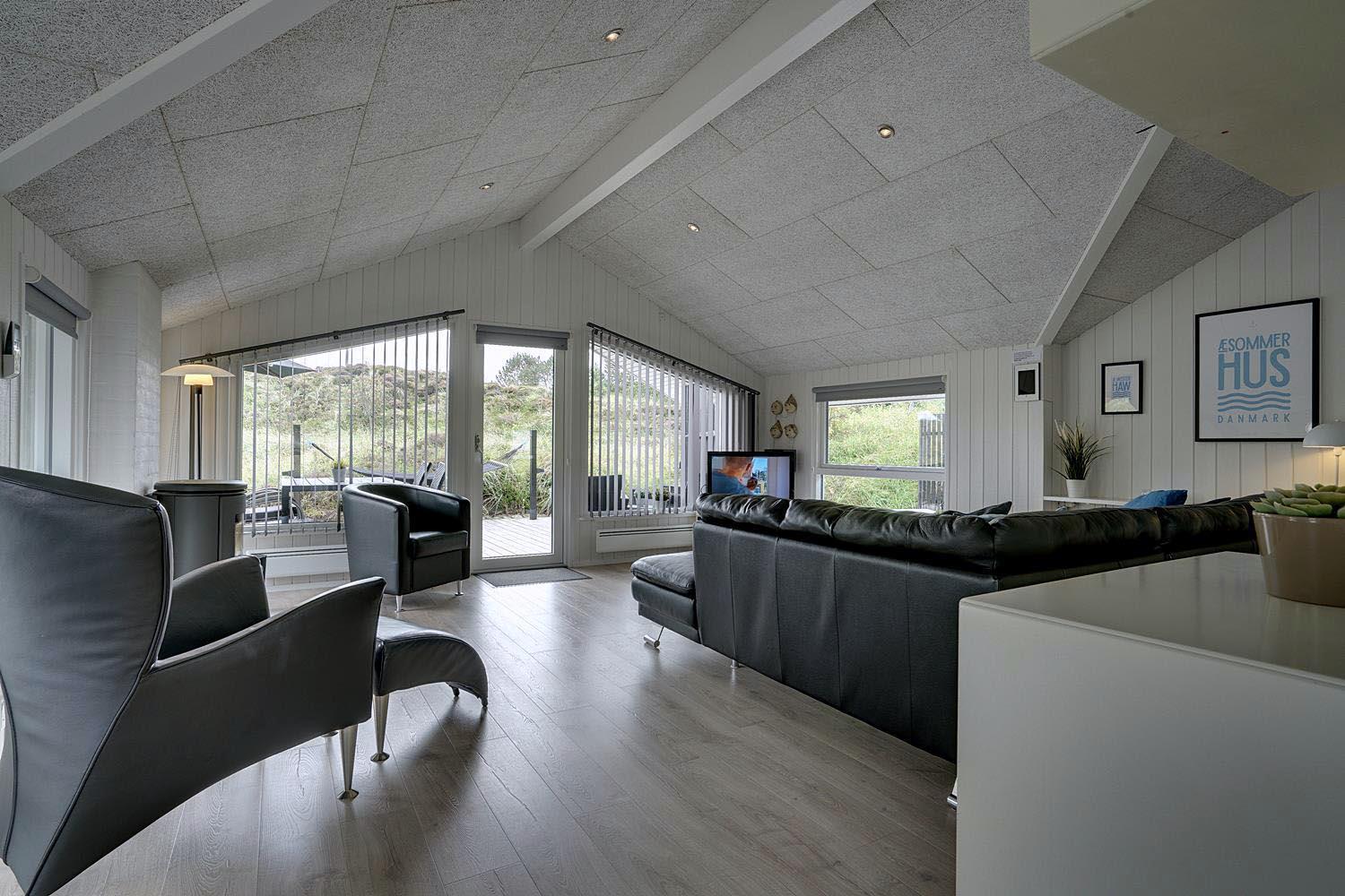 Sommerhuset er renoveret i 2018, og resultatet er en indbydende ferieoase med moderne komfort og en omfavnende atmosfære. Udenfor smyger et stort terrassedæk sig hele vejen rundt langs de solvendte facader, og klitterne skærmer af, så I kan nyde freden og roen i læ for vinden.