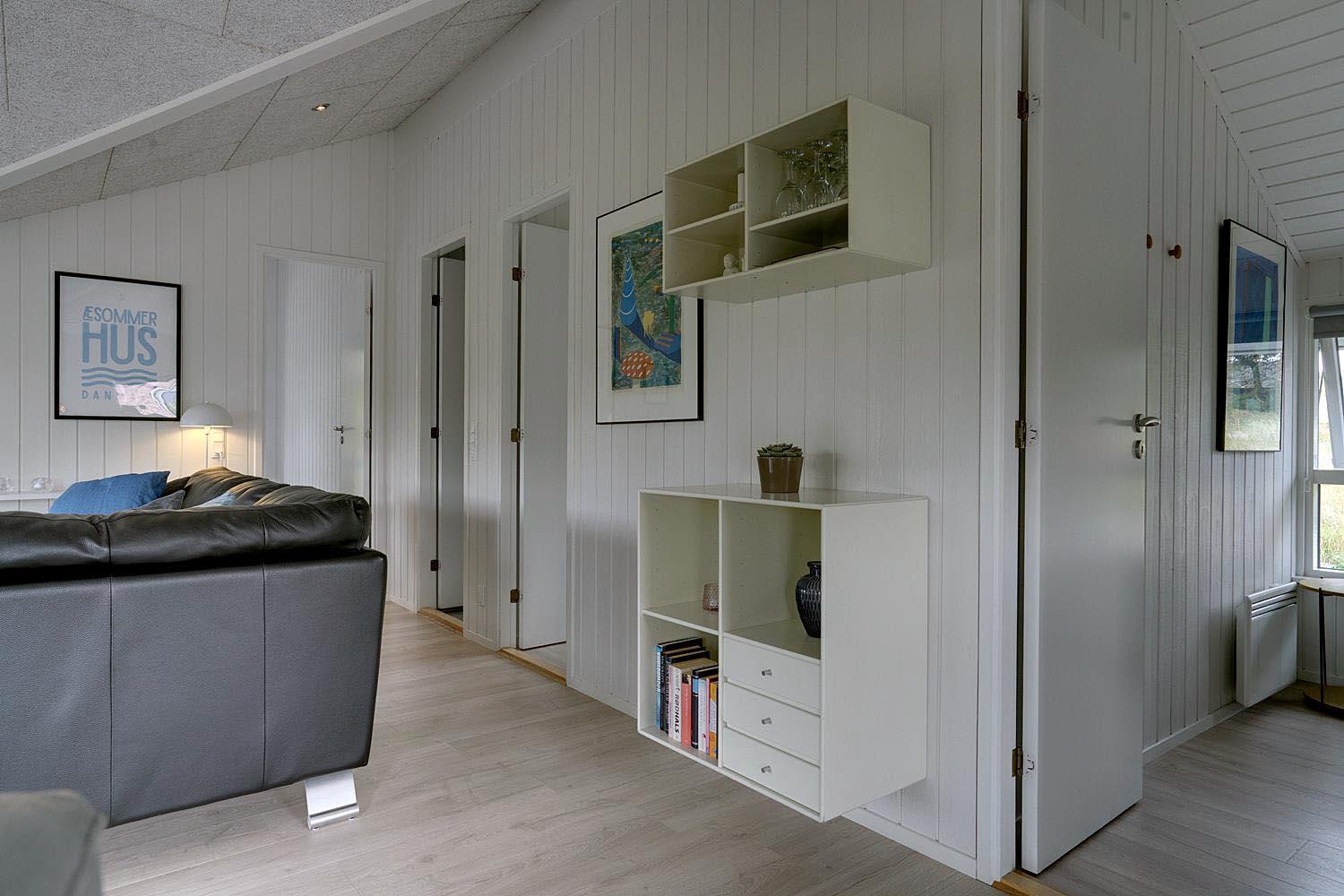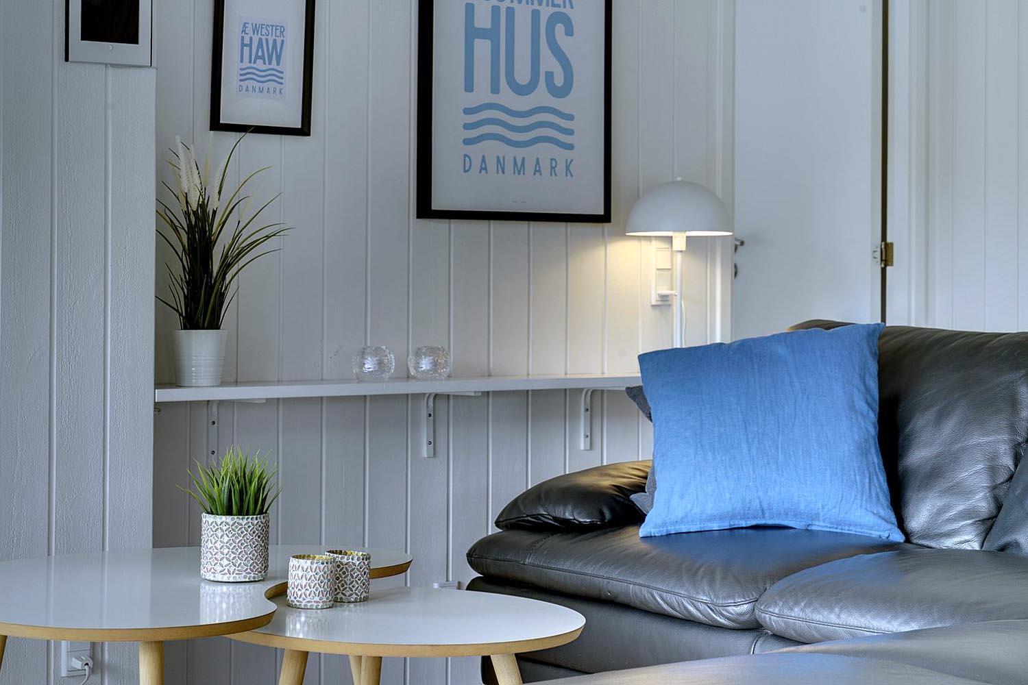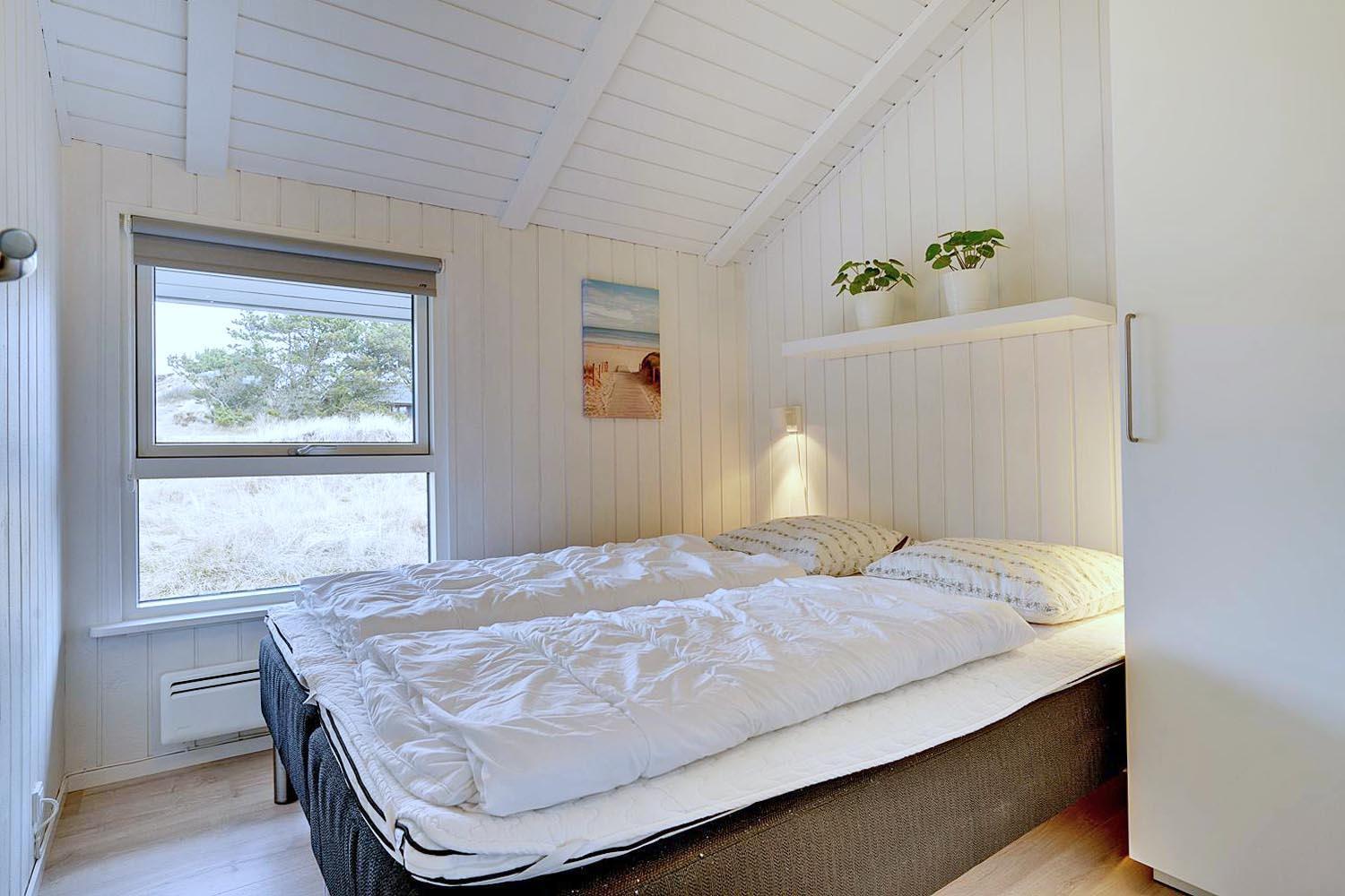 Indenfor er de lækre indslag mange og omfatter blandt andet gulvvarme, Chromecast og lofter til kip, mens Troldtektplader sørger for en behagelig akustik. Huset byder på et stort opholdsrum med et stilsikkert hvidt køkken i den ene ende og en skøn lounge-afdeling med brændeovn og dejligt stort vinduesparti med udsigt til klitterne i den anden ende. De private gemakker består af et lækkert badeværelse med sauna og brus samt tre soveværelser med faste skabe og i alt fem sovepladser. Det ene værelse har ligesom stuen direkte udgang til terrassen.
