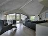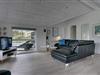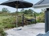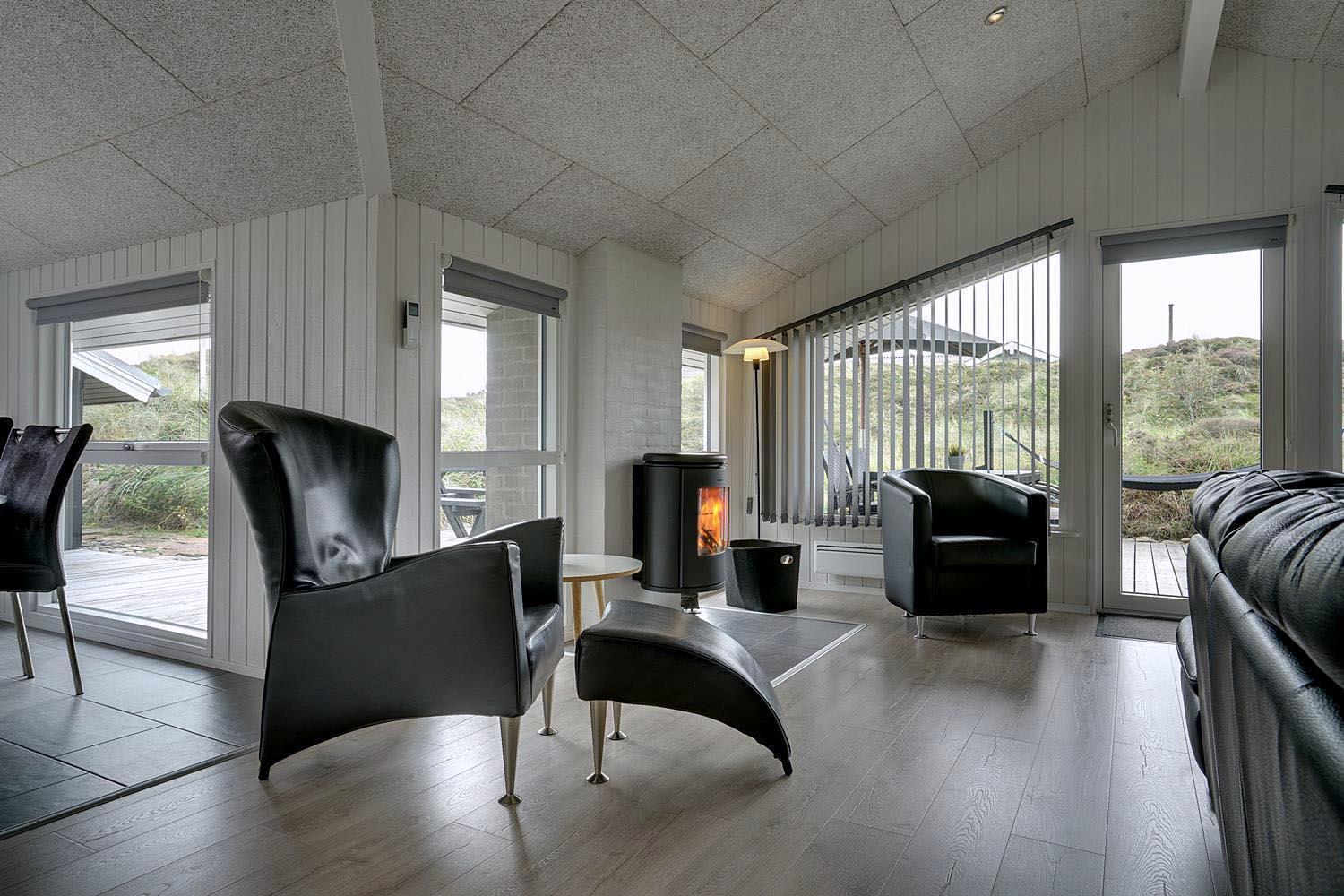 Marehalmen læner sig blødt over klitterne lige på den anden side af de store vinduer i dette dejlige sommerhus i Henne Strand Syd.