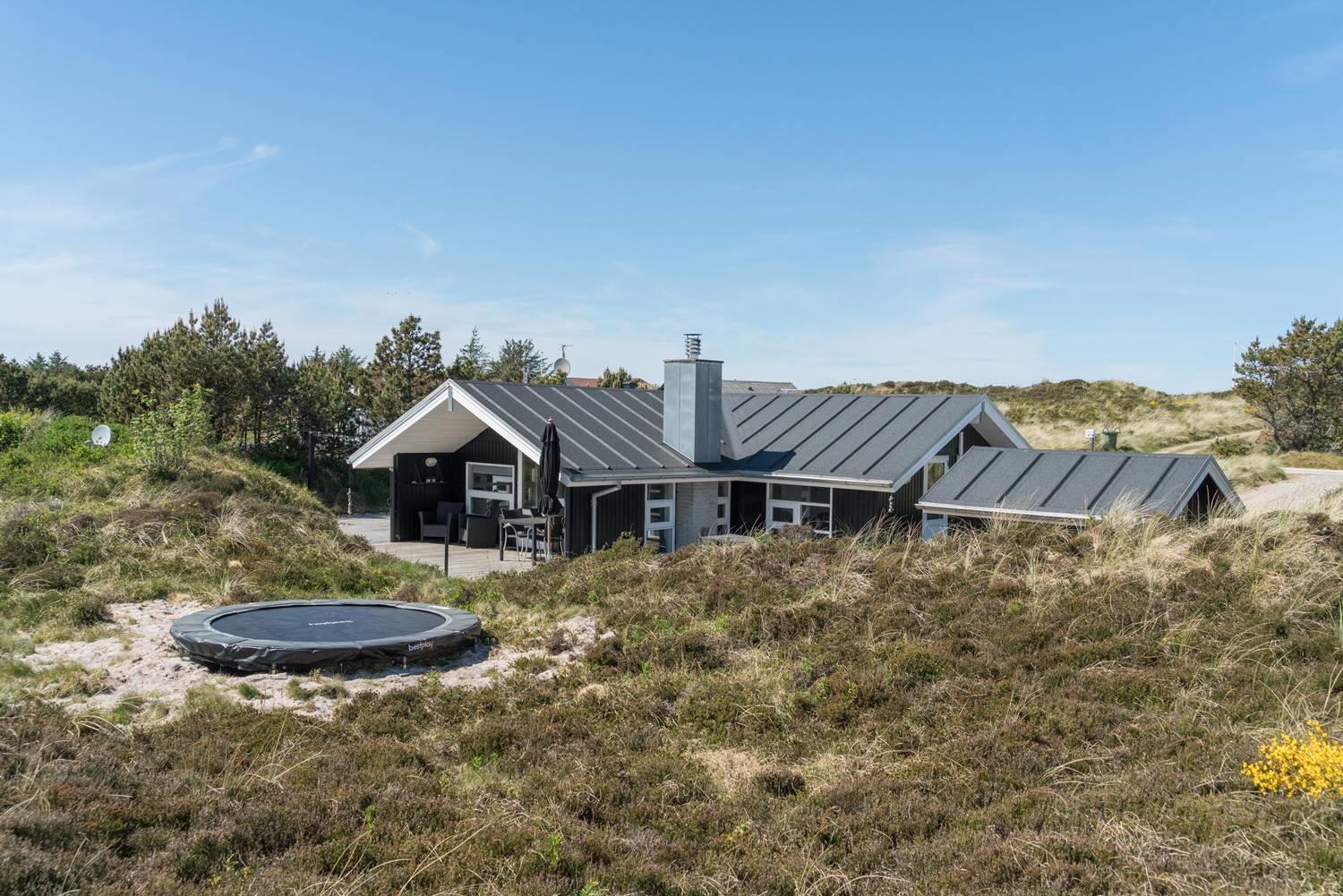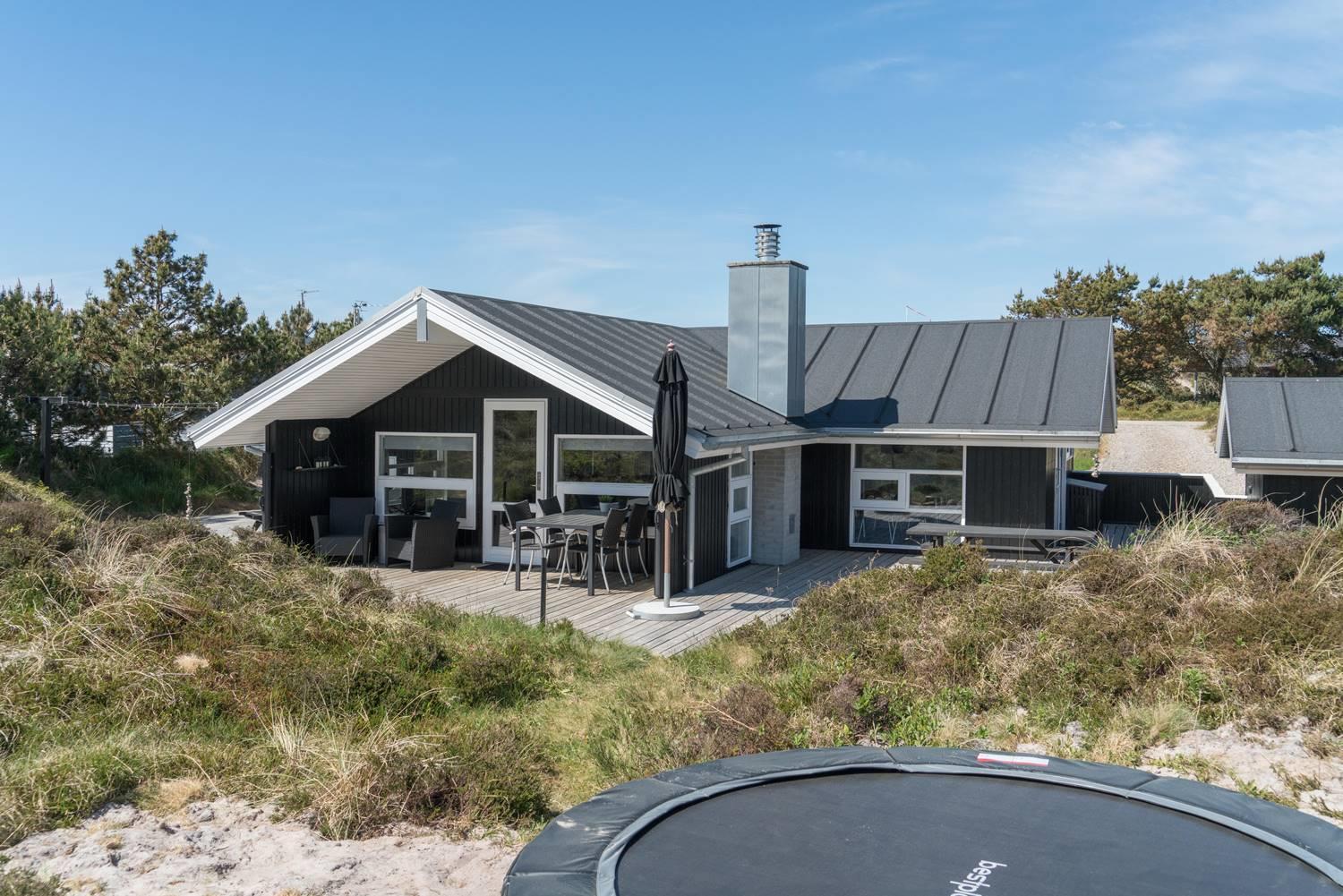 Her får familien alletiders chance for en dejlig ferie både ude og inde, for huset er superlækkert, stilrent indrettet og veludstyret og så ligger det på en flot klitgrund med kæmpestor terrasse og nedgravet trampolin blot 200 meter fra stranden.