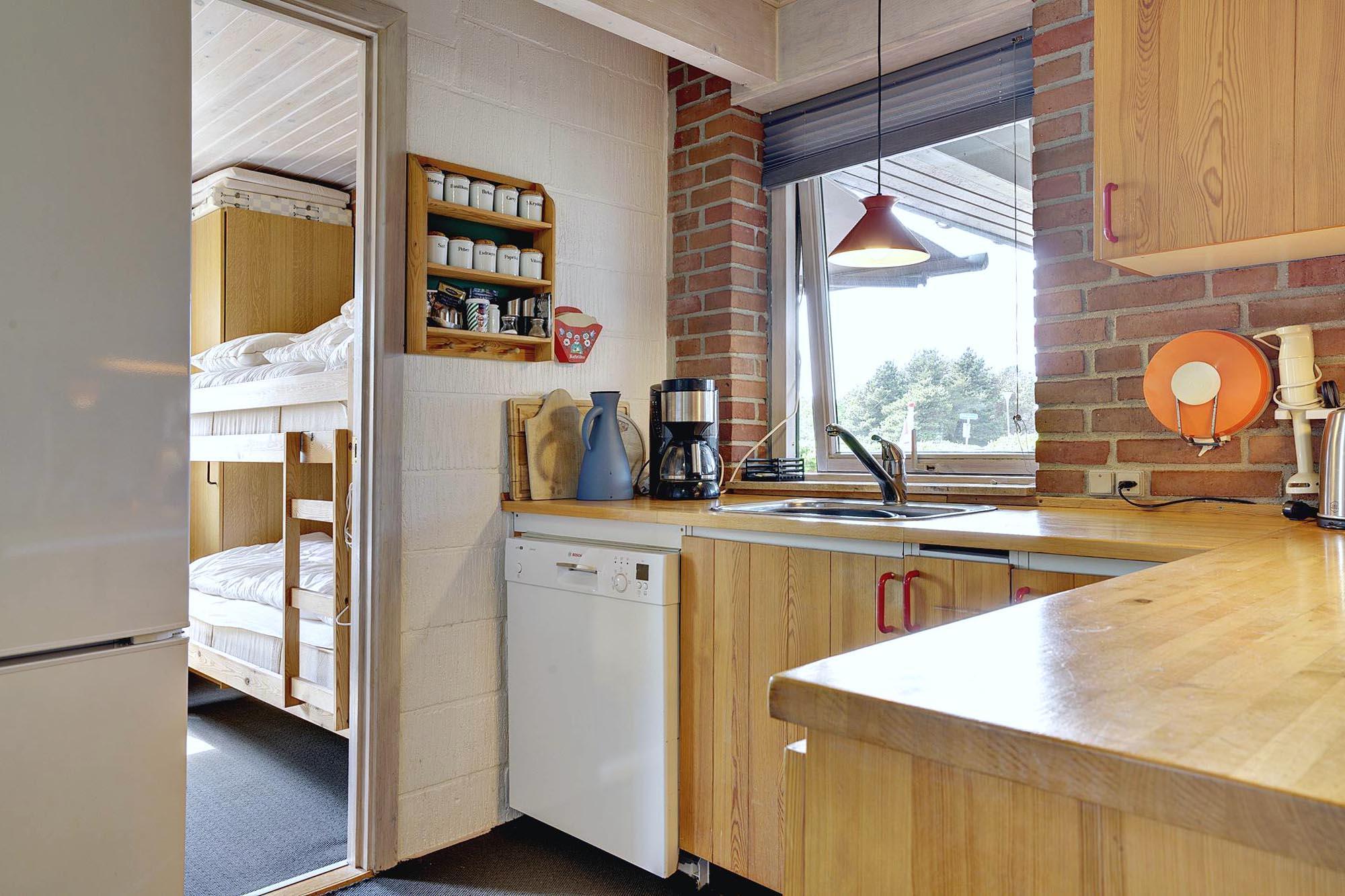 Hyggeligt indrettet feriehus med carport beliggende på en naturgrund i byen. Ældre køkken med opvaskemaskine og mikroovn. Huset er personligt indrettet og råder over 2 soverum med dobbelt senge i det ene er der ligeledes 2 køjesenge. Fra stuen er der udgang til lukket terrasse og på bagsiden er der dejlig lukket gårdhave. Oplader til El-bil: CEE-Stik 16 A + stikkontakt til Mormor-oplader.