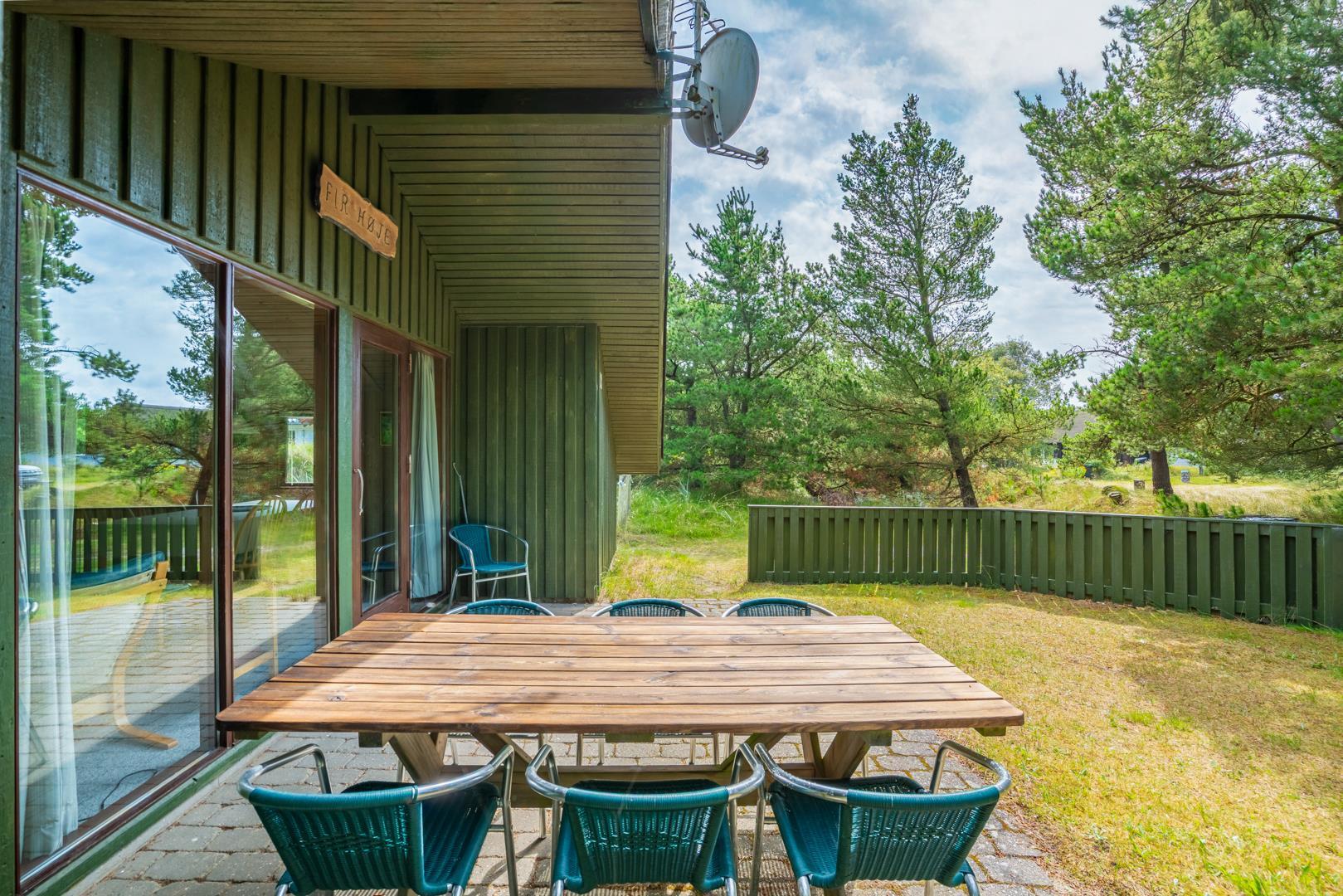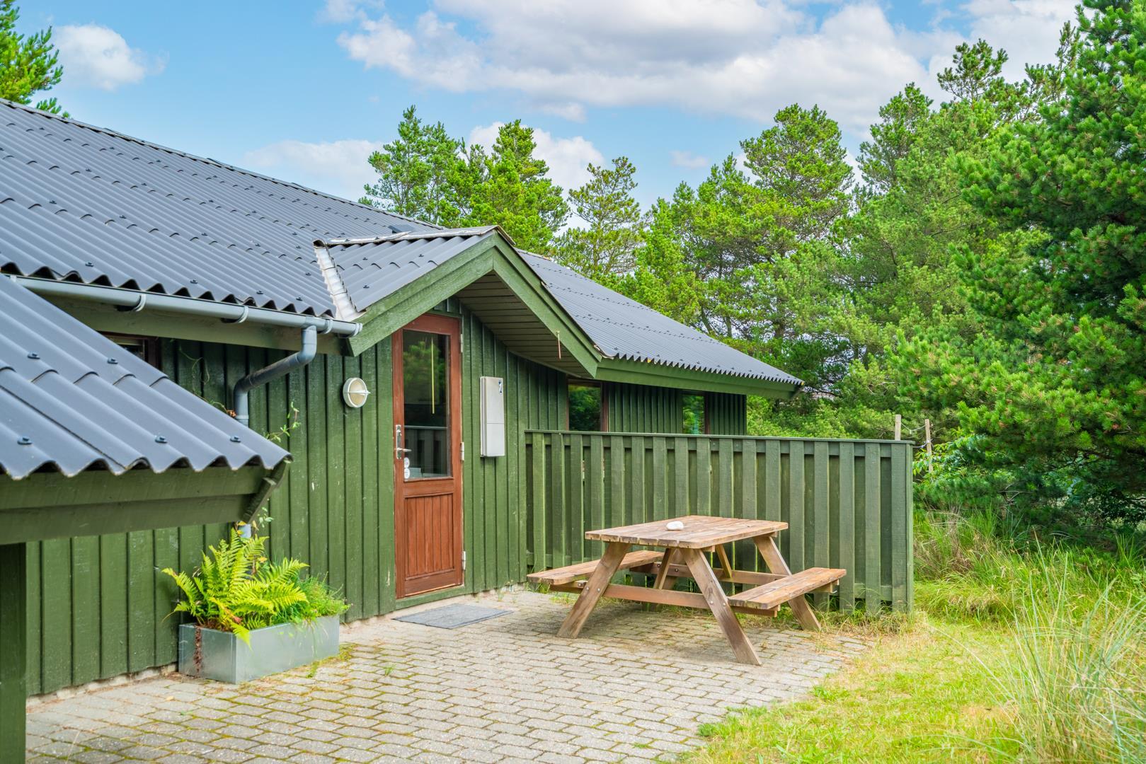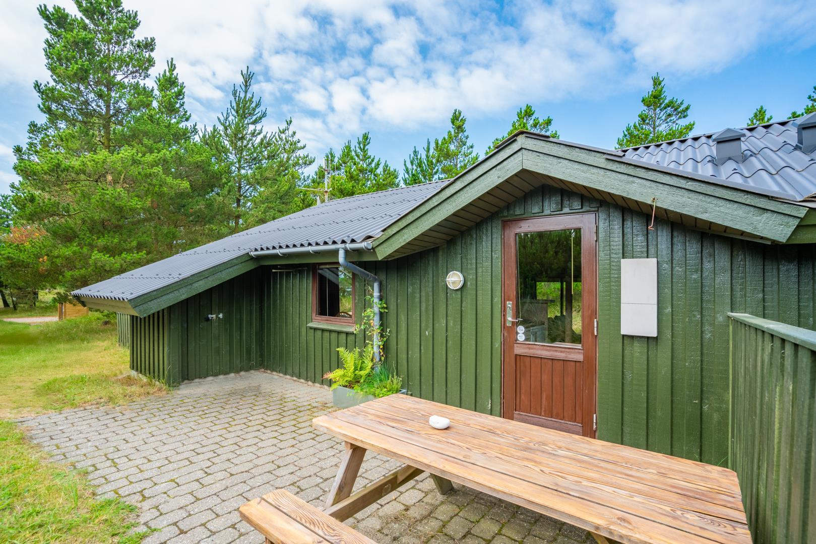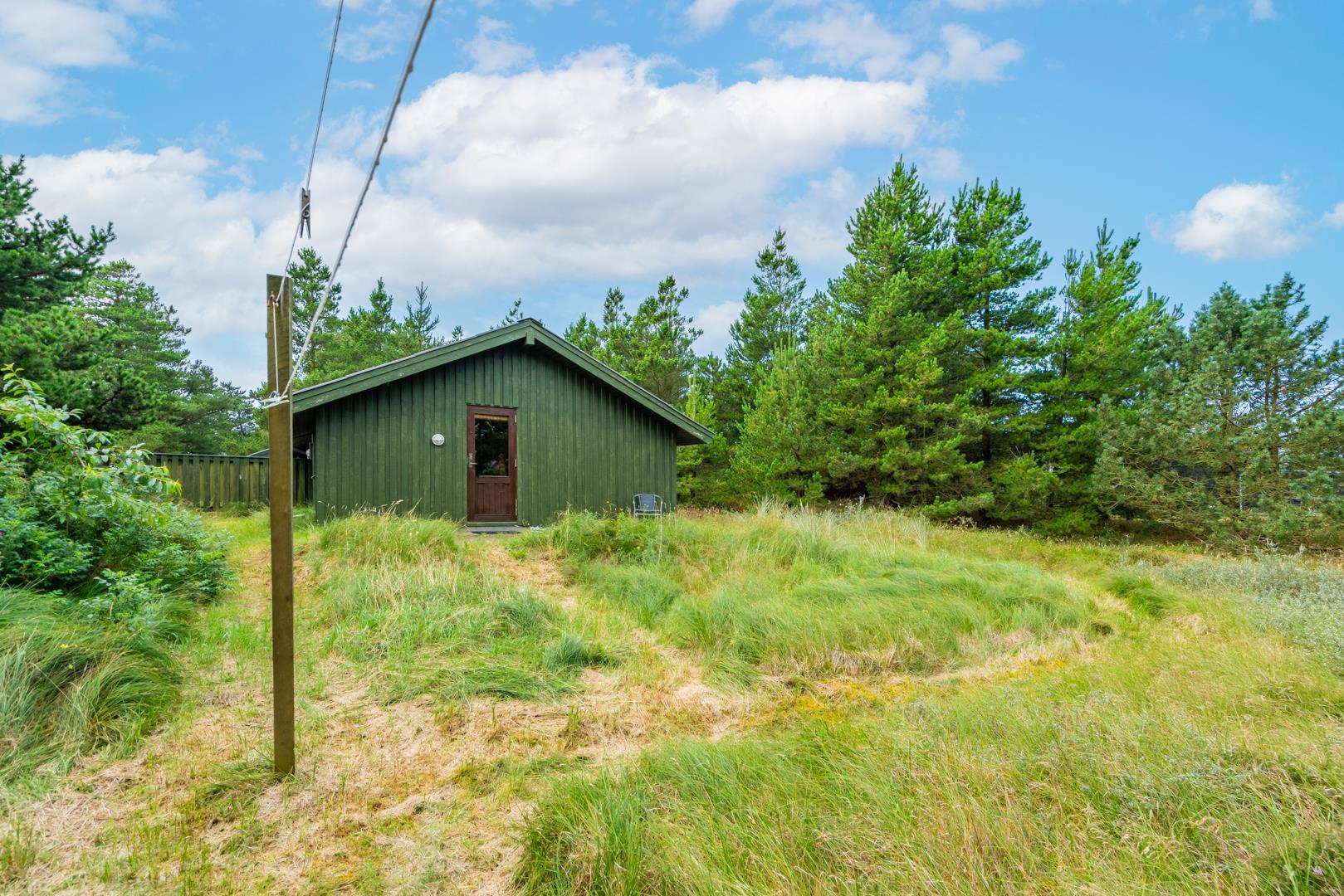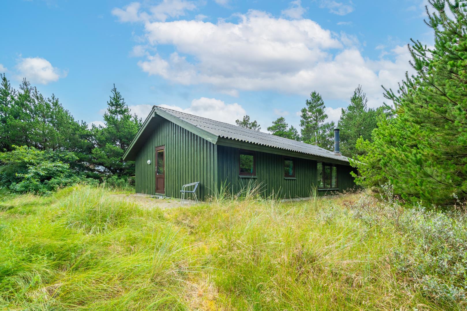 Træhus beliggende på en stor, ugeneret lyngbeklædt naturgrund, omgivet af fyrretræer. Fra stuen med brændeovn er der udgang til delvis overdækket terrasse. Ved husets veludstyrede køkken, findes en lille morgen terrasse, hvor det er muligt at nyde morgenkaffen på de tidligere morgentimer.
