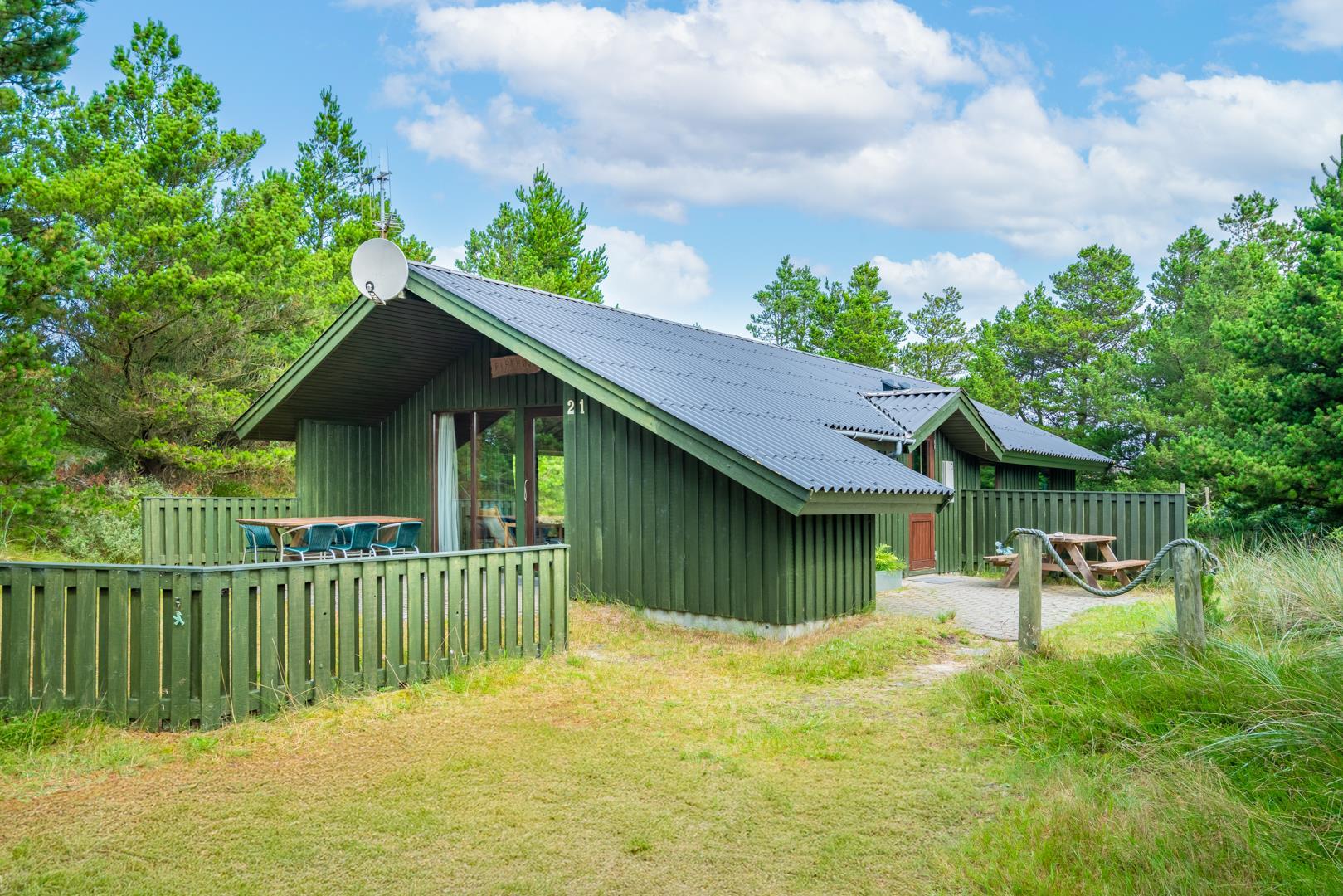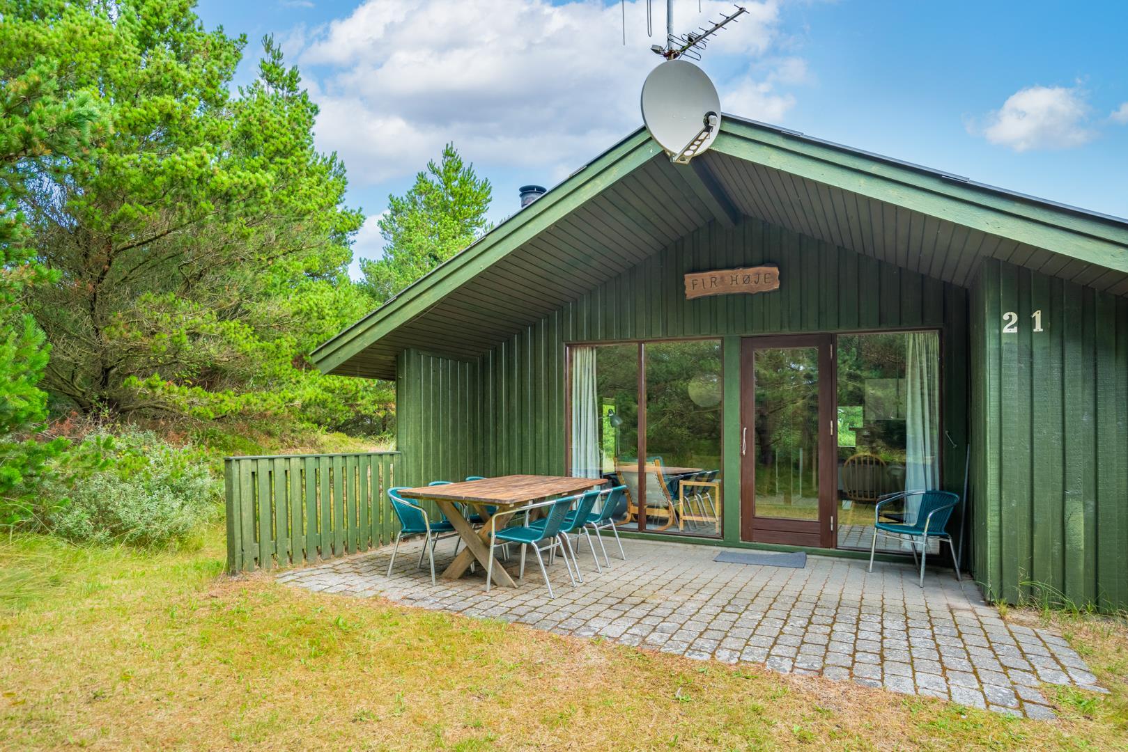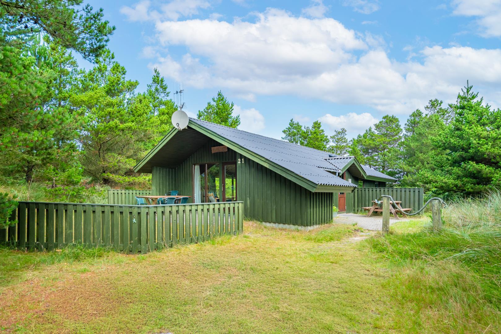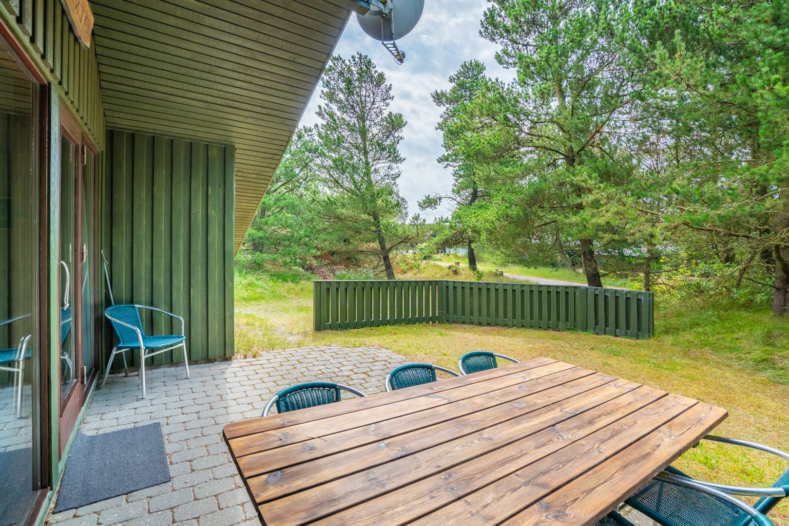 Træhus beliggende på en stor, ugeneret lyngbeklædt naturgrund, omgivet af fyrretræer. Fra stuen med brændeovn er der udgang til delvis overdækket terrasse. Ved husets veludstyrede køkken, findes en lille morgen terrasse, hvor det er muligt at nyde morgenkaffen på de tidligere morgentimer.