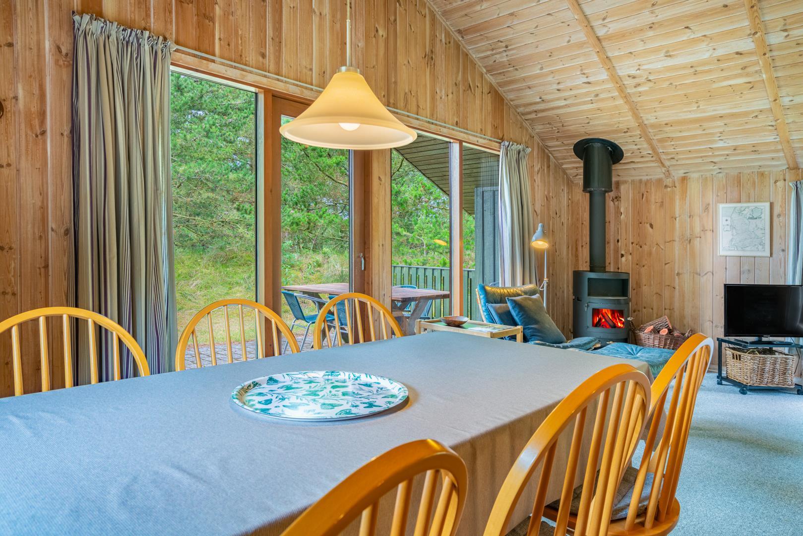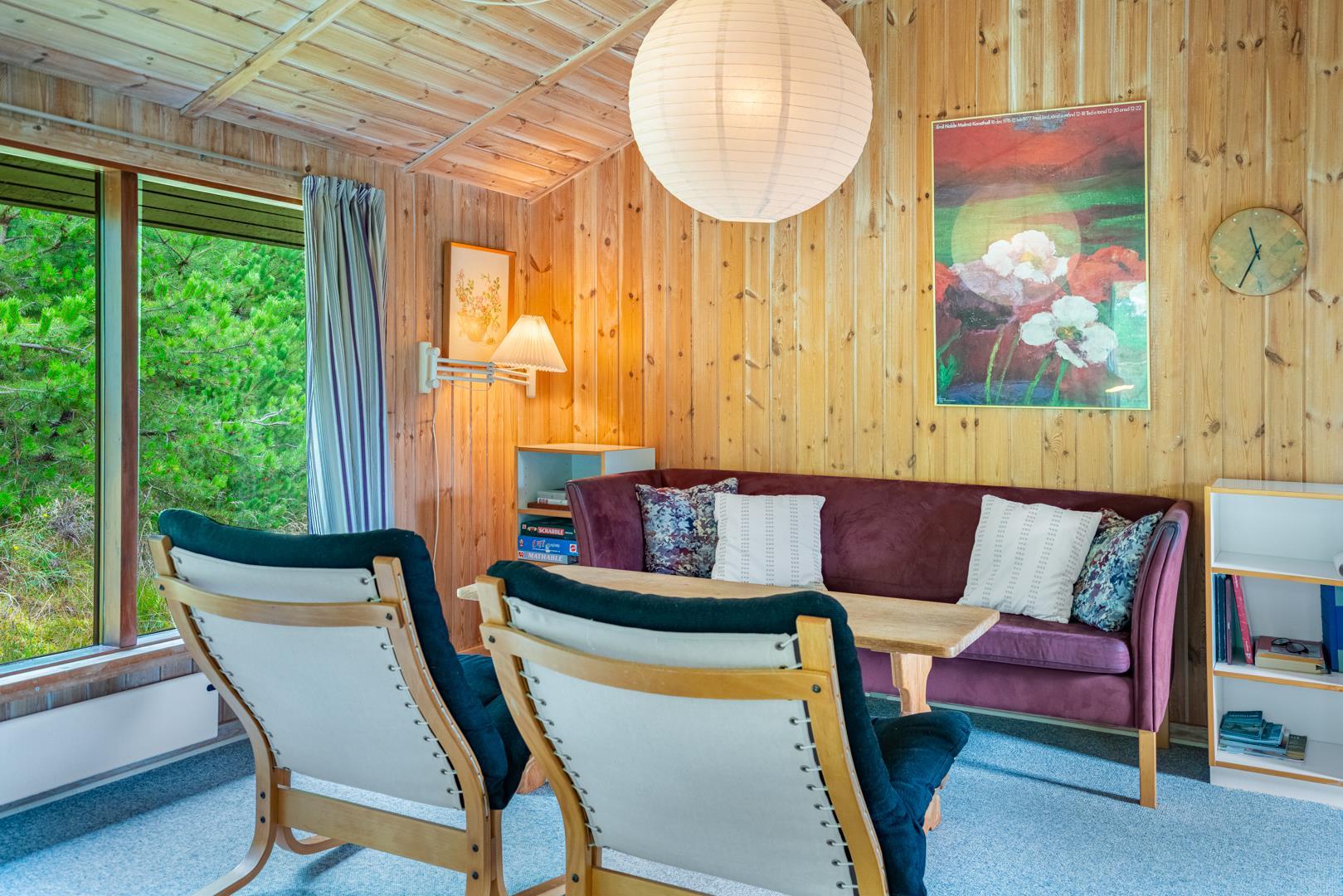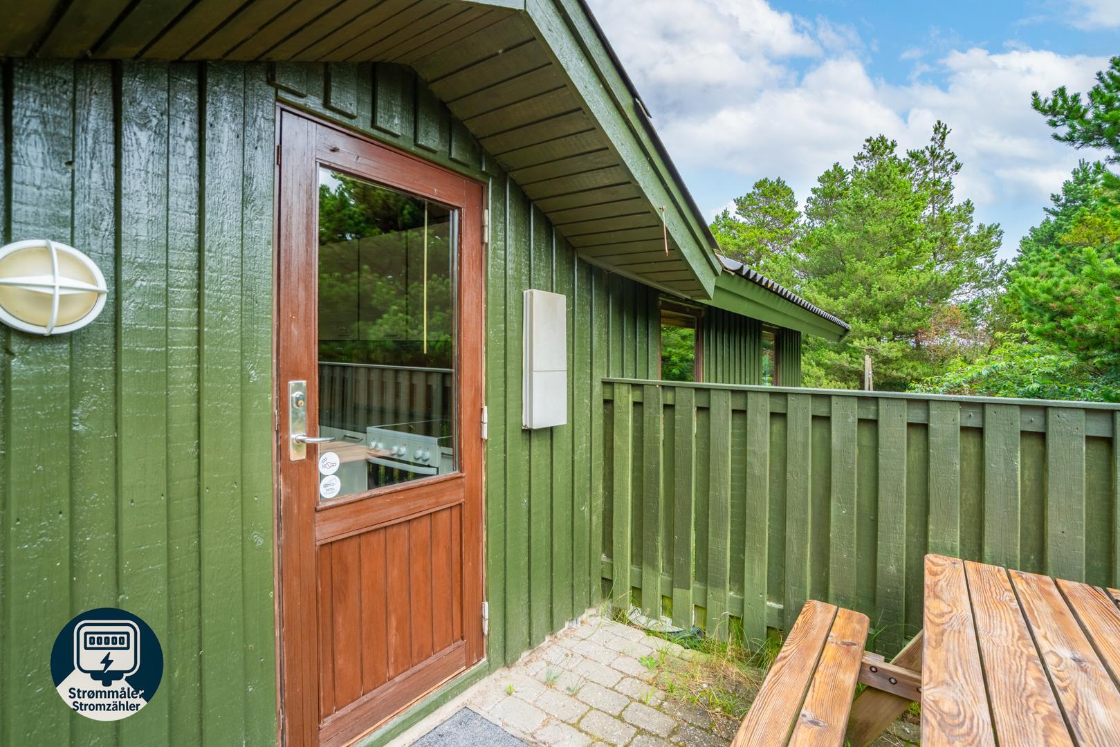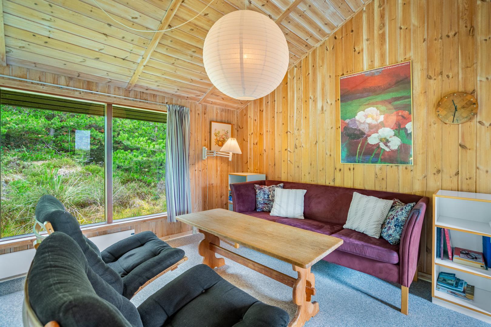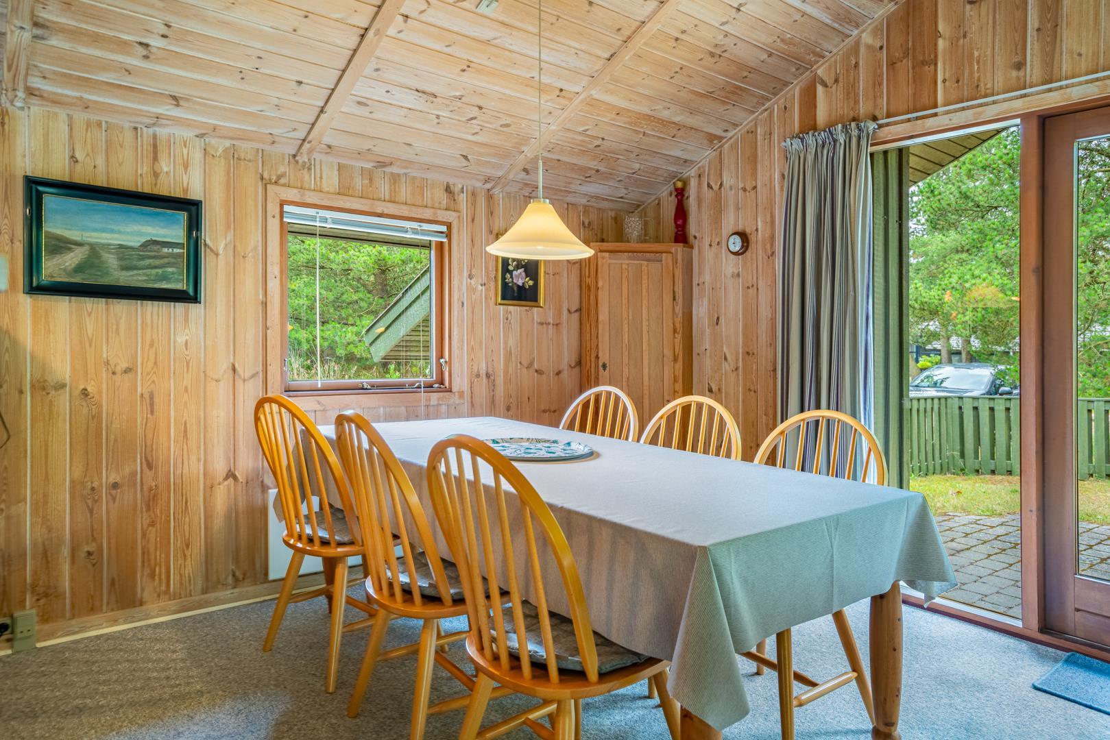 Træhus beliggende på en stor, ugeneret lyngbeklædt naturgrund, omgivet af fyrretræer. Fra stuen med brændeovn er der udgang til delvis overdækket terrasse. Ved husets veludstyrede køkken, findes en lille morgen terrasse, hvor det er muligt at nyde morgenkaffen på de tidligere morgentimer.