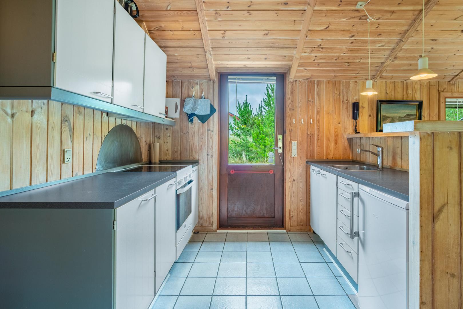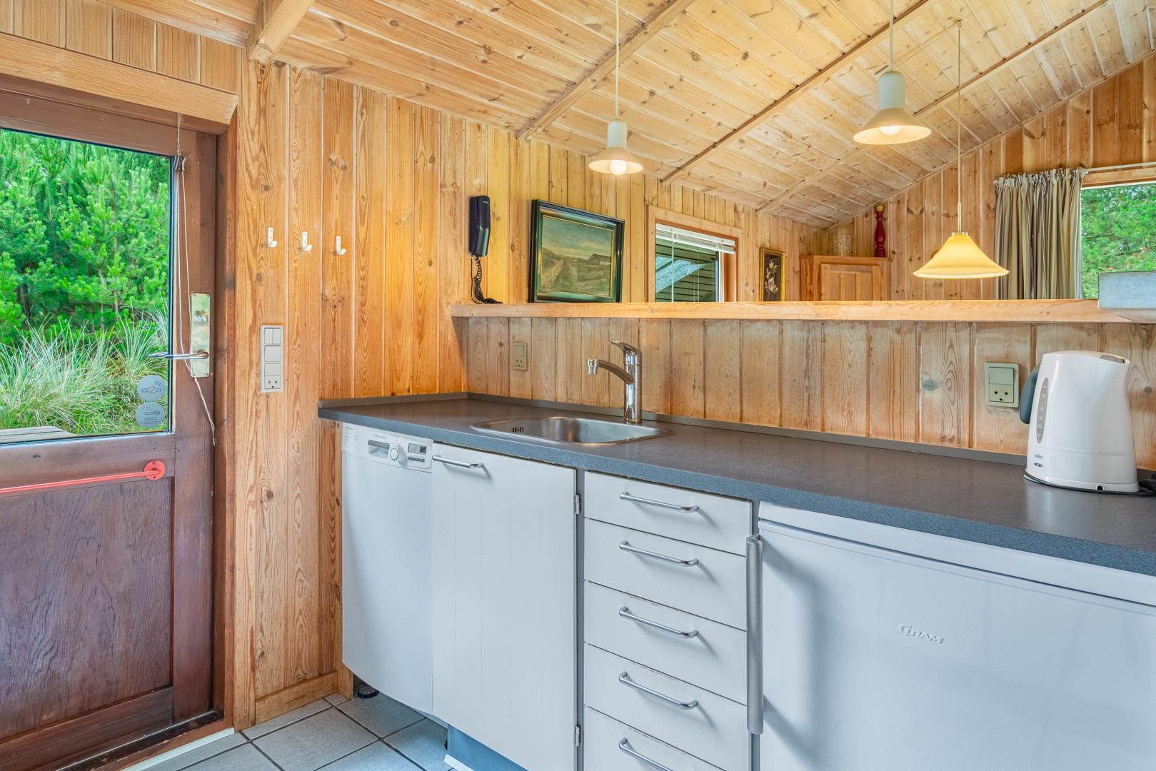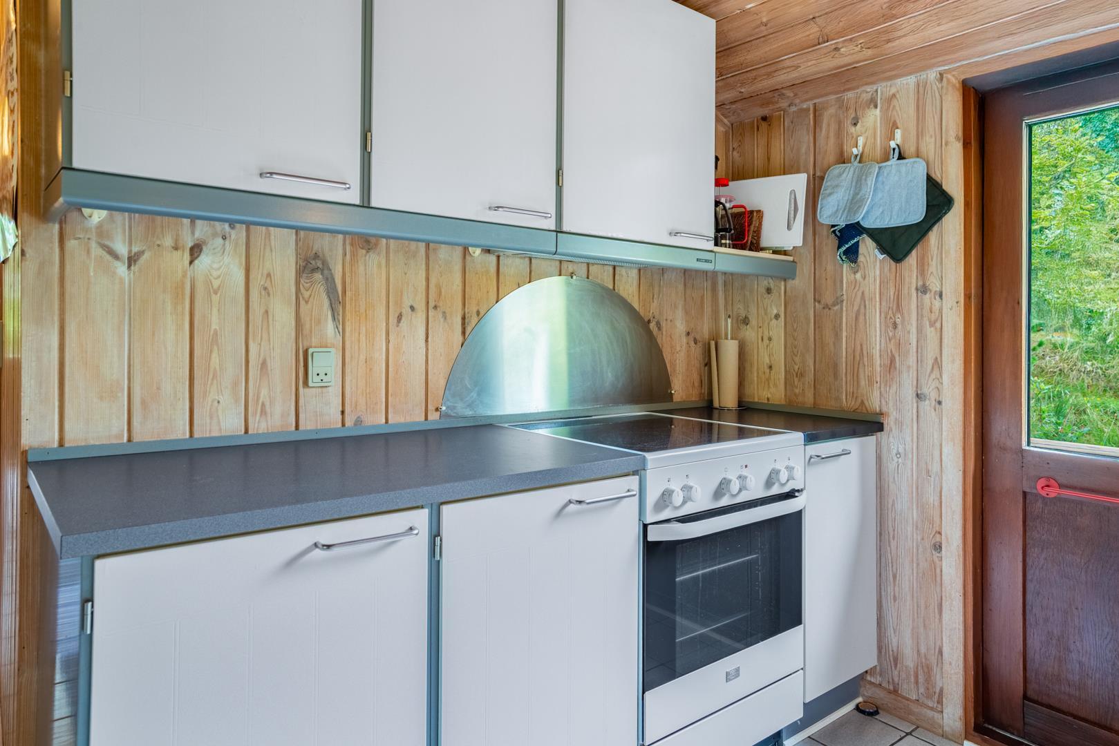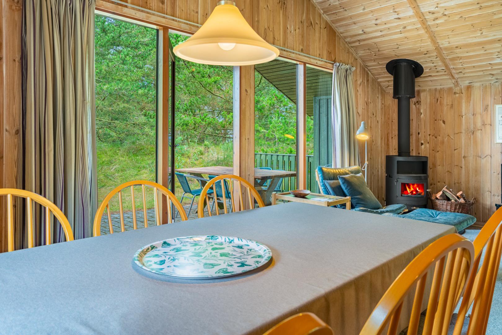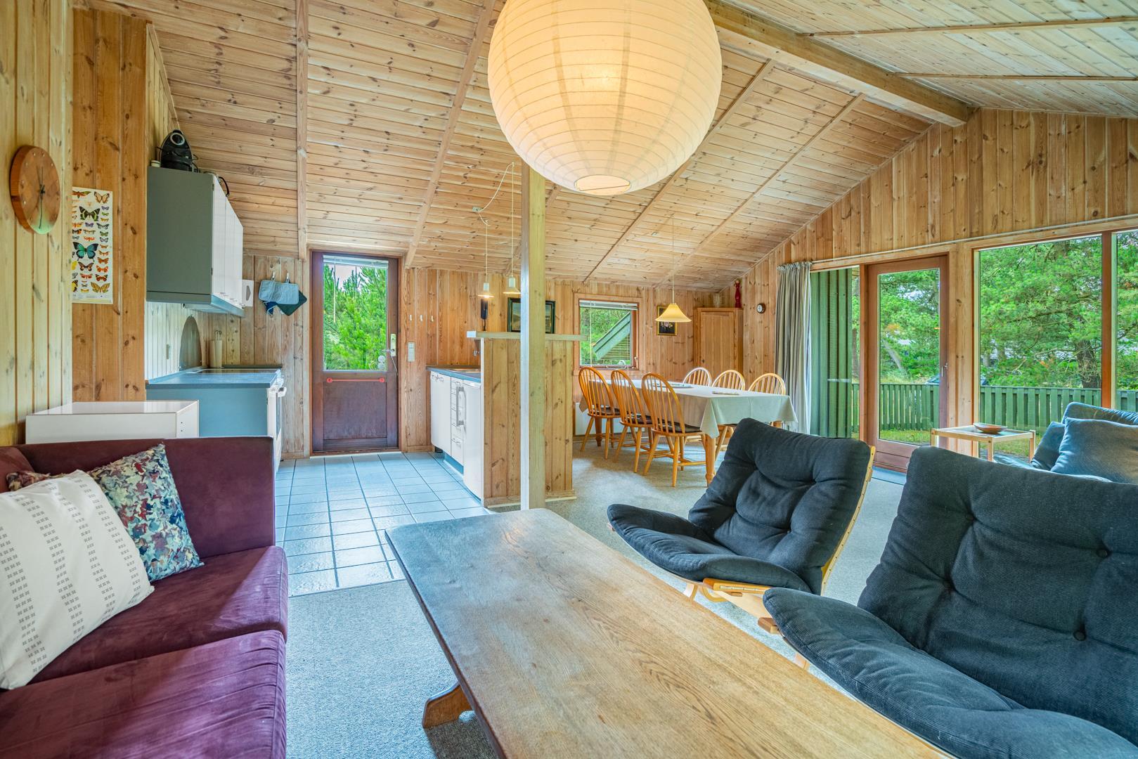Træhus beliggende på en stor, ugeneret lyngbeklædt naturgrund, omgivet af fyrretræer. Fra stuen med brændeovn er der udgang til delvis overdækket terrasse. Ved husets veludstyrede køkken, findes en lille morgen terrasse, hvor det er muligt at nyde morgenkaffen på de tidligere morgentimer.