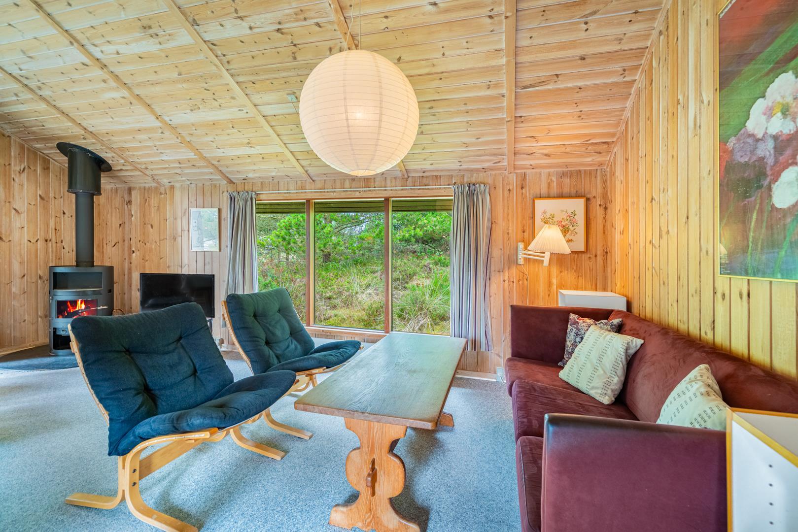 Hyggeligt træhus i Henne Strand med brændeovn og to terrasser på en stor, naturskøn grund tæt på stranden.