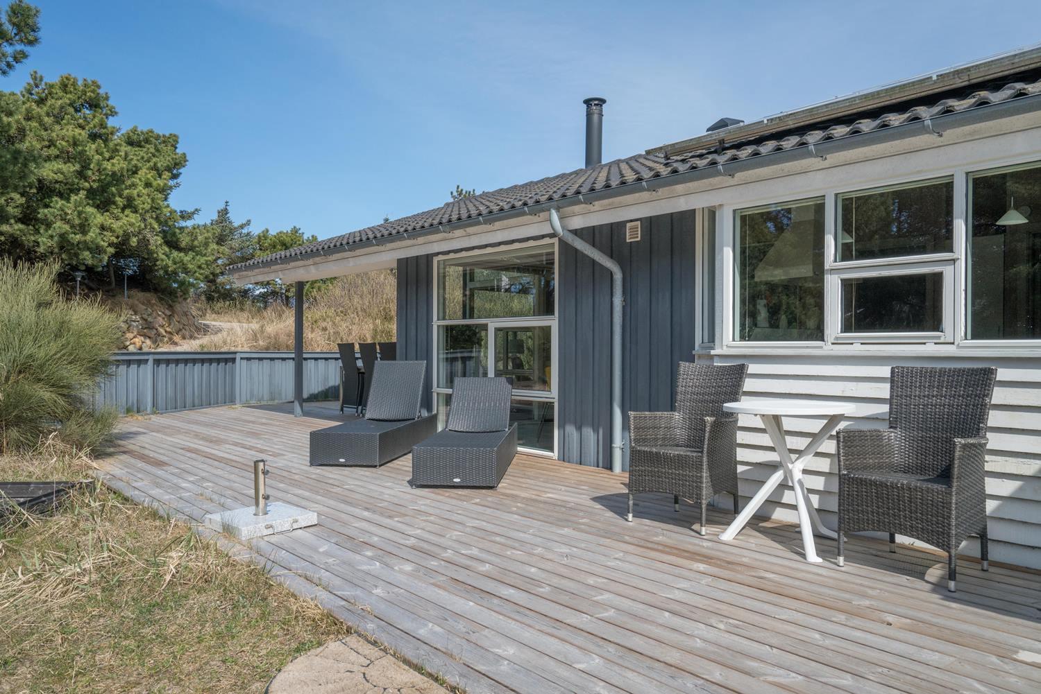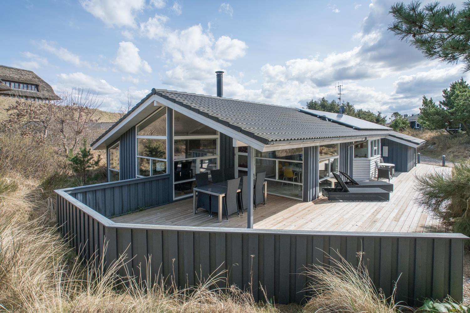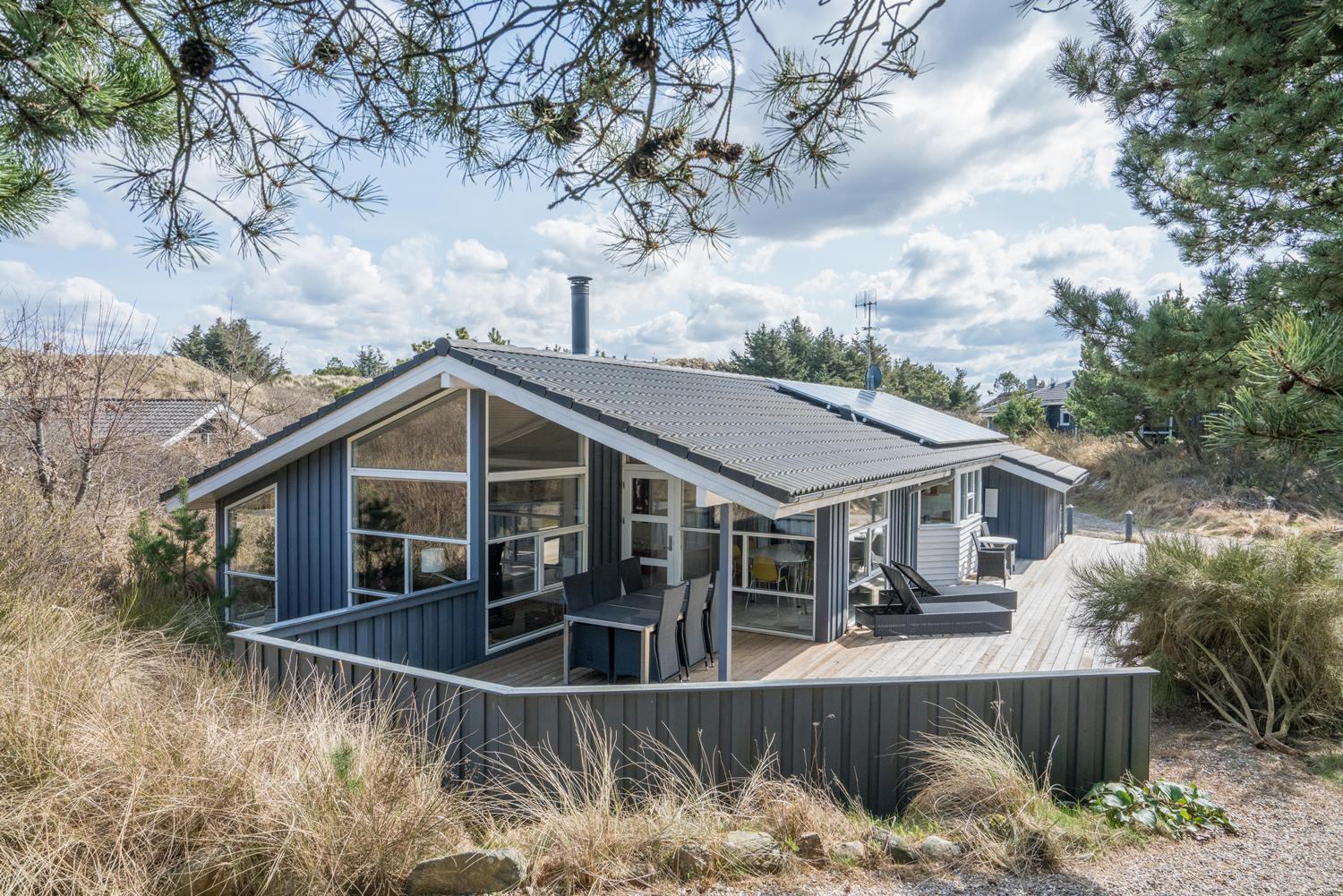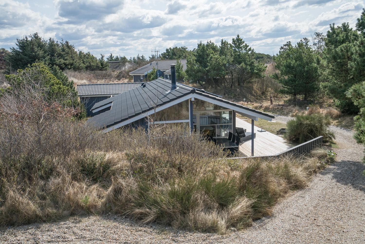 De grønne klitter med krogede fyrretræer og stensætninger skaber fred og ro både udenfor og inde bag de blåmalede facader på sommerhuset, så man får en oplevelse af idyl, samtidig med at det bestemt ikke skorter på moderne komfort. Huset er udstyret med kæmpestore glaspartier i de store opholdsrum, der lige som resten af huset har lofter til kip i lyst træ, der er med til at forstærke fornemmelsen albuerum, lys og luft.