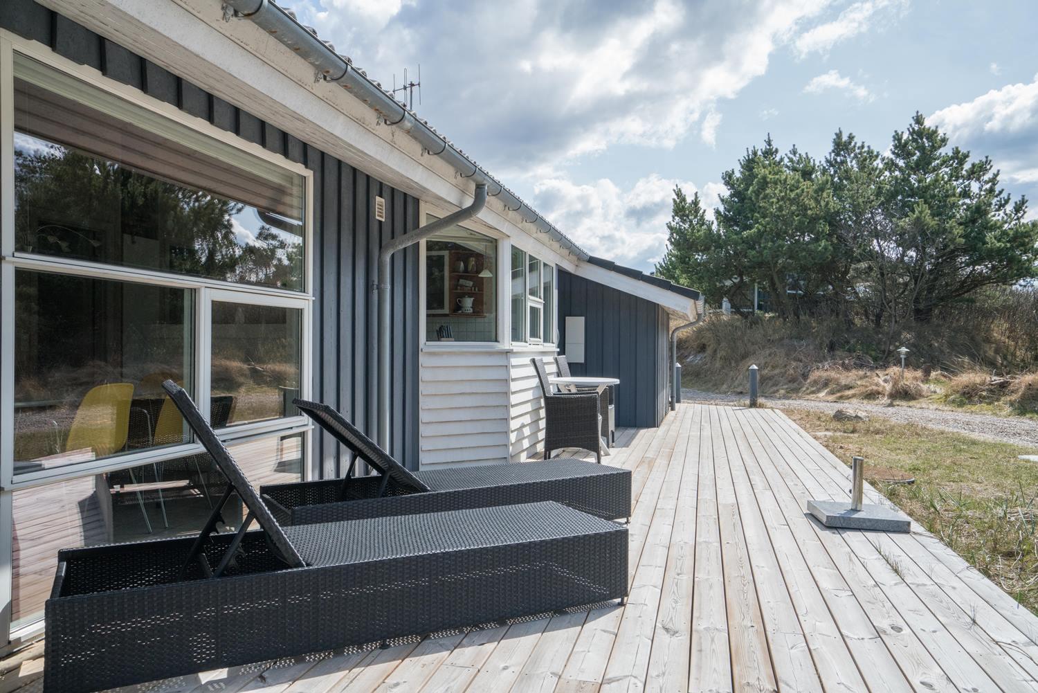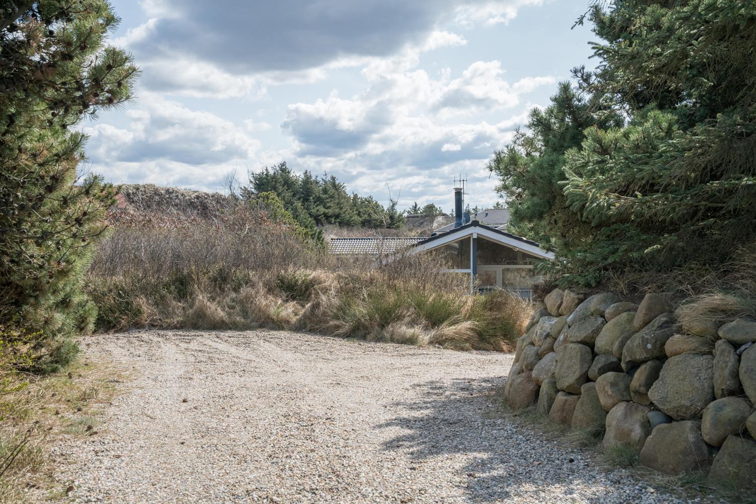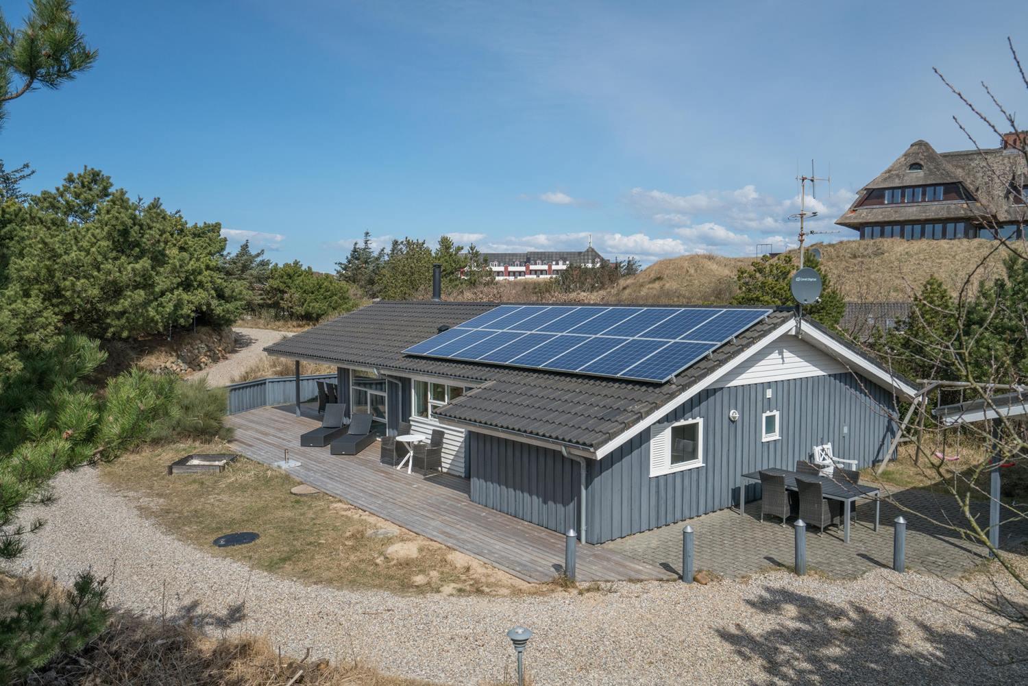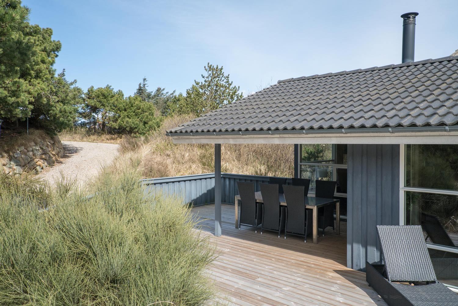 De grønne klitter med krogede fyrretræer og stensætninger skaber fred og ro både udenfor og inde bag de blåmalede facader på sommerhuset, så man får en oplevelse af idyl, samtidig med at det bestemt ikke skorter på moderne komfort. Huset er udstyret med kæmpestore glaspartier i de store opholdsrum, der lige som resten af huset har lofter til kip i lyst træ, der er med til at forstærke fornemmelsen albuerum, lys og luft.