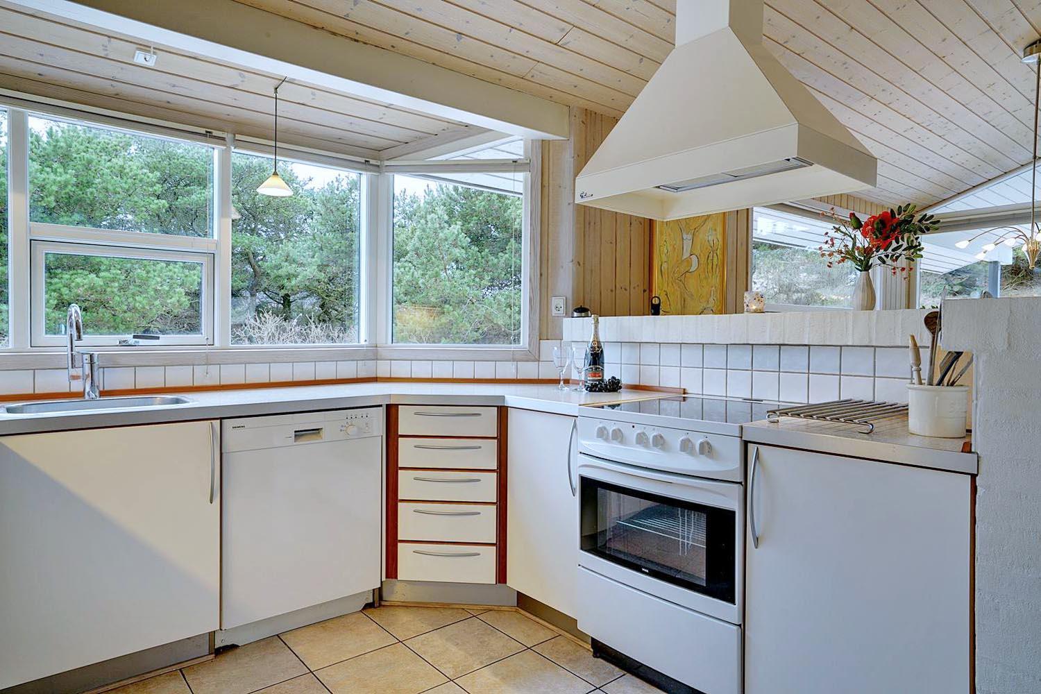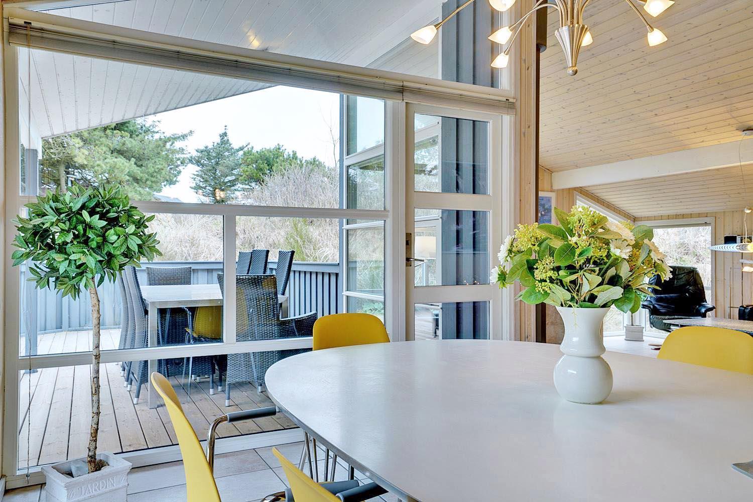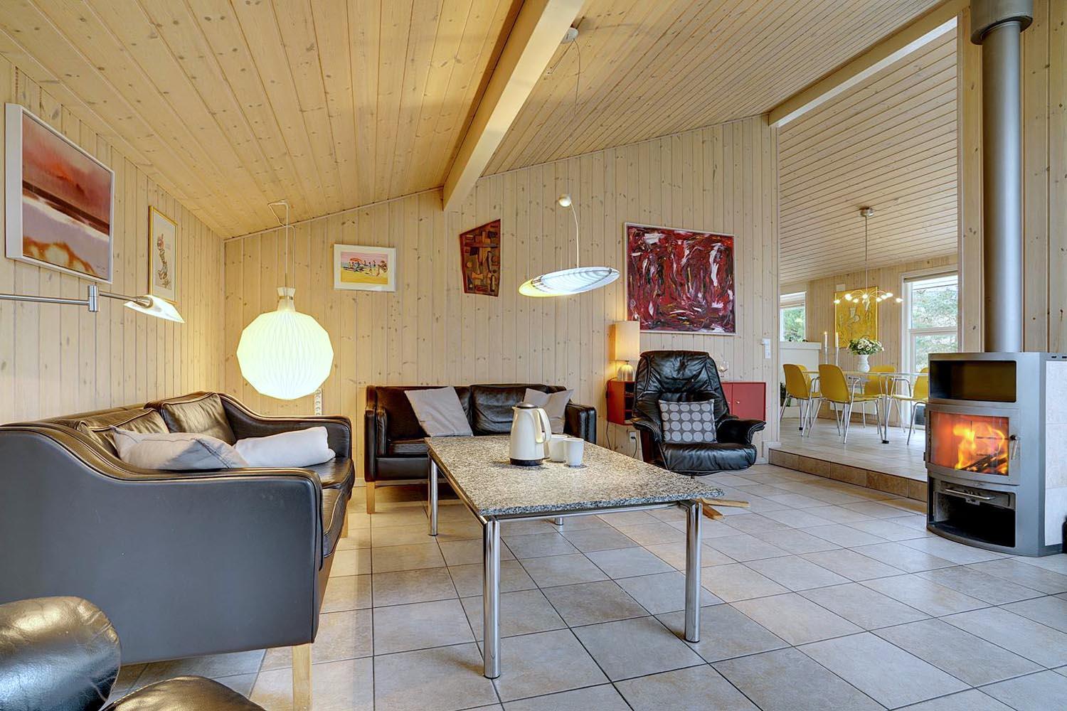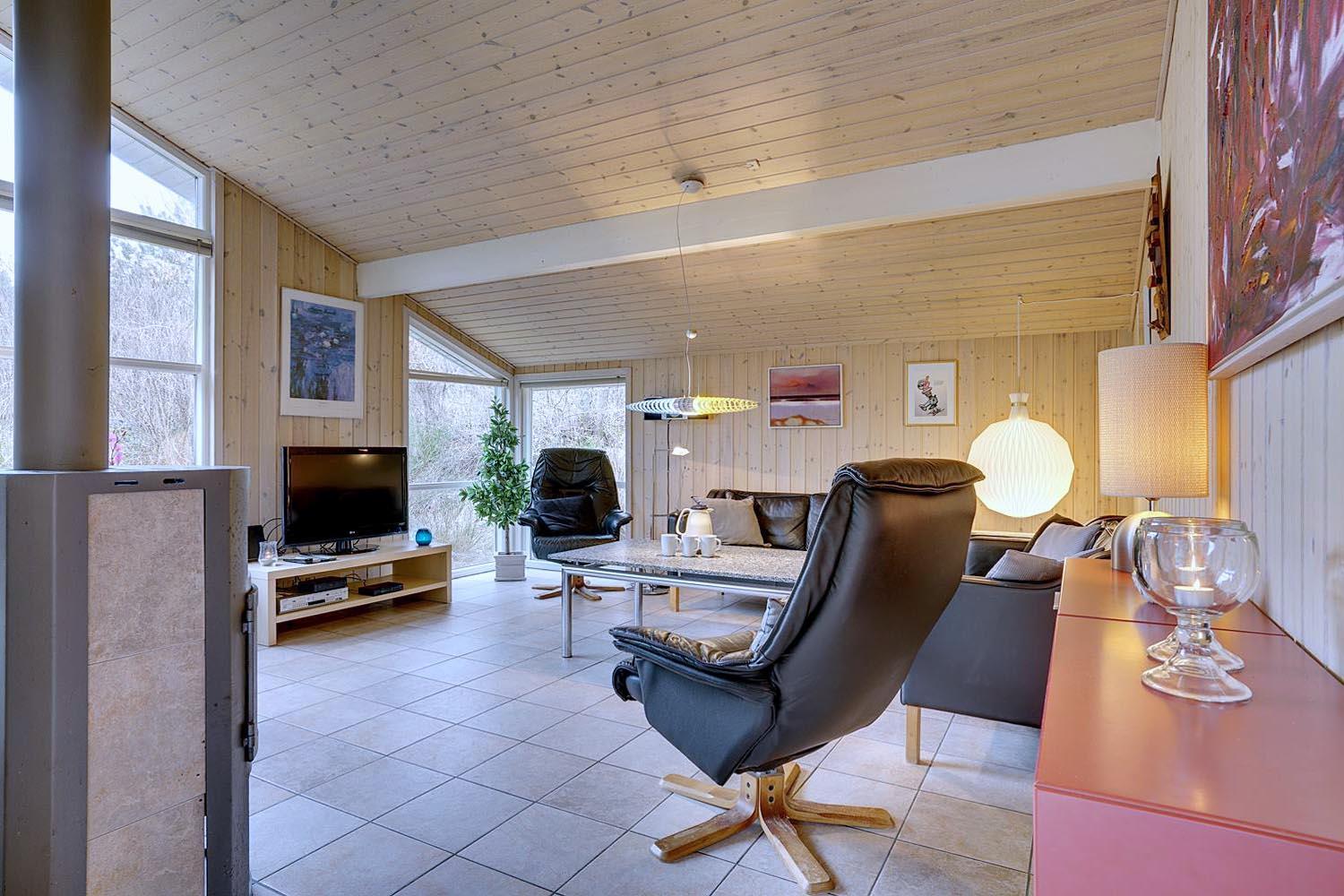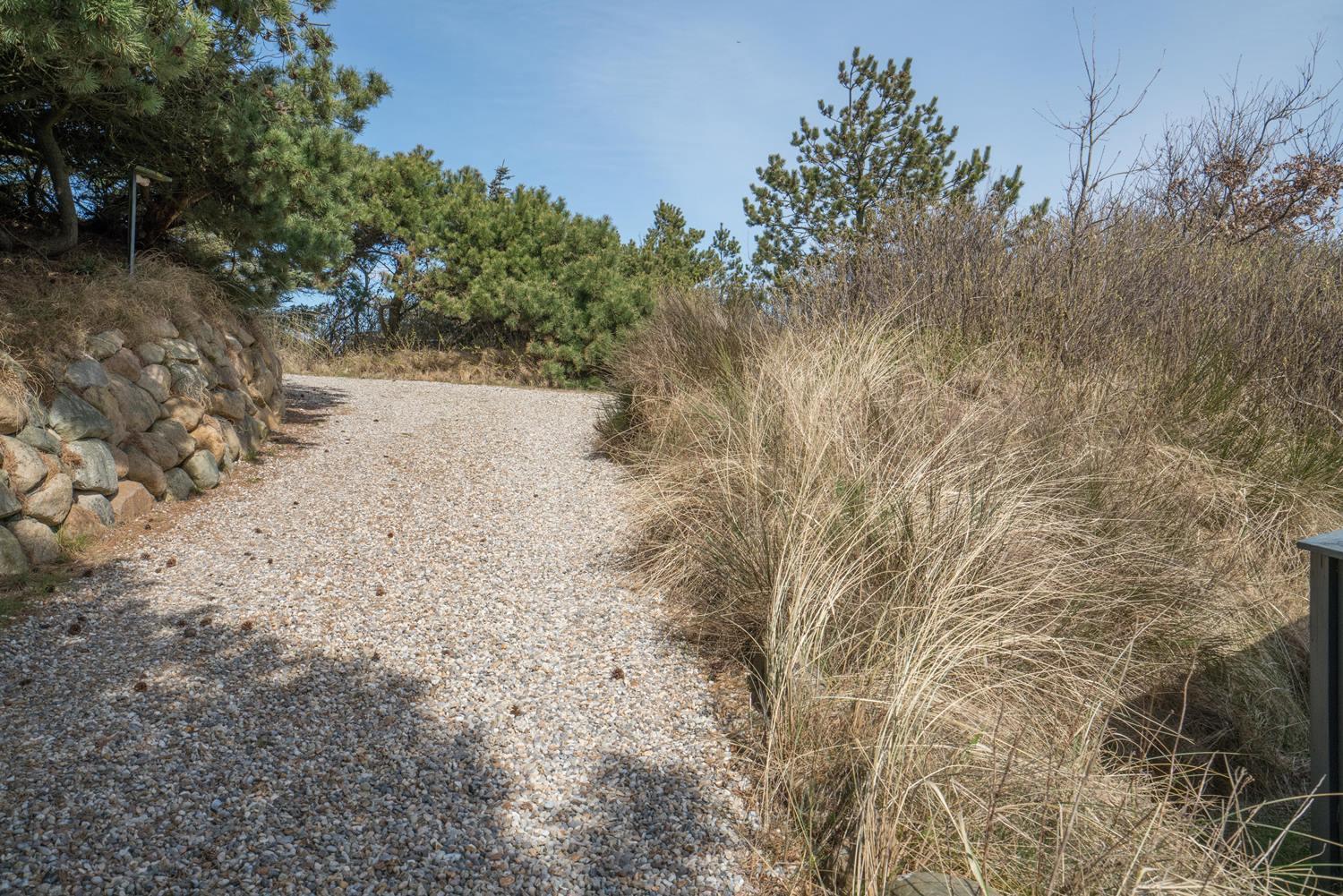 De grønne klitter med krogede fyrretræer og stensætninger skaber fred og ro både udenfor og inde bag de blåmalede facader på sommerhuset, så man får en oplevelse af idyl, samtidig med at det bestemt ikke skorter på moderne komfort. Huset er udstyret med kæmpestore glaspartier i de store opholdsrum, der lige som resten af huset har lofter til kip i lyst træ, der er med til at forstærke fornemmelsen albuerum, lys og luft.