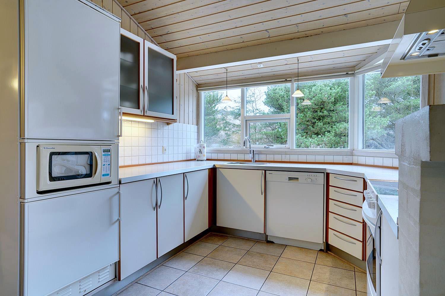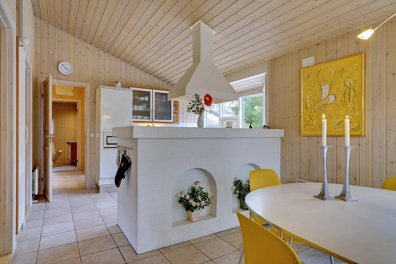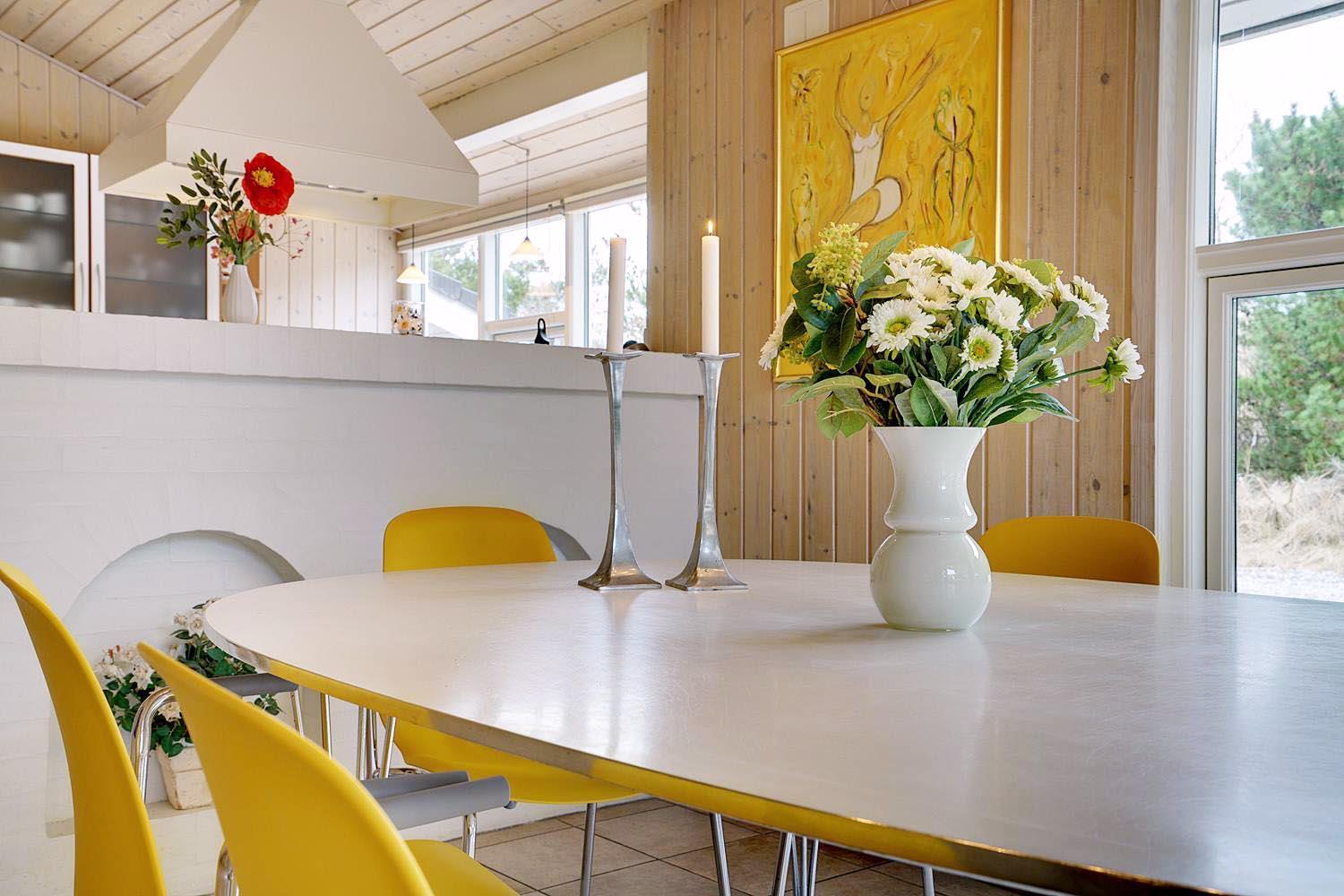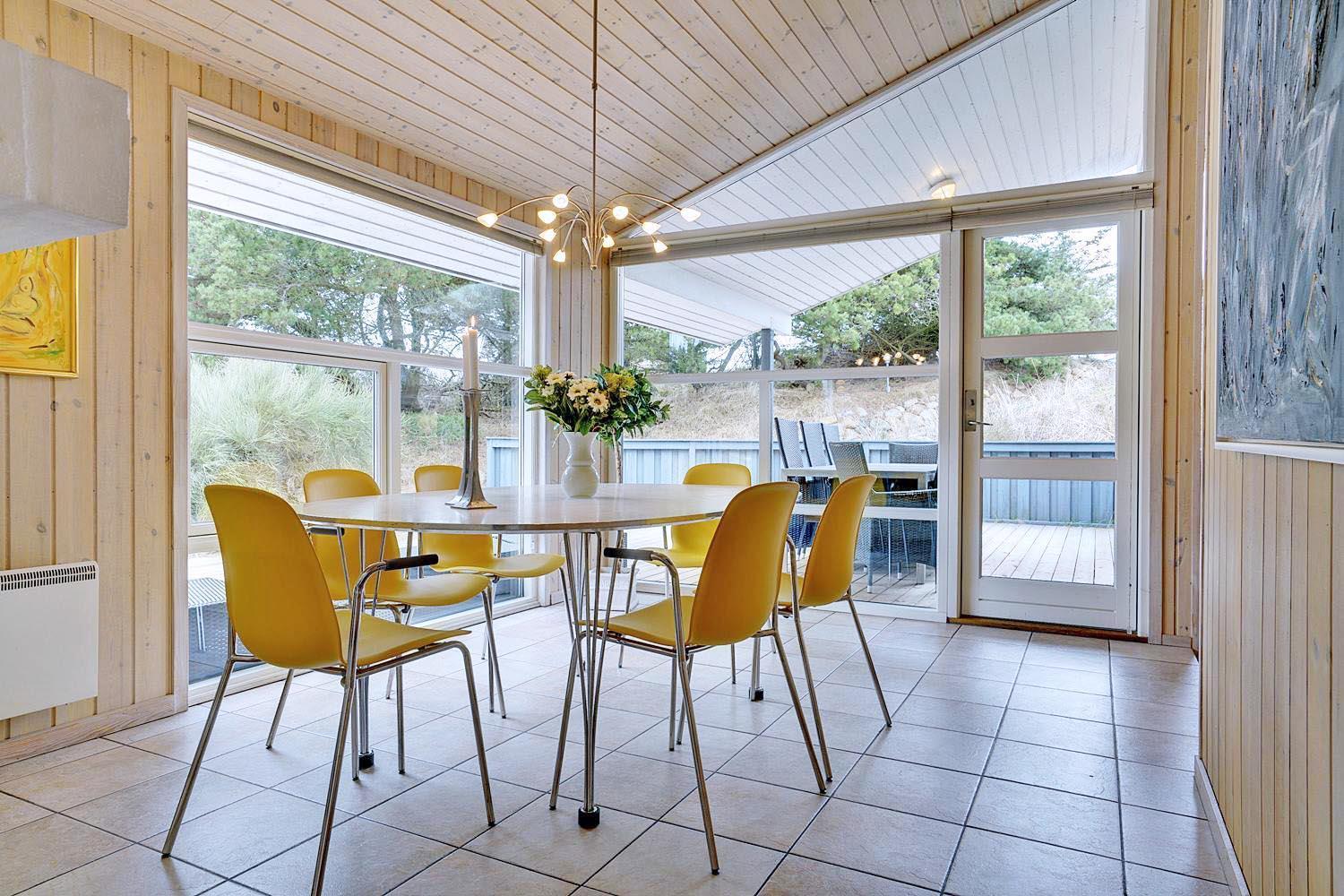 De grønne klitter med krogede fyrretræer og stensætninger skaber fred og ro både udenfor og inde bag de blåmalede facader på sommerhuset, så man får en oplevelse af idyl, samtidig med at det bestemt ikke skorter på moderne komfort. Huset er udstyret med kæmpestore glaspartier i de store opholdsrum, der lige som resten af huset har lofter til kip i lyst træ, der er med til at forstærke fornemmelsen albuerum, lys og luft.