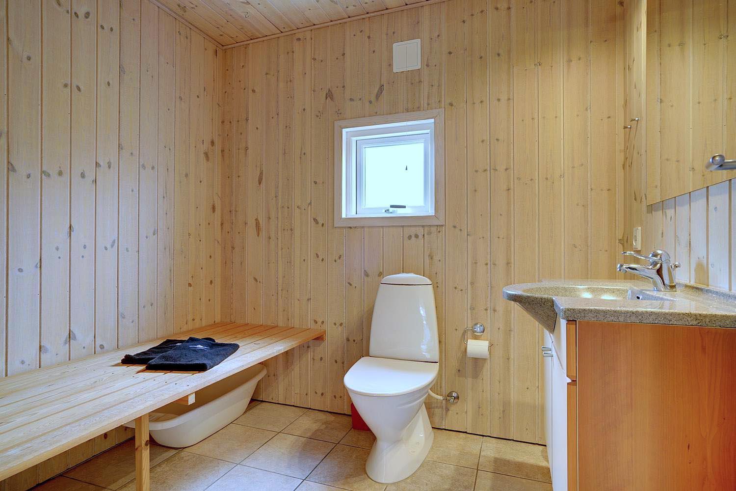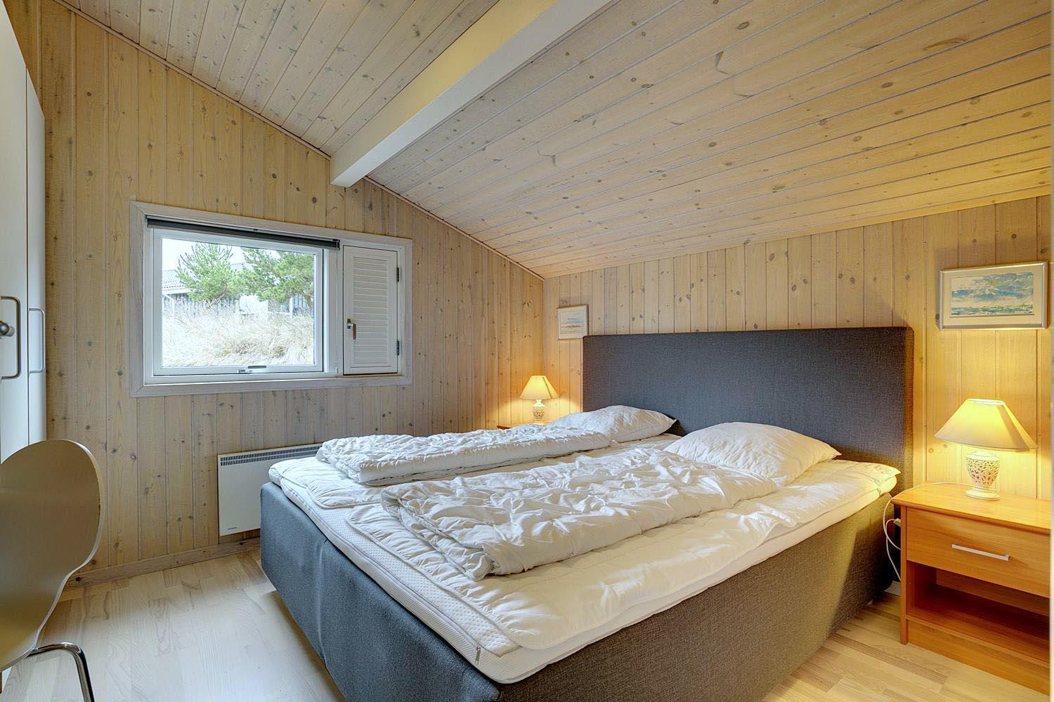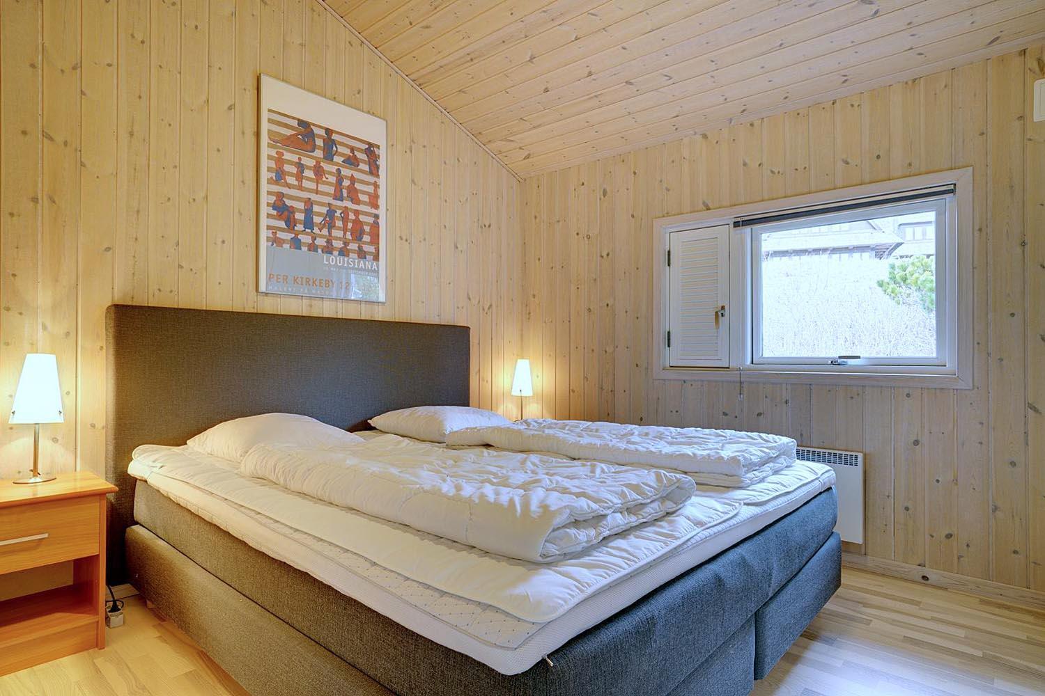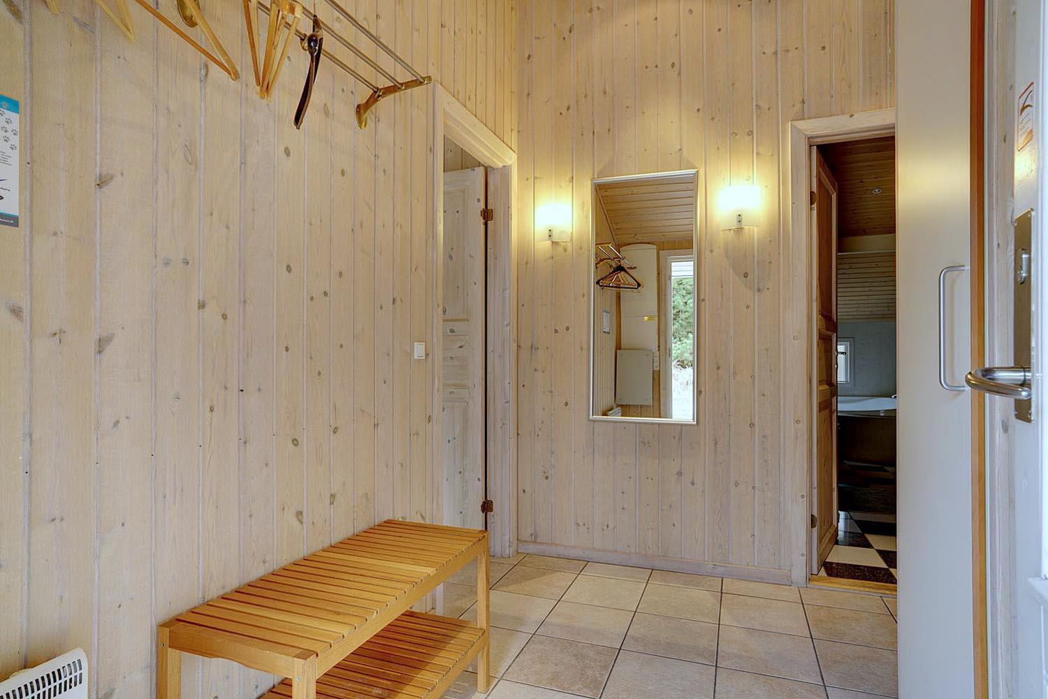 Foruden opholdsrummene, som består af køkken og stue, er der tre soveværelser, som alle er udstyret med dobbeltsenge, og endelig er der toilet og et stort, lækkert spabadeværelse med sauna og vaskesøjle.