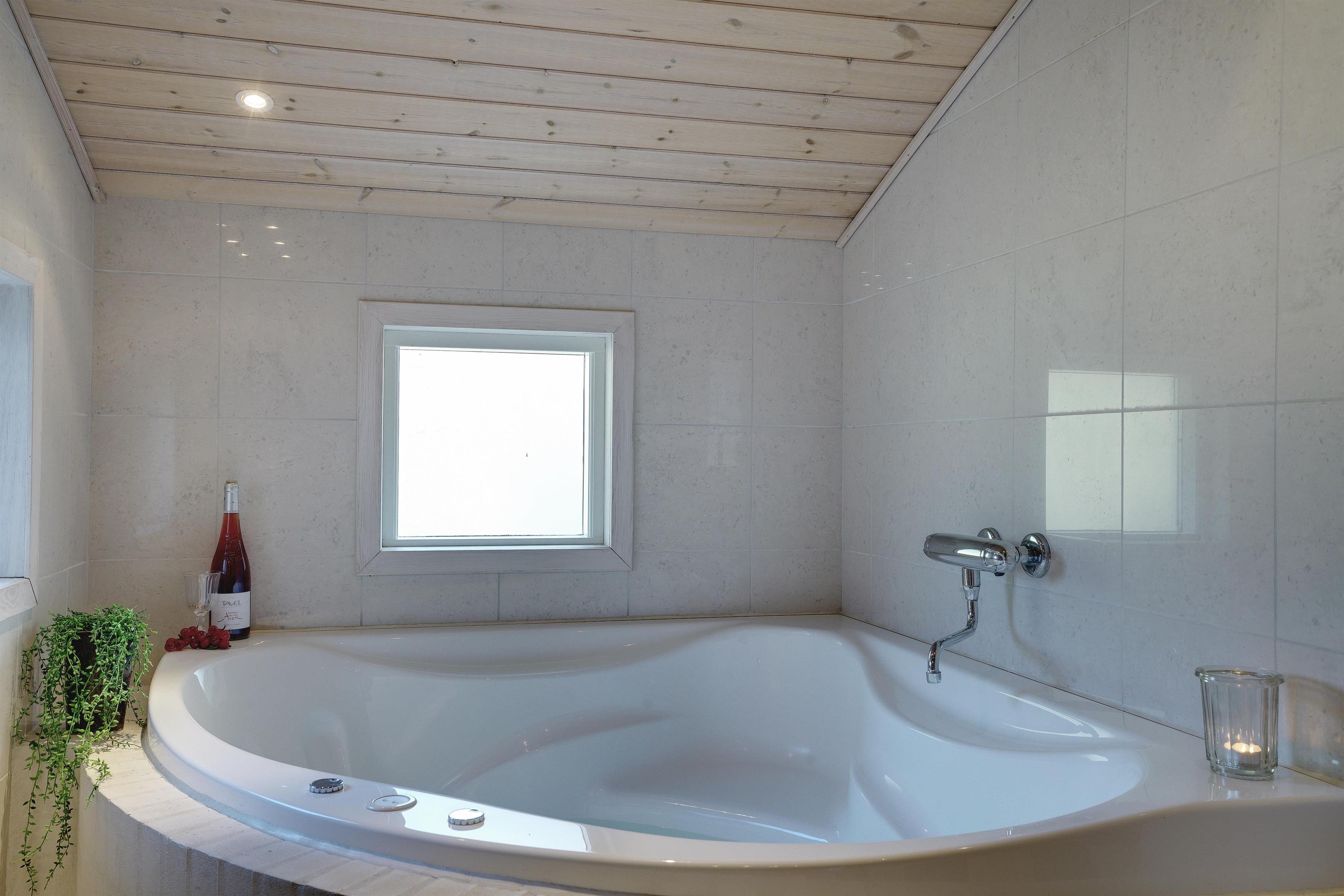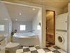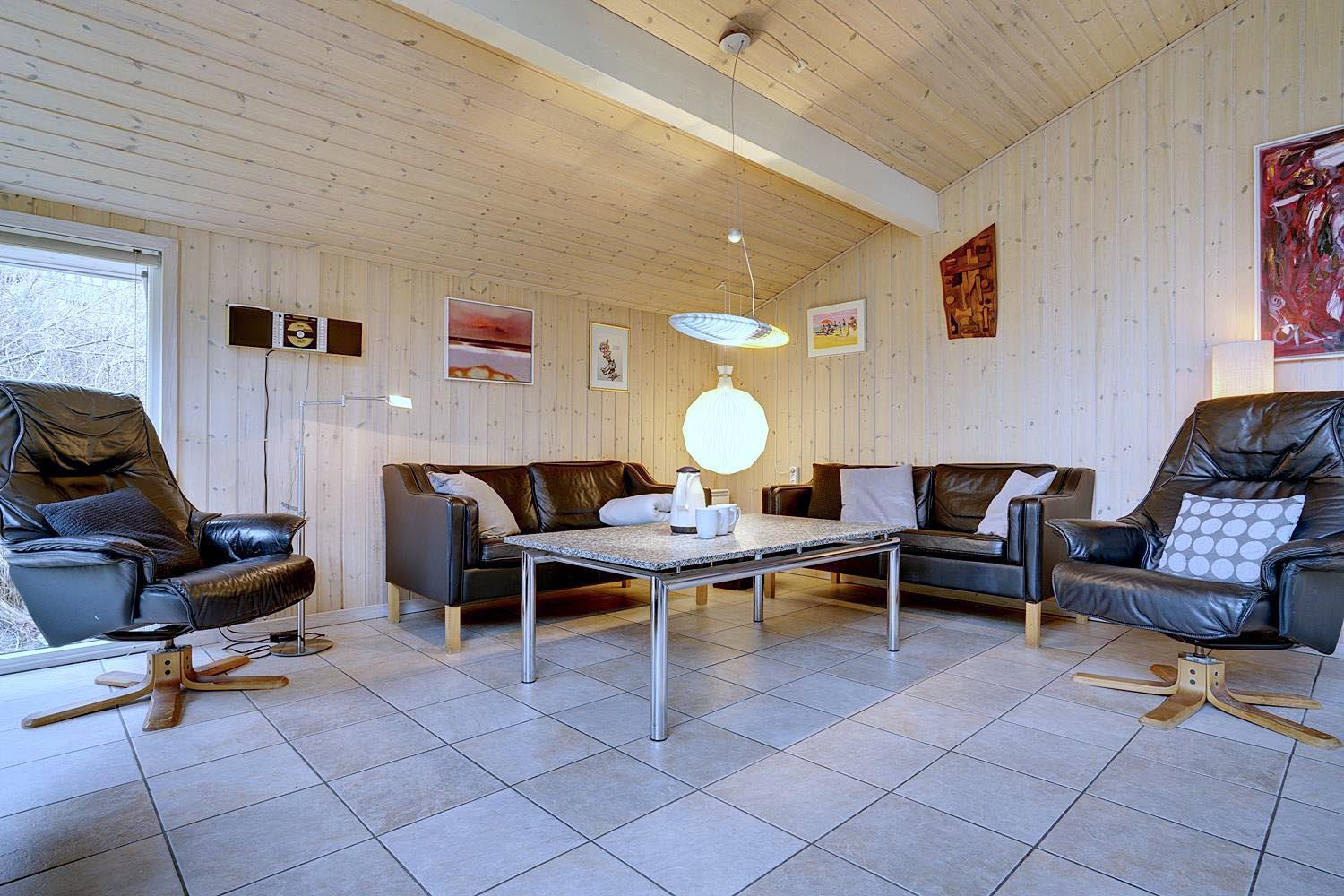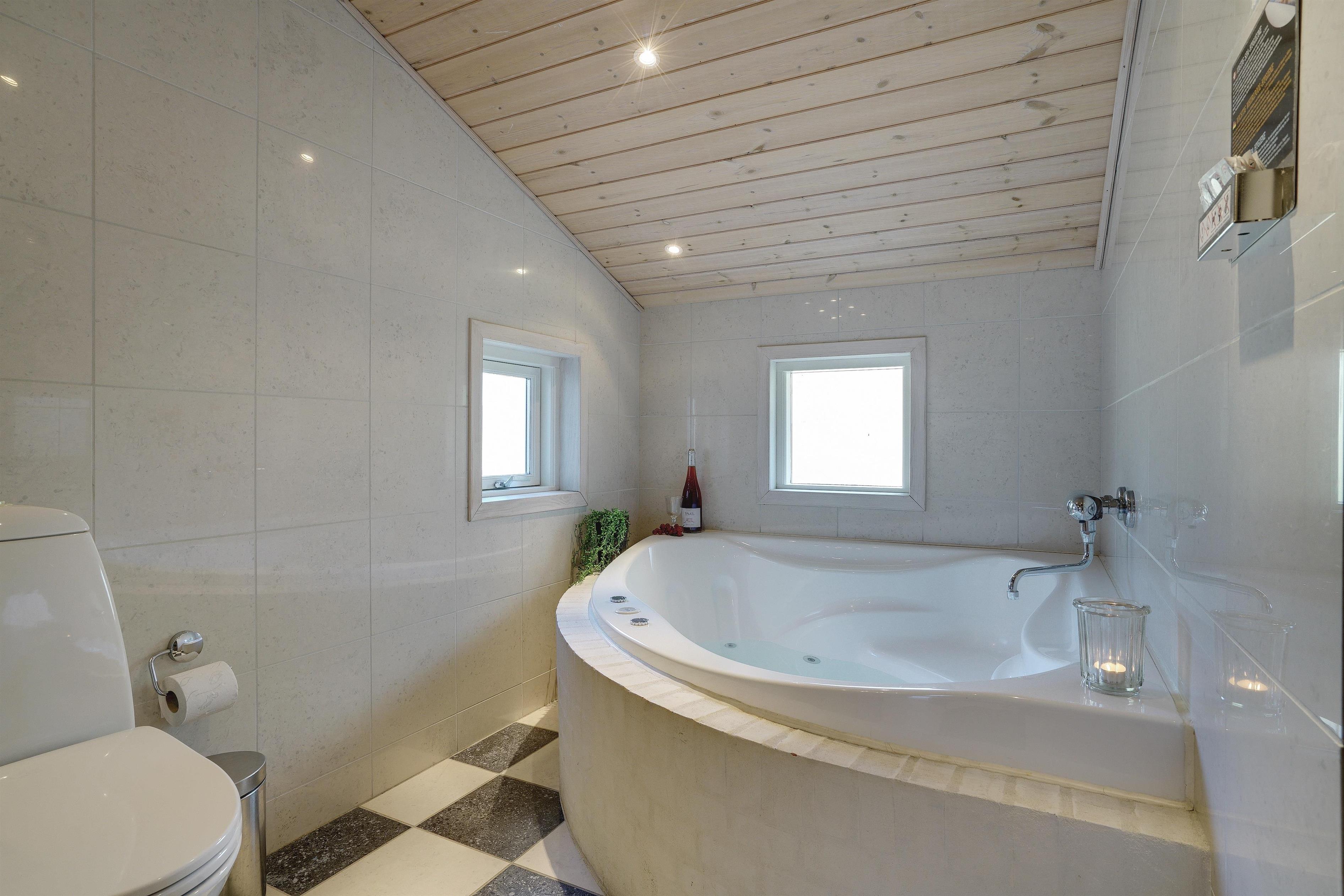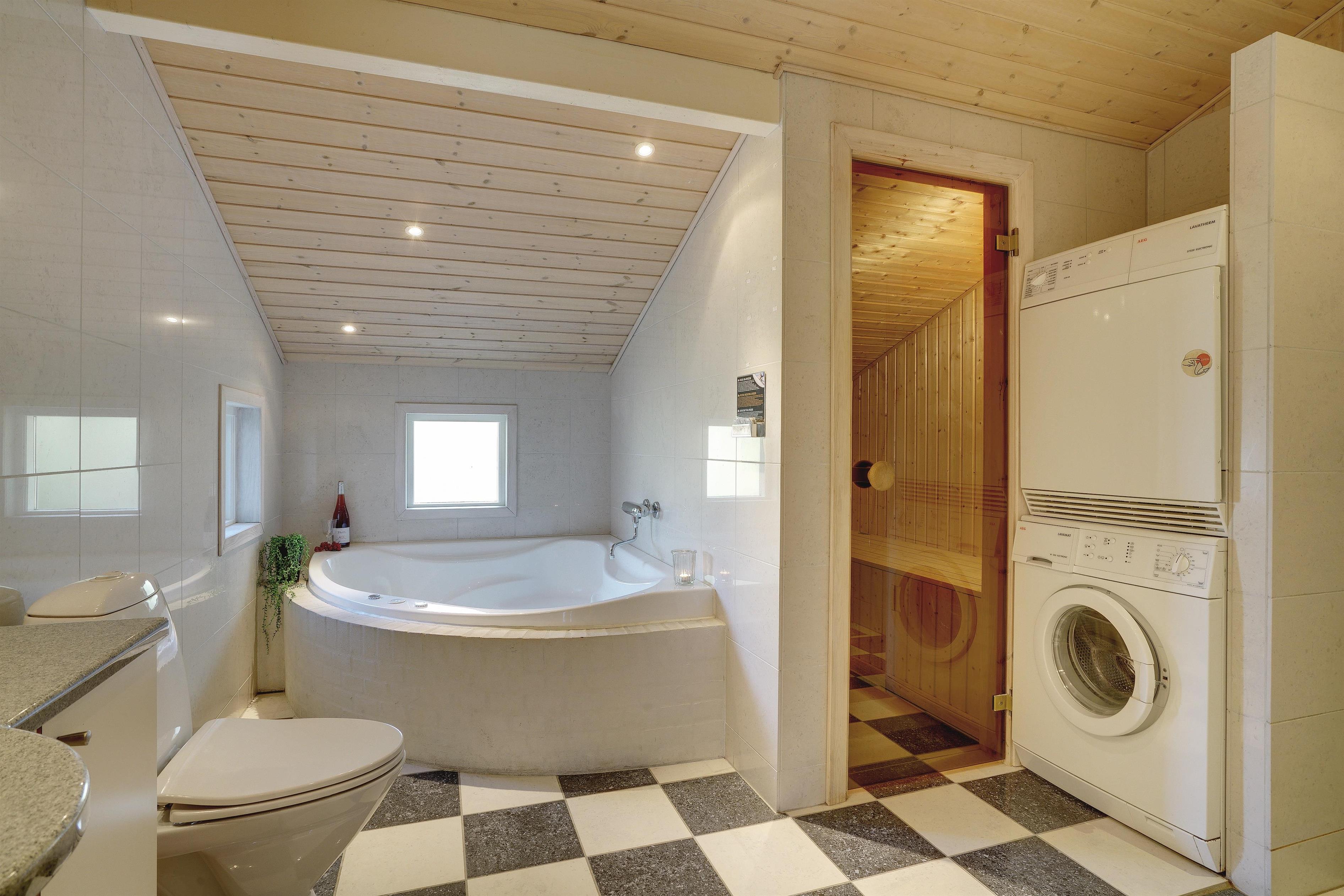 Foruden opholdsrummene, som består af køkken og stue, er der tre soveværelser, som alle er udstyret med dobbeltsenge, og endelig er der toilet og et stort, lækkert spabadeværelse med sauna og vaskesøjle.